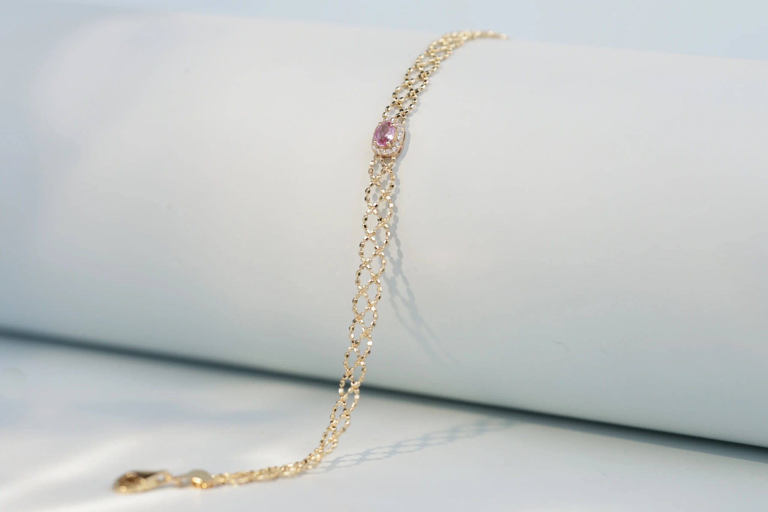 Браслет из золота с 16 бриллиантами в огранке «круглая» весом 0,04 карат, цвет 4, чистота 5; 1 розовым сапфиром весом 0,19 карат.