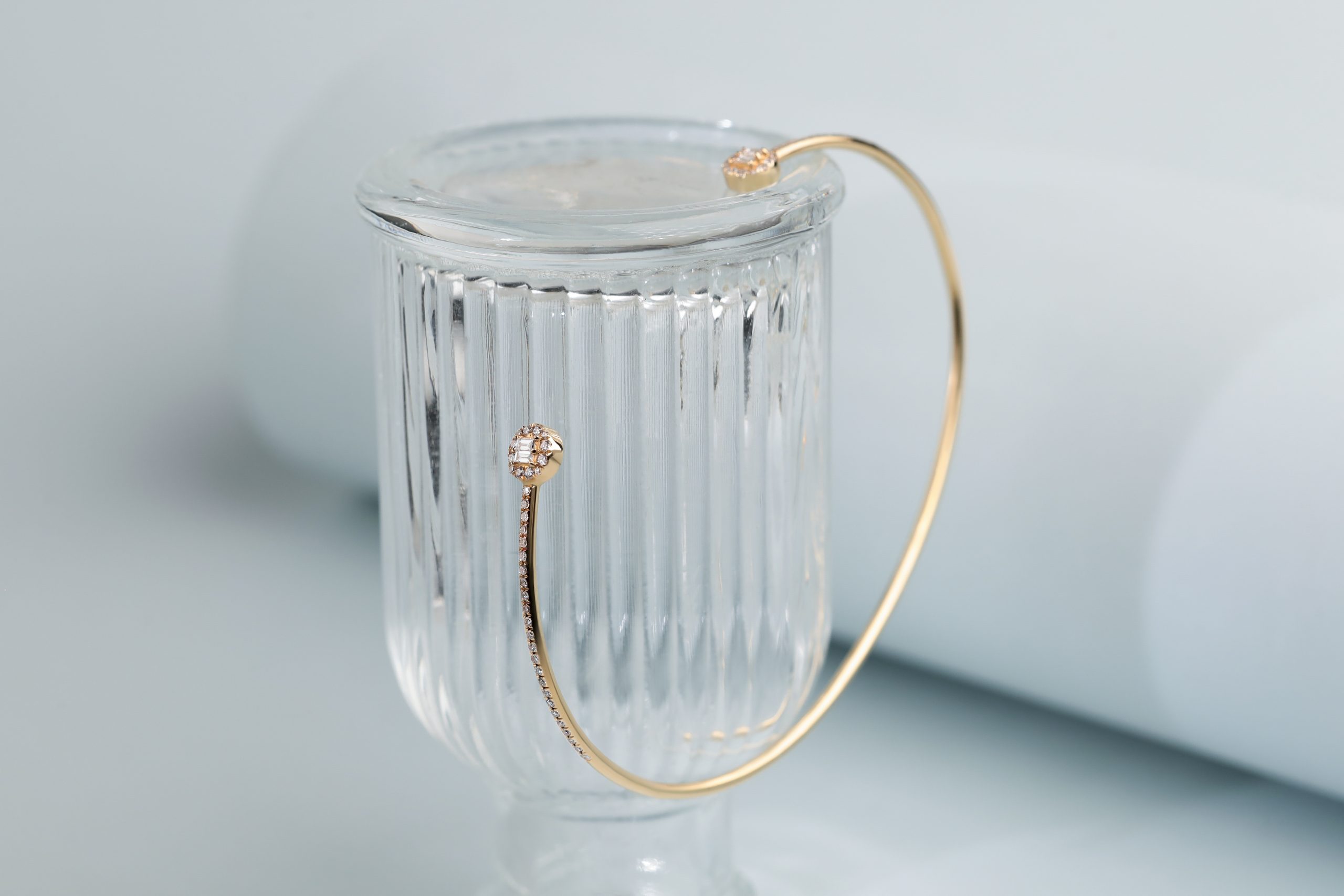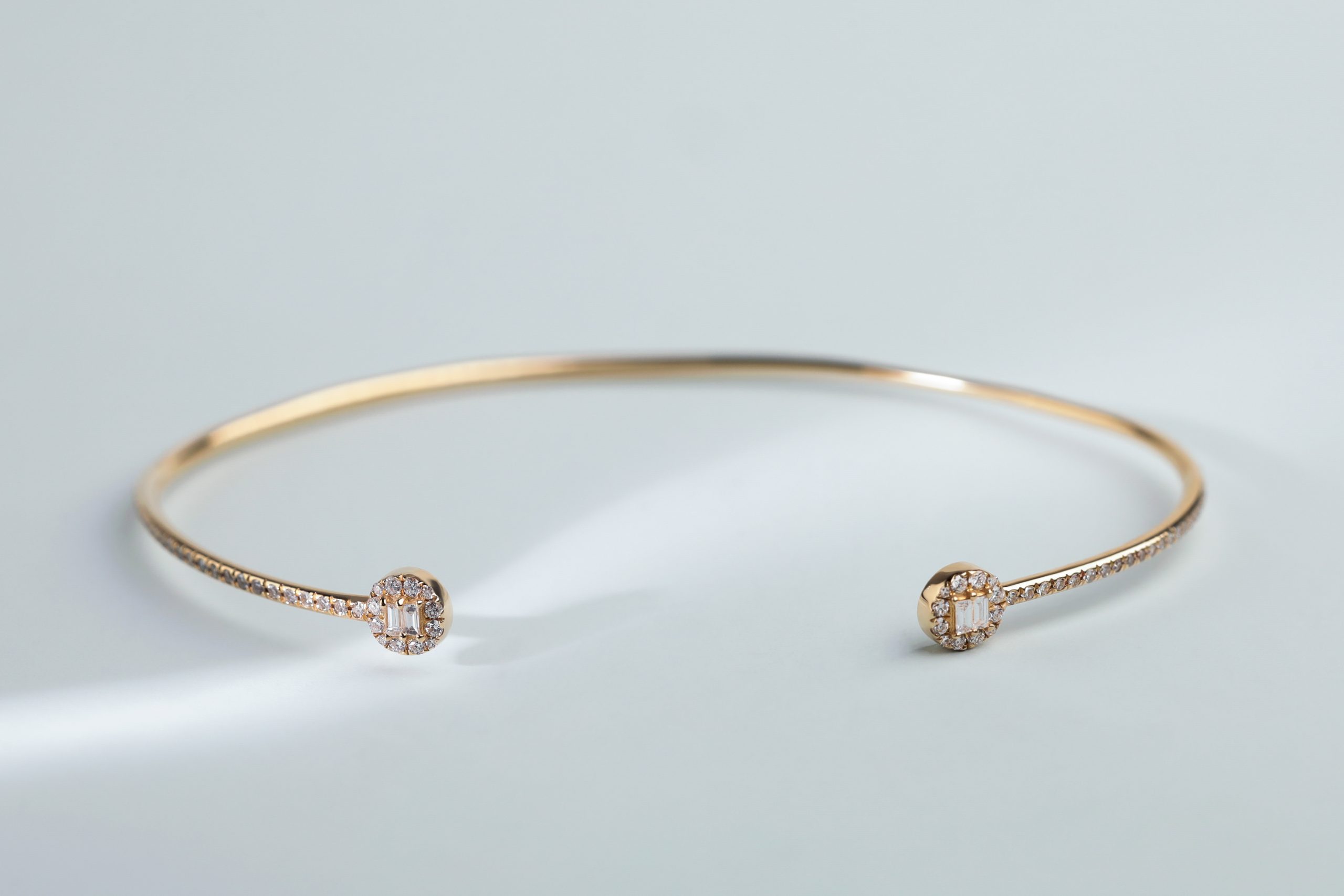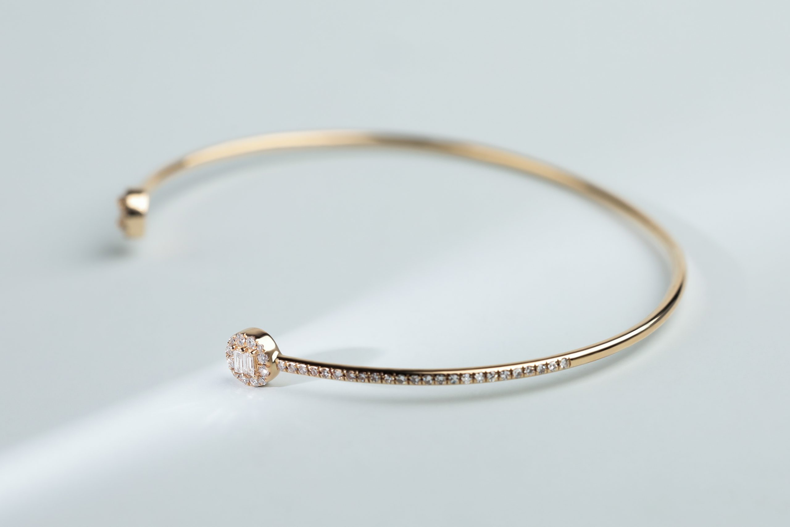 Браслет из золота с 4 бриллиантами в огранке «багет» весом 0,07 карат, цвет 4, чистота 5; 72 бриллиантами в огранке «круглая» весом 0,25 карат, цвет 3, чистота 5.