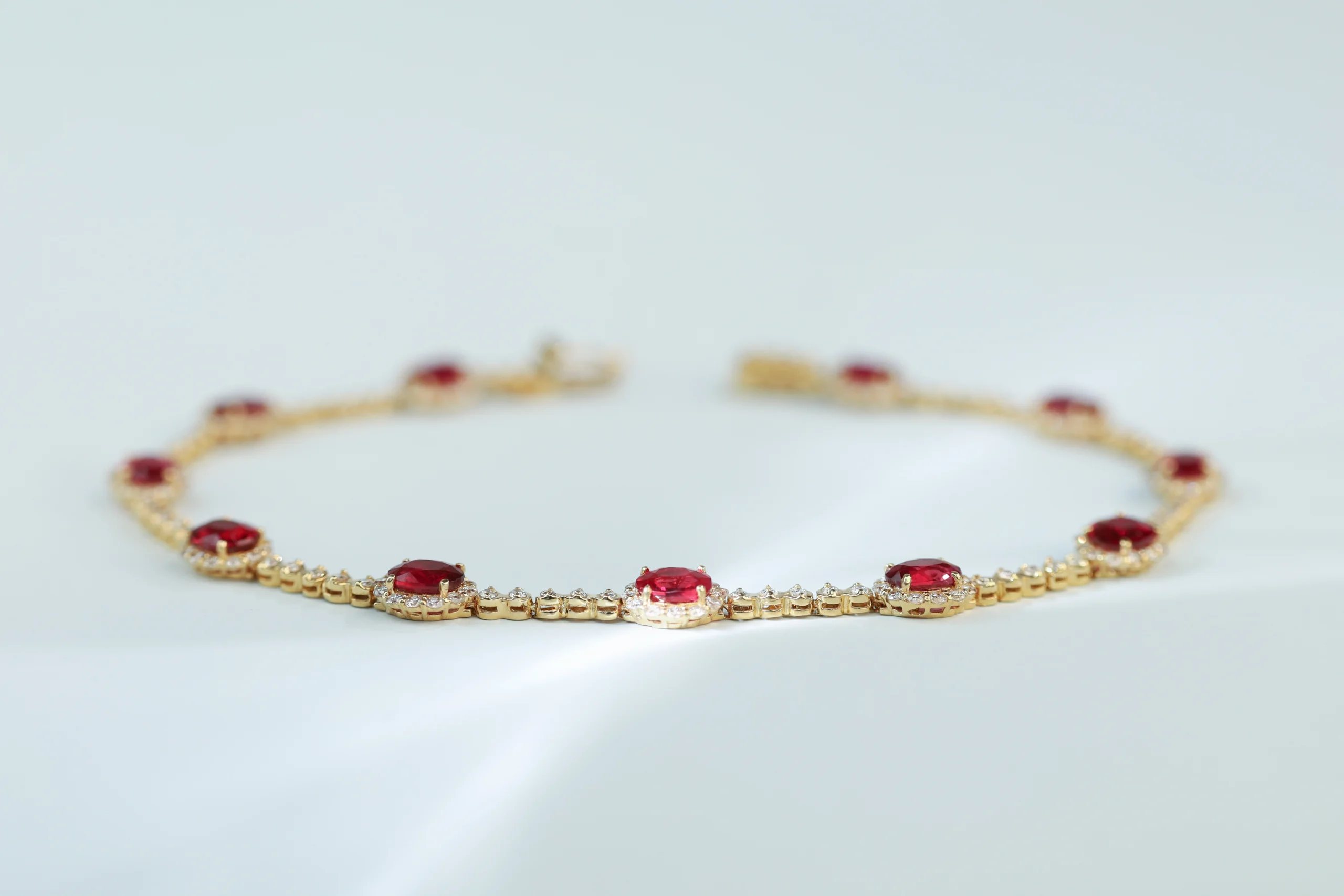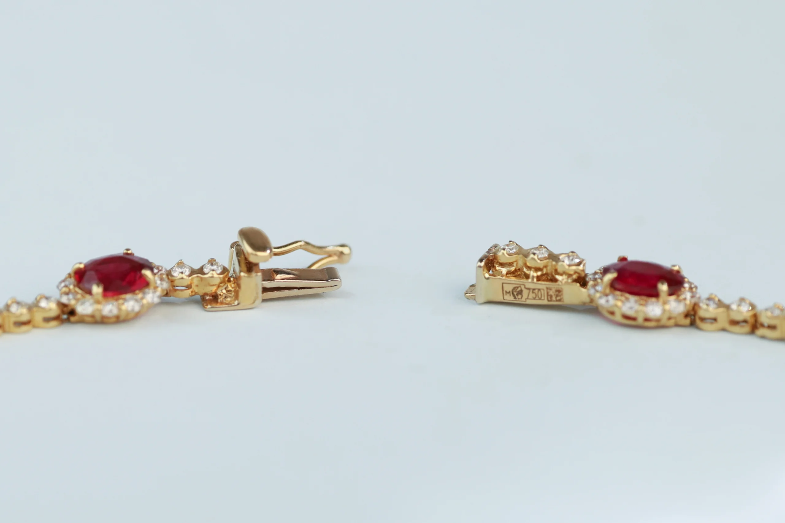 Браслет из золота с 11 рубинами весом 3,24 карат, цвет 2, чистота 2; 187 бриллиантами в огранке «круглая» весом 0,88 карат, цвет 3, чистота 4.