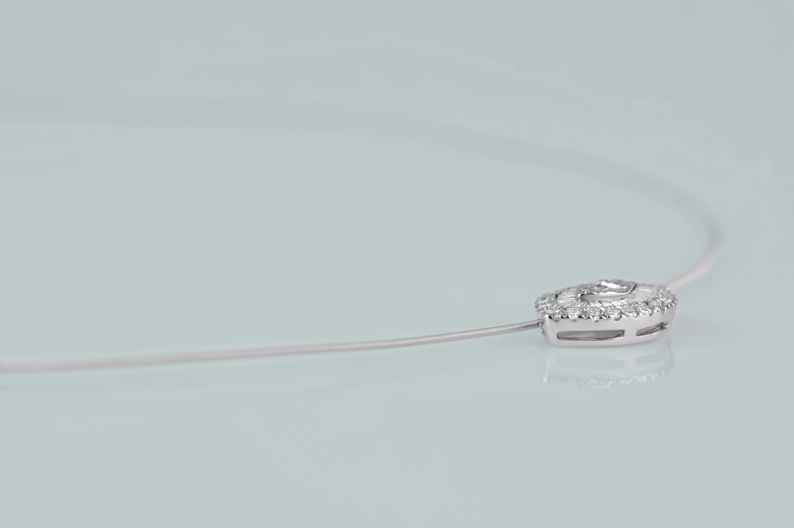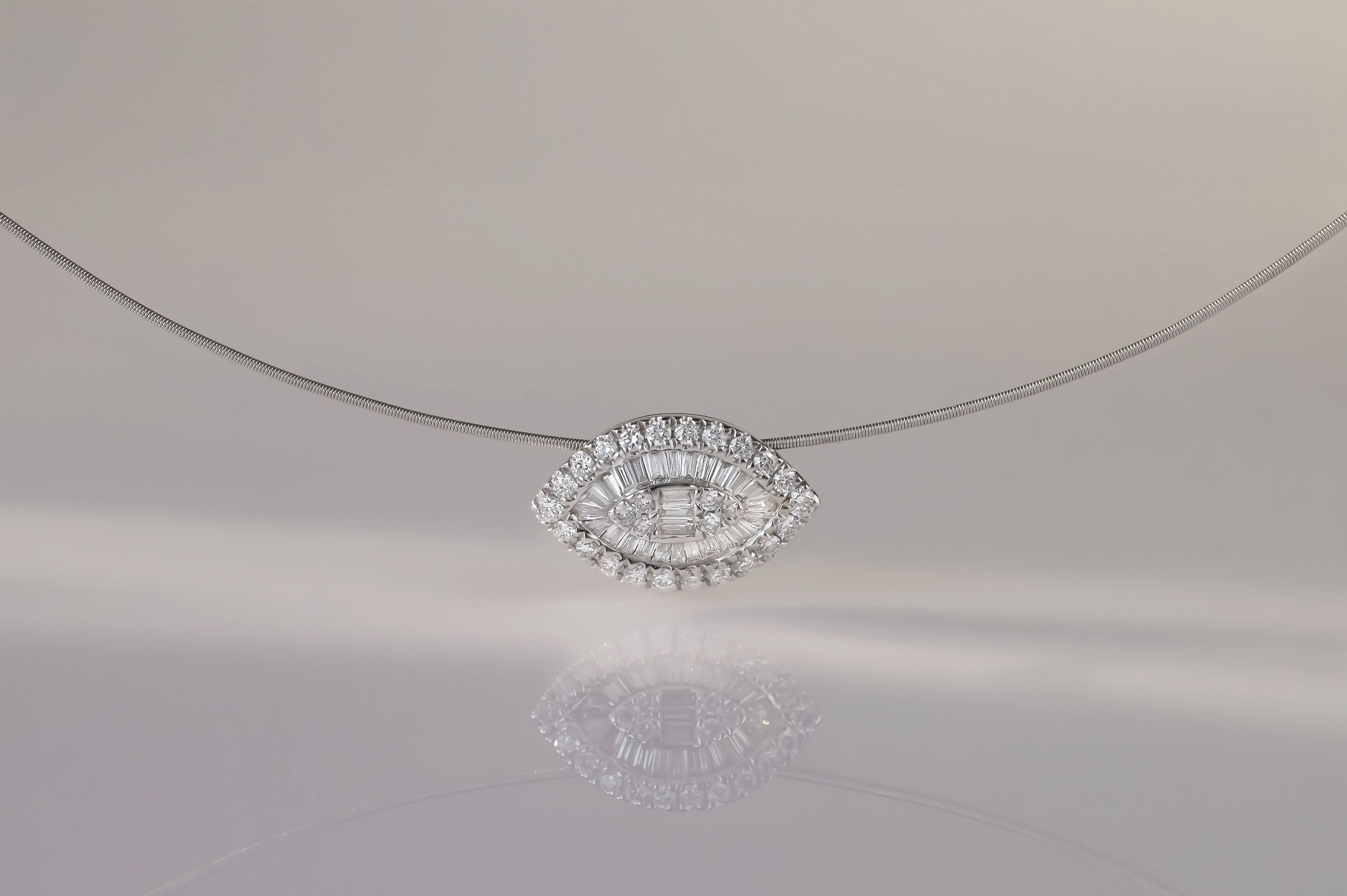 Чокер из золота с 32 бриллиантами в огранке «багет» весом 0,15 карат, цвет 4, чистота 5; 28 бриллиантами в огранке «круглая» весом 0,15 карат, цвет 4, чистота 5.