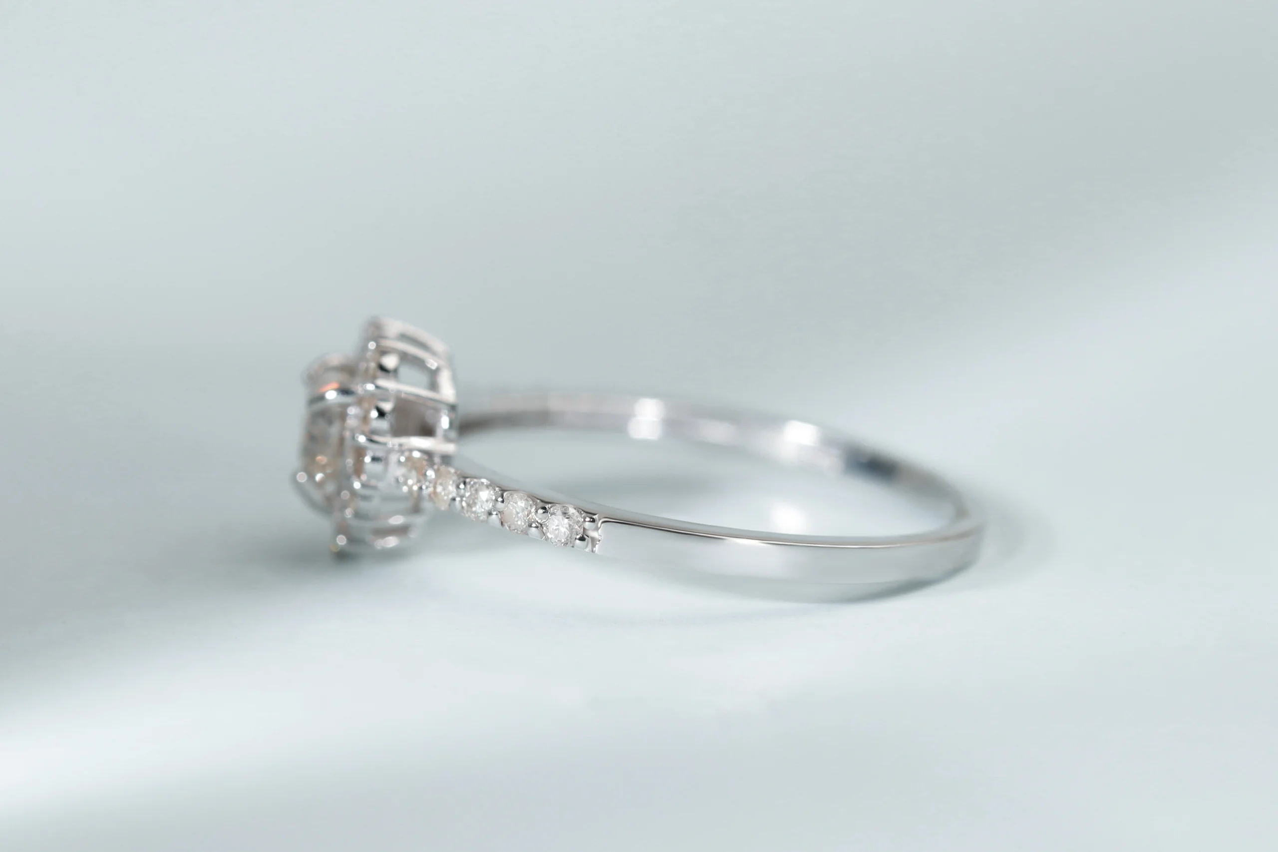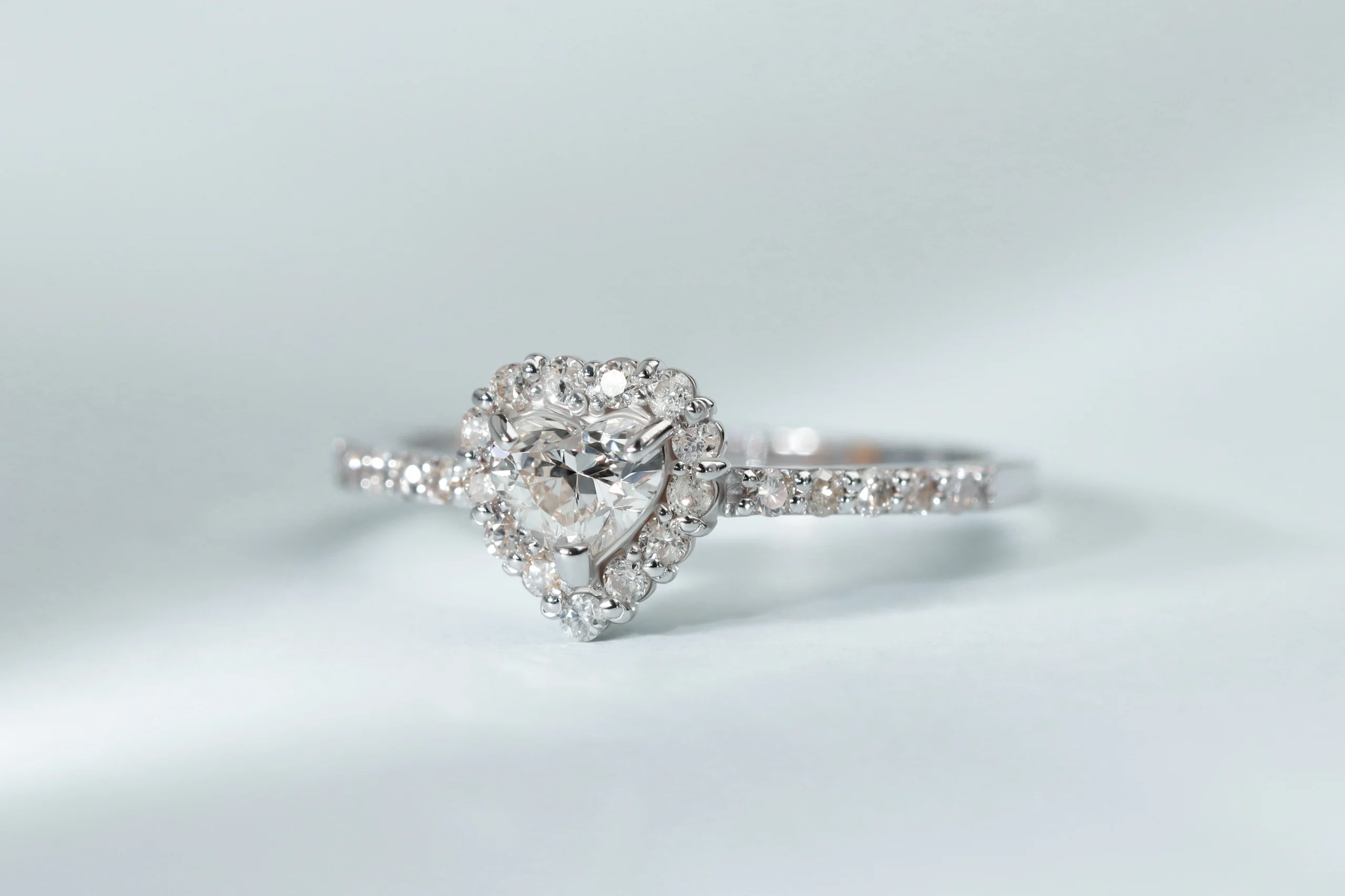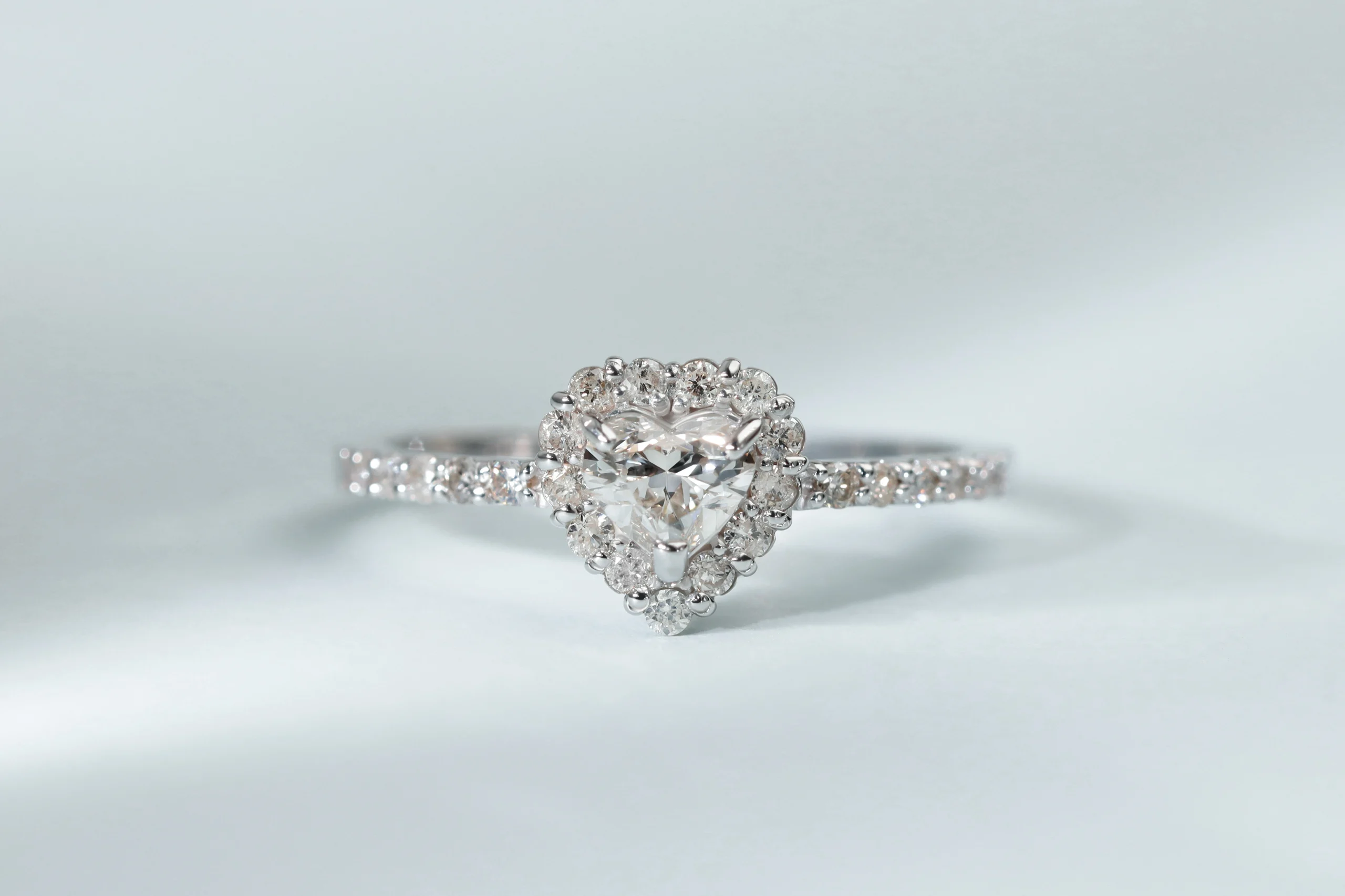 Кольцо из золота с 1 бриллиантом в огранке «сердце» весом 0,25 карат, цвет 4, чистота 5; 27 бриллиантами в огранке «круглая» весом 0,25 карат, цвет 4, чистота 5.