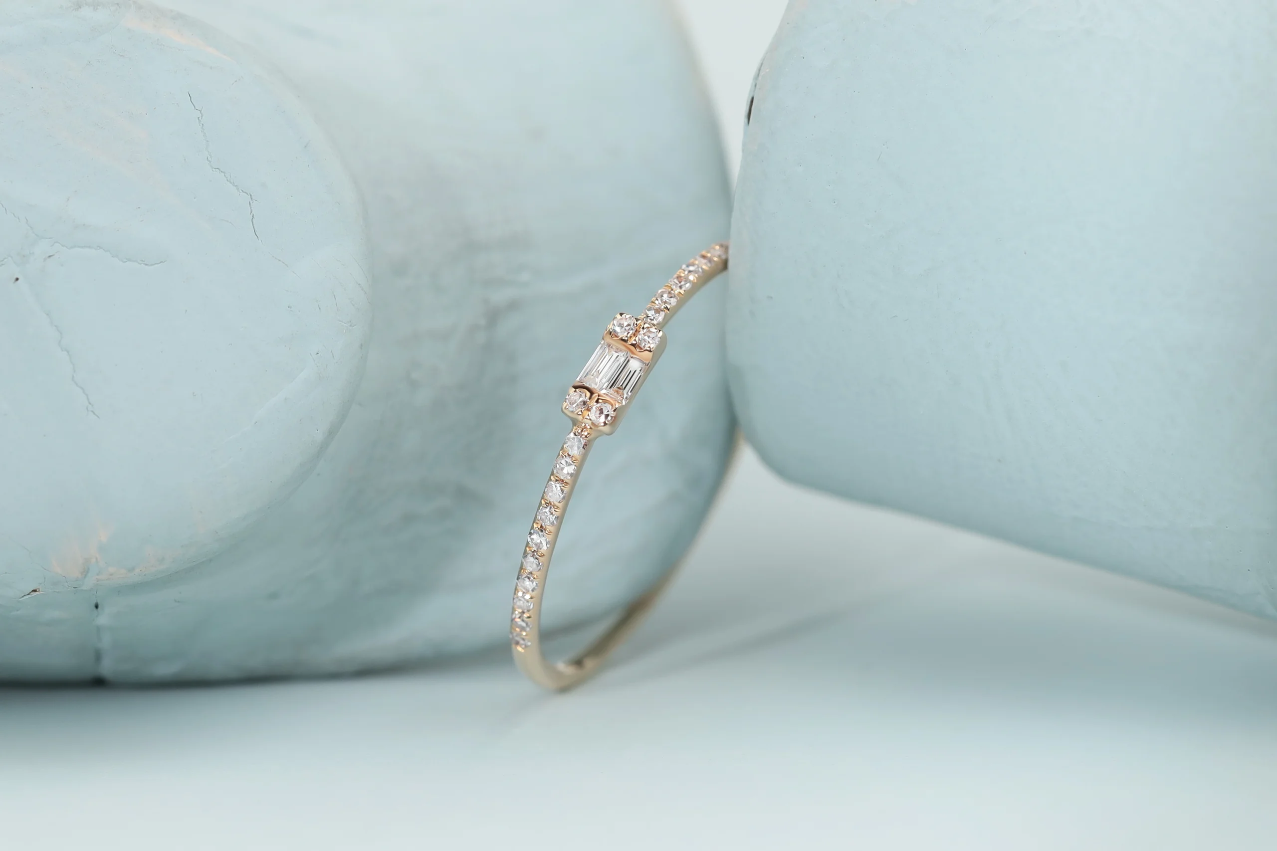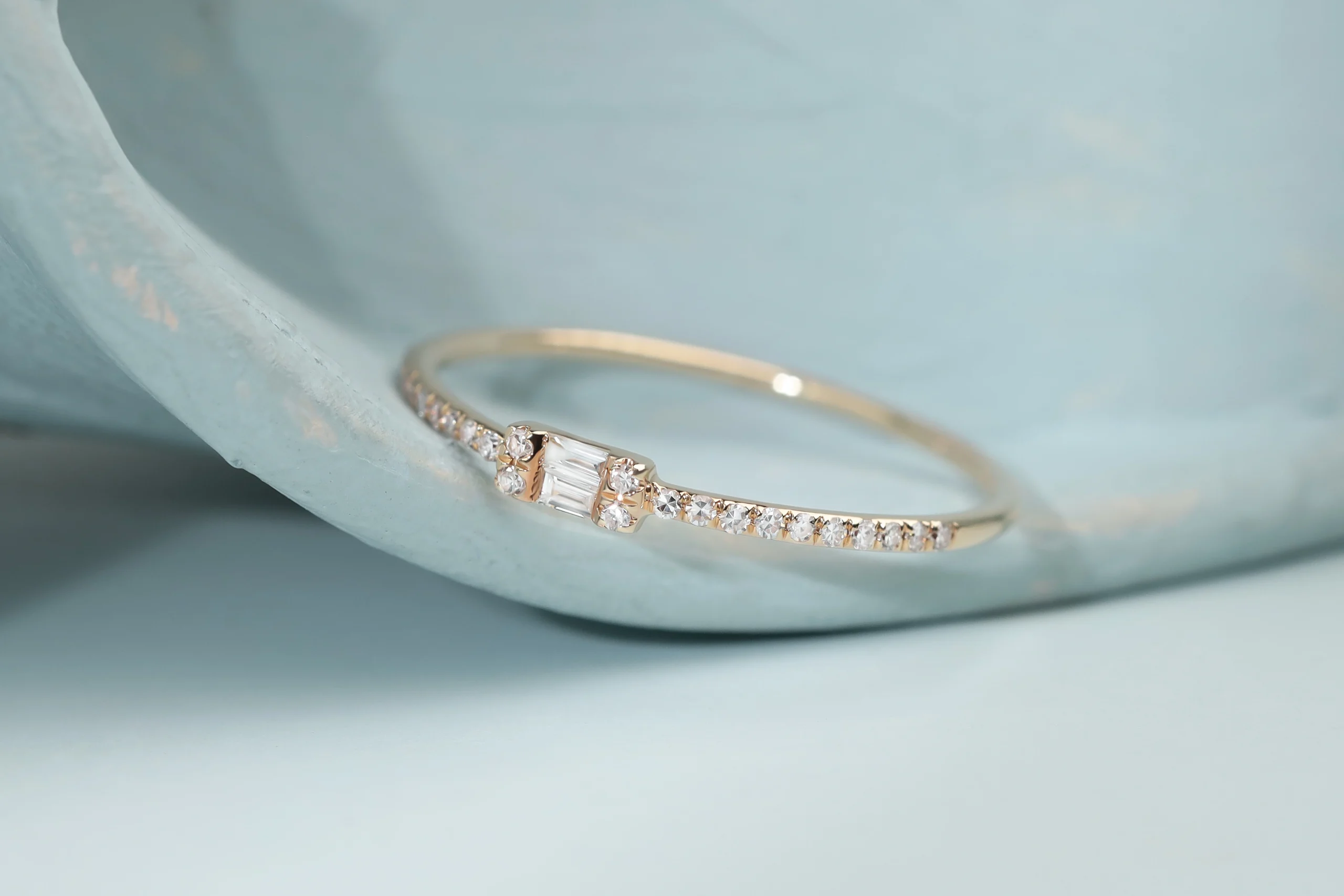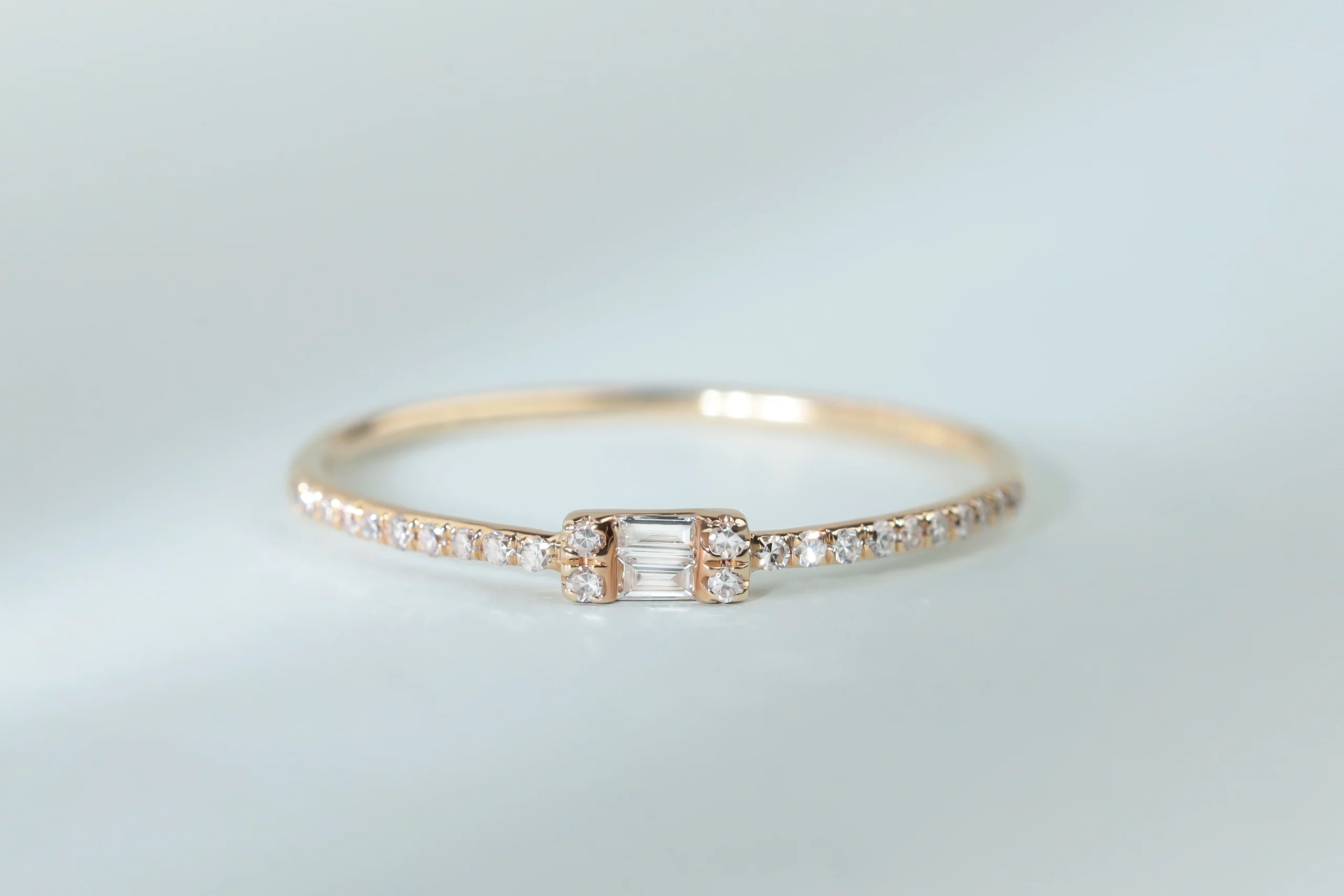 Кольцо из золота с 24 бриллиантами в огранке «круглая» весом 0,07 карат, цвет 3, чистота 5; 2 бриллиантами в огранке «багет» весом 0,03 карат, цвет 4, чистота 5.