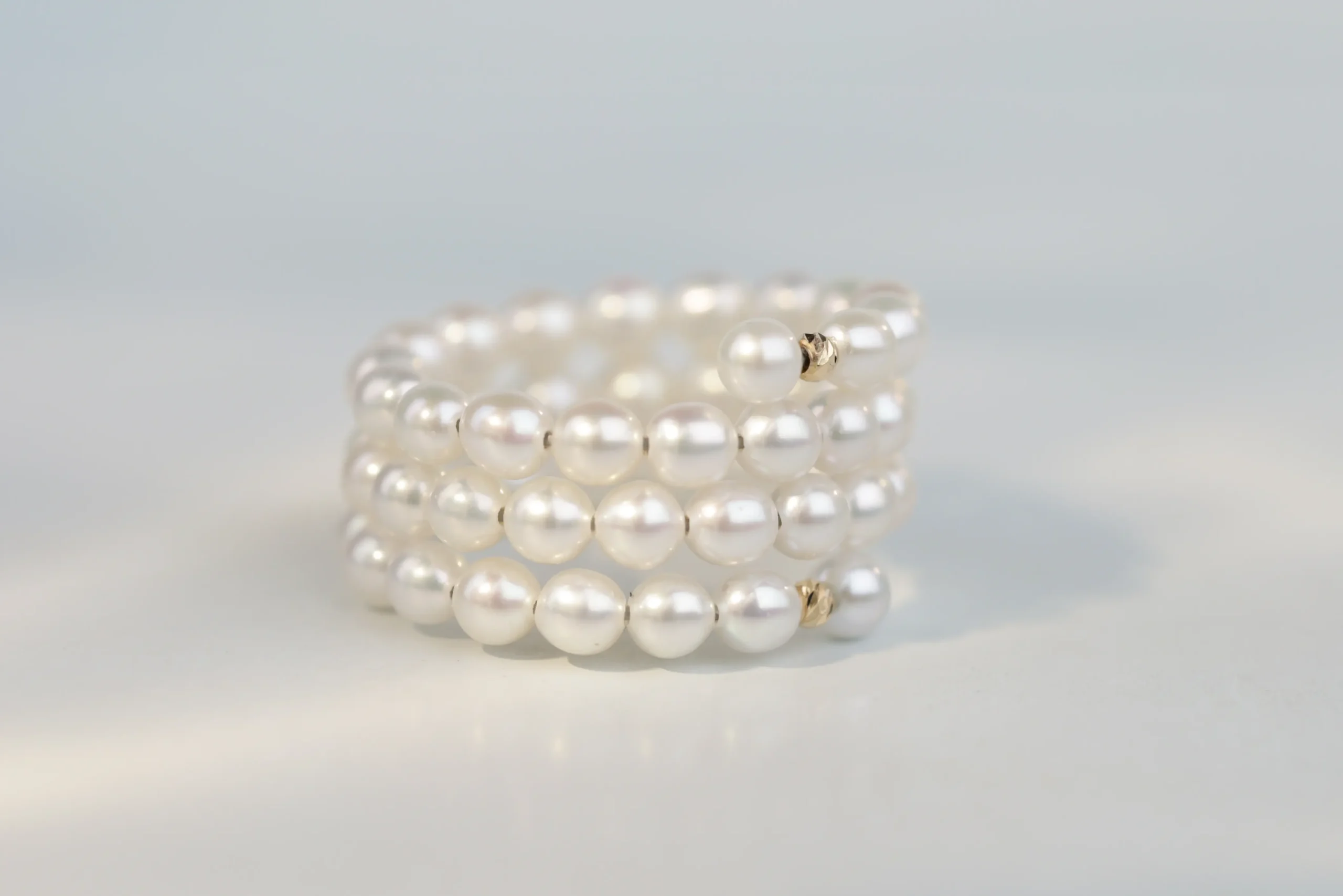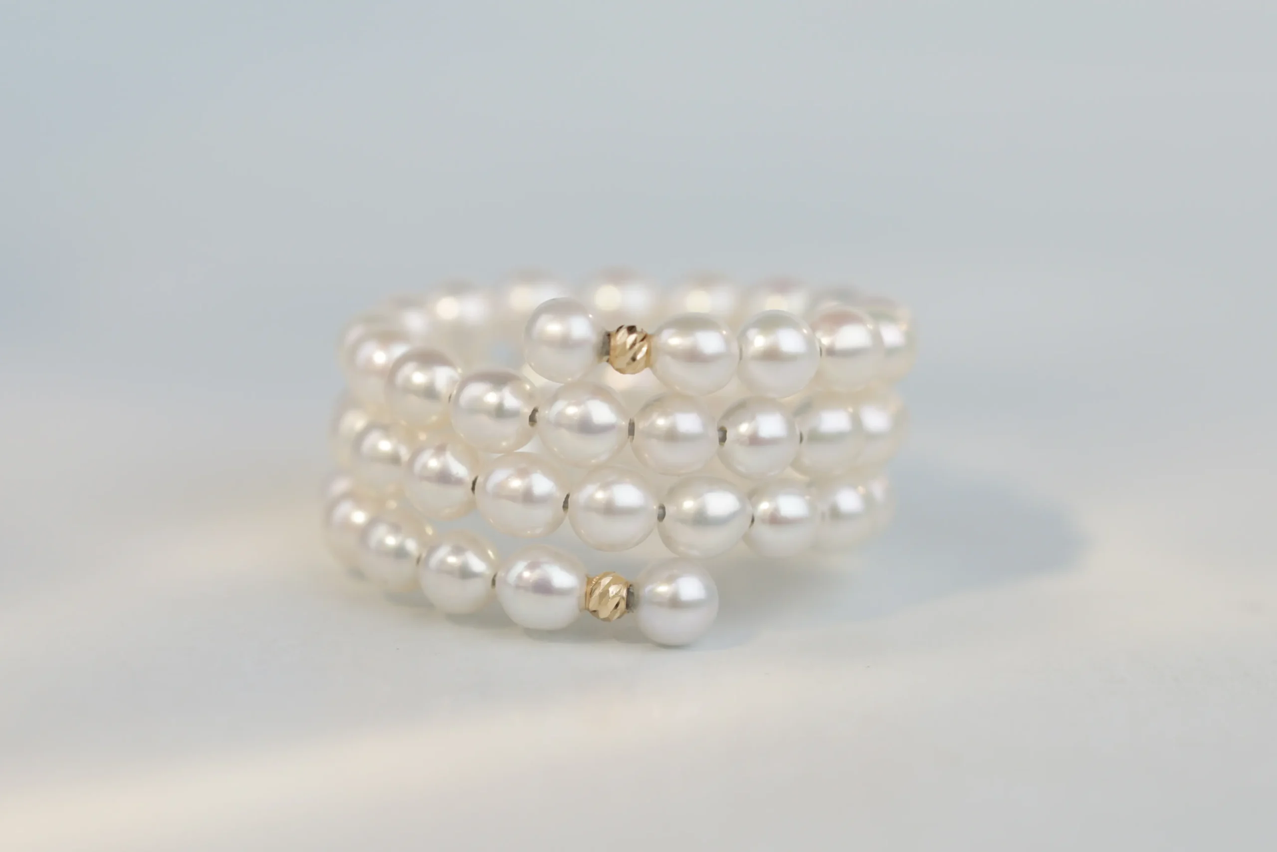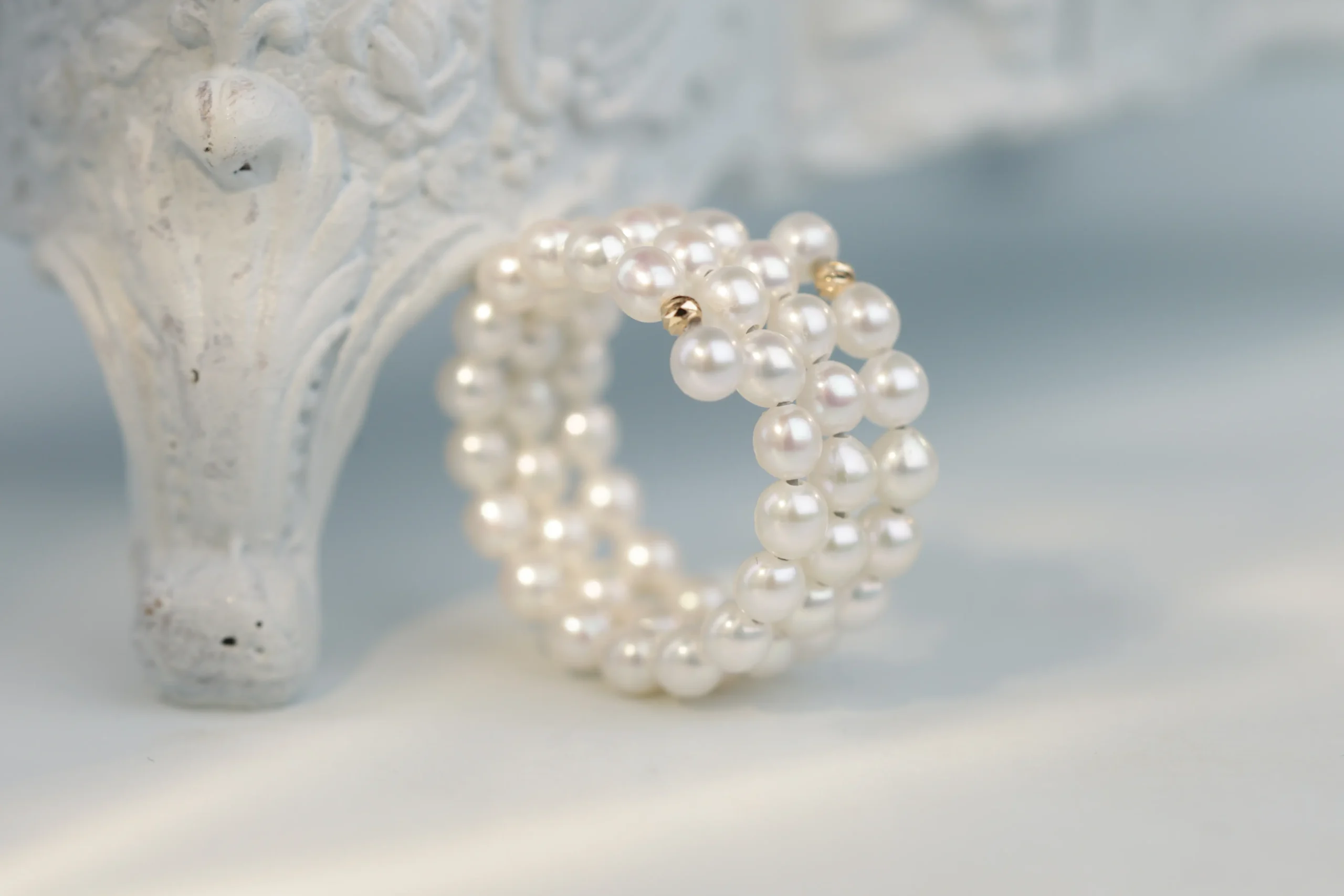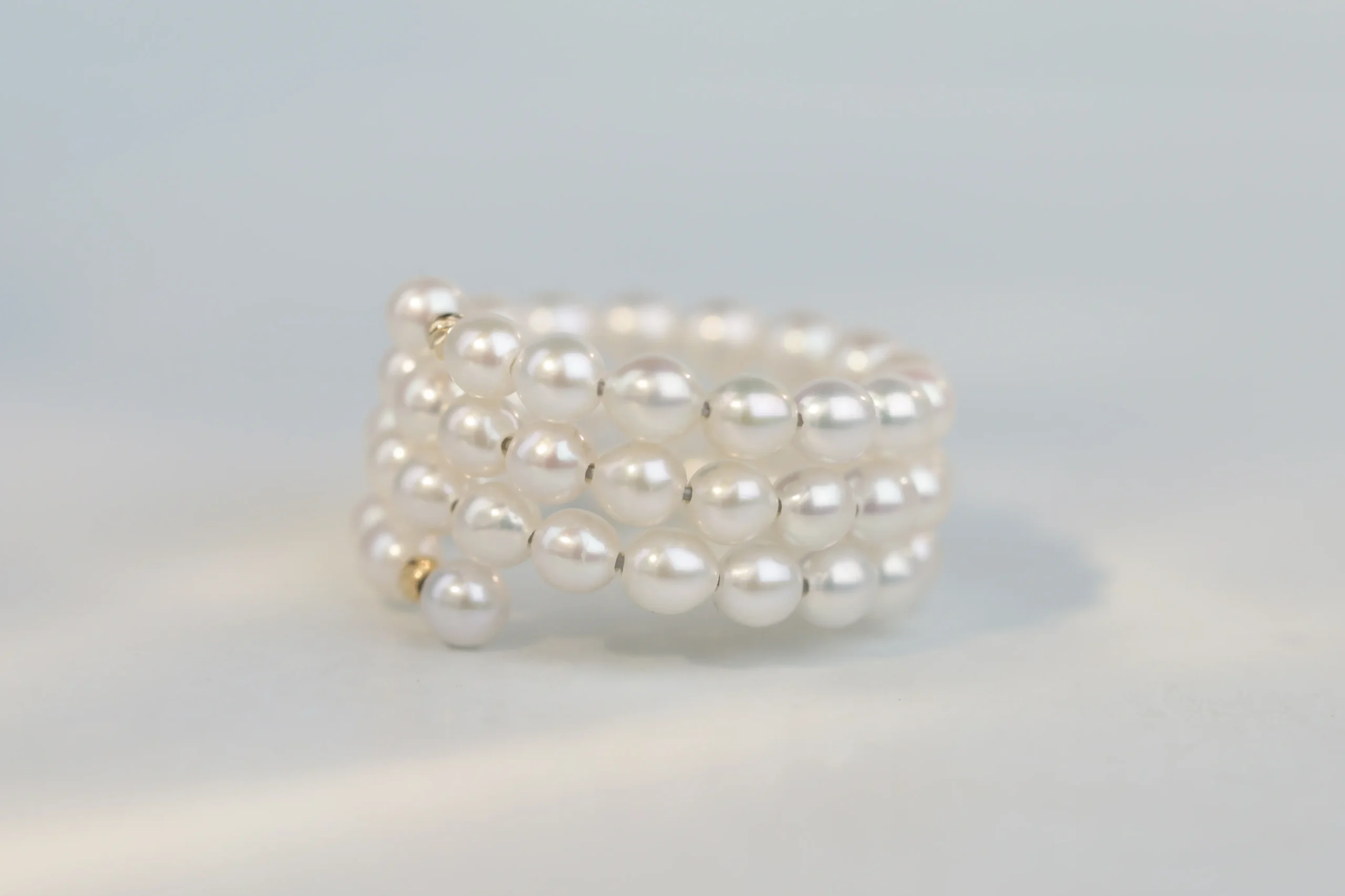 Кольцо пружинка с жемчугом и бусинами из золота с алмазными гранями.