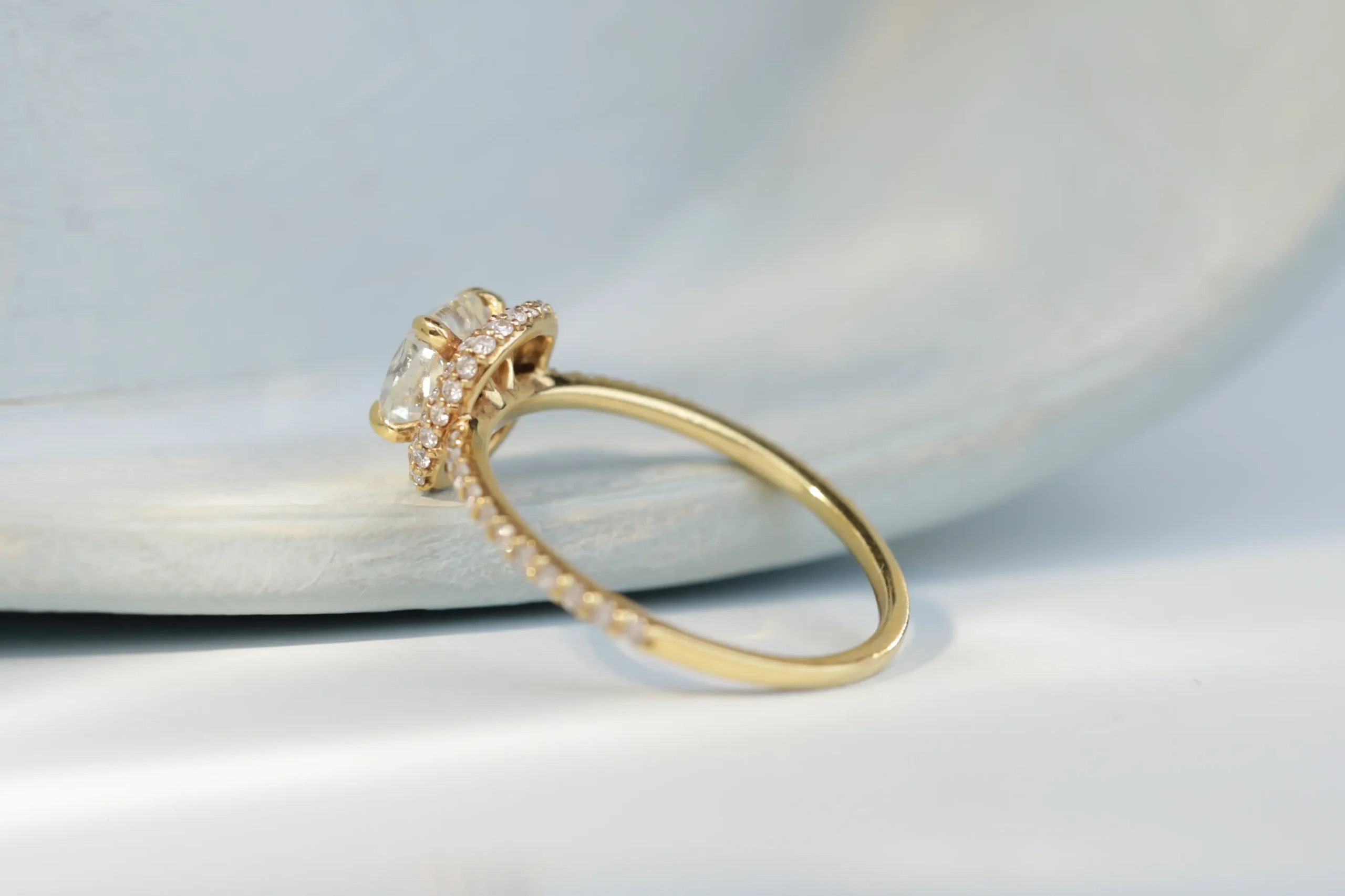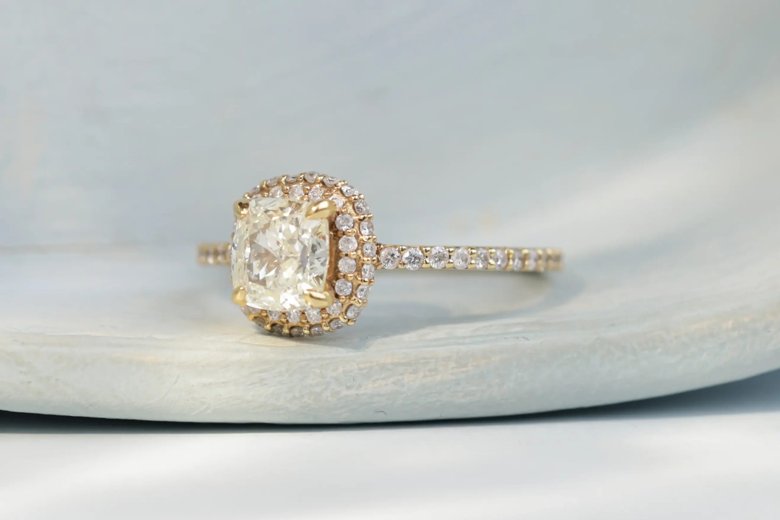 Кольцо из золота с 1 бриллиантом в огранке «круглая» весом 1,03 карата, цвет 4, чистота 5; 64 бриллиантами в огранке «круглая» весом 1,81 карата, цвет 4, чистота 5.