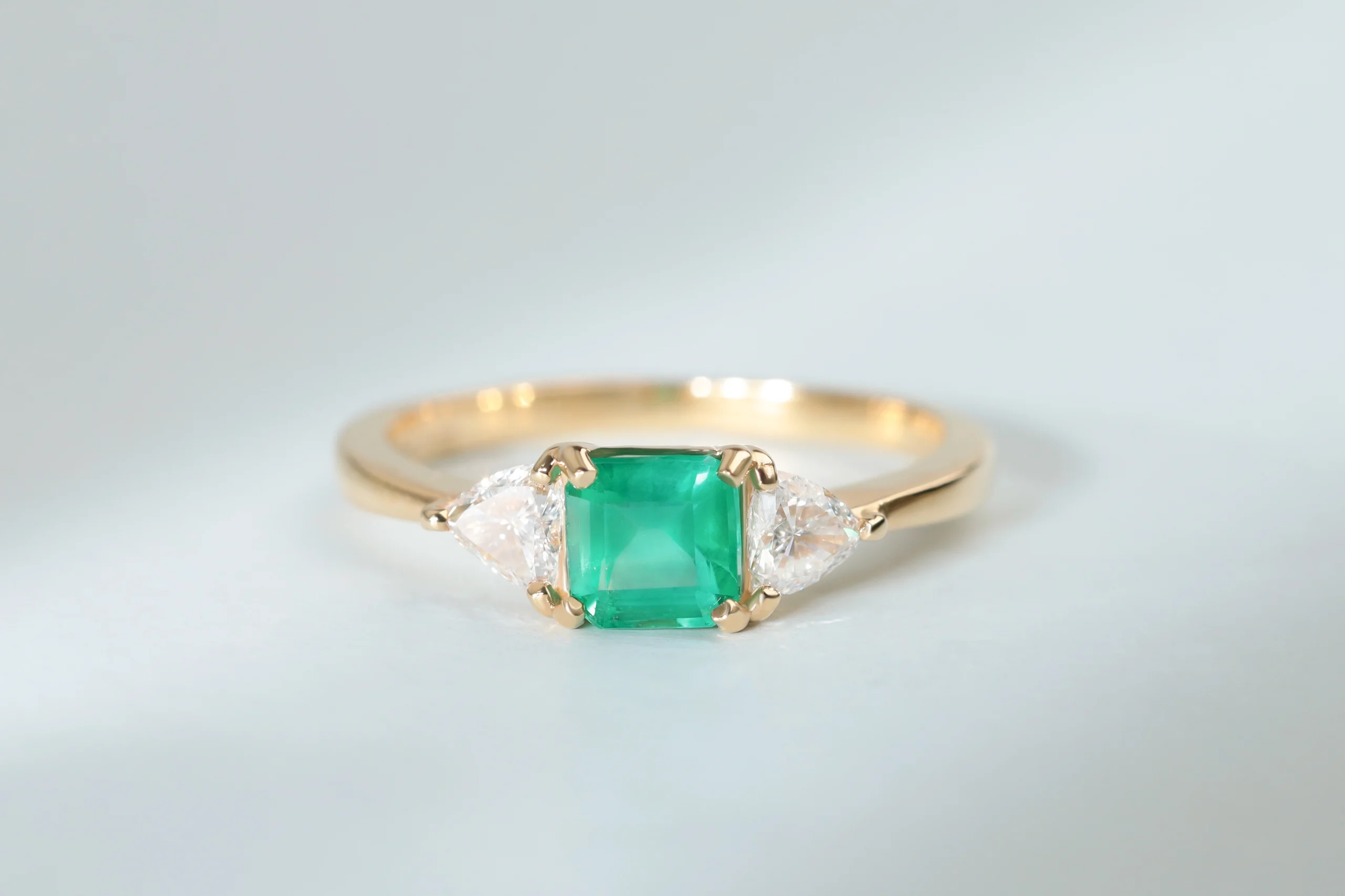 Кольцо из золота с 1 изумрудом весом 0,71 карат, цвет 2, чистота 2; 2 бриллиантами в огранке «триллион» весом 0,37 карат, цвет 4, чистота 4.