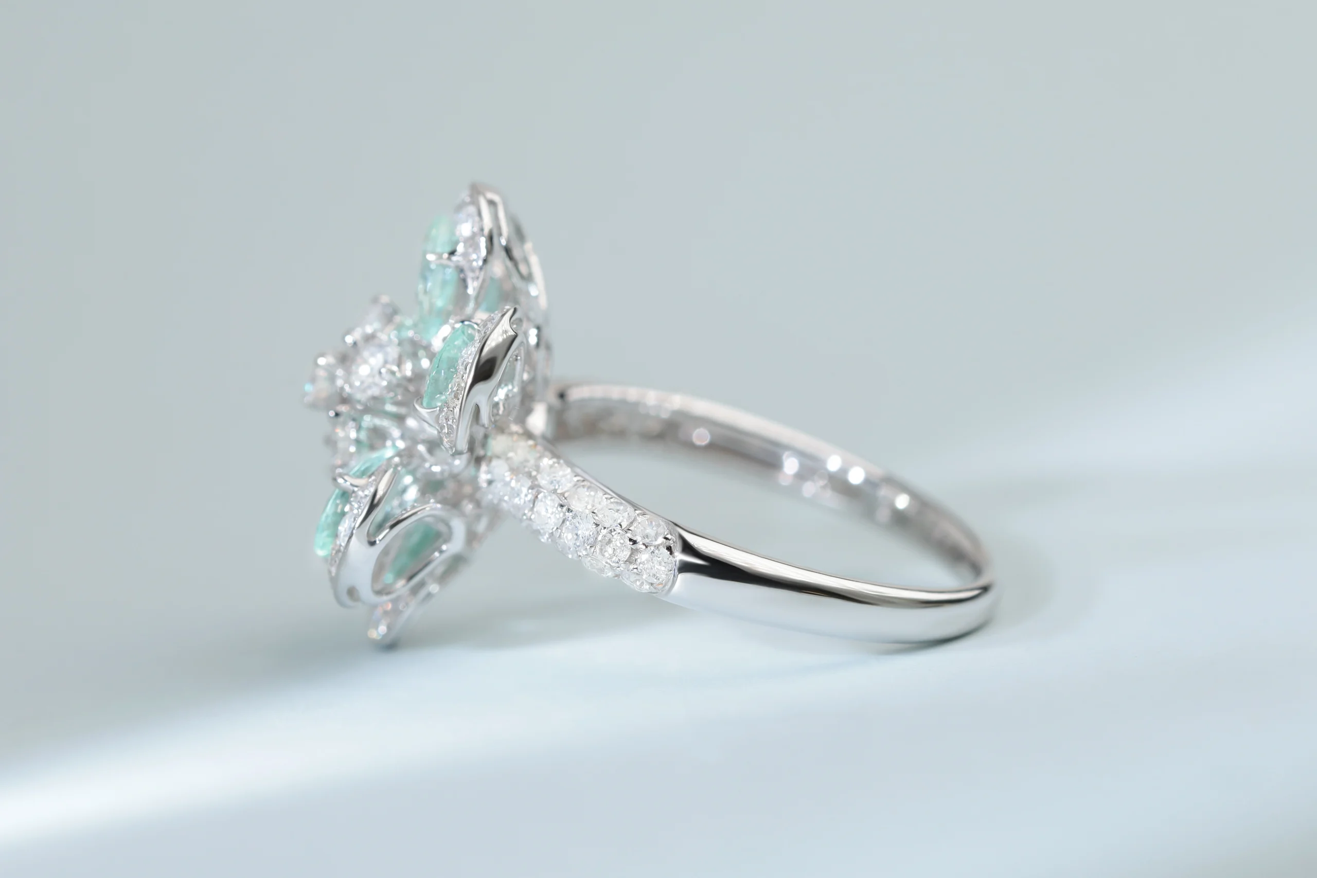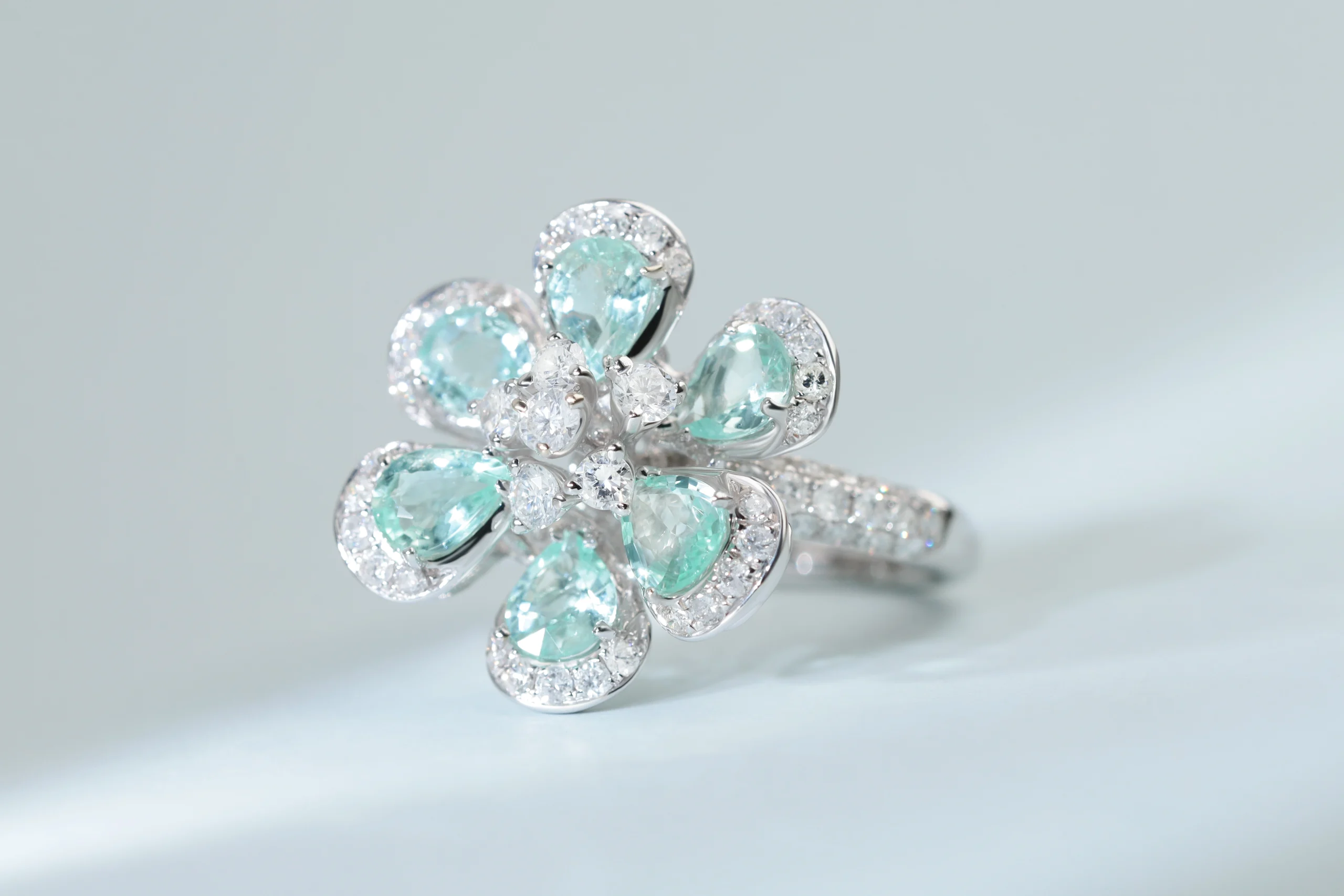 Золотое кольцо с 6 турмалинами параиба весом 1,58 карат; 72 бриллиантами в огранке «круглая» весом 1,0 карат, цвет 5, чистота 5.
