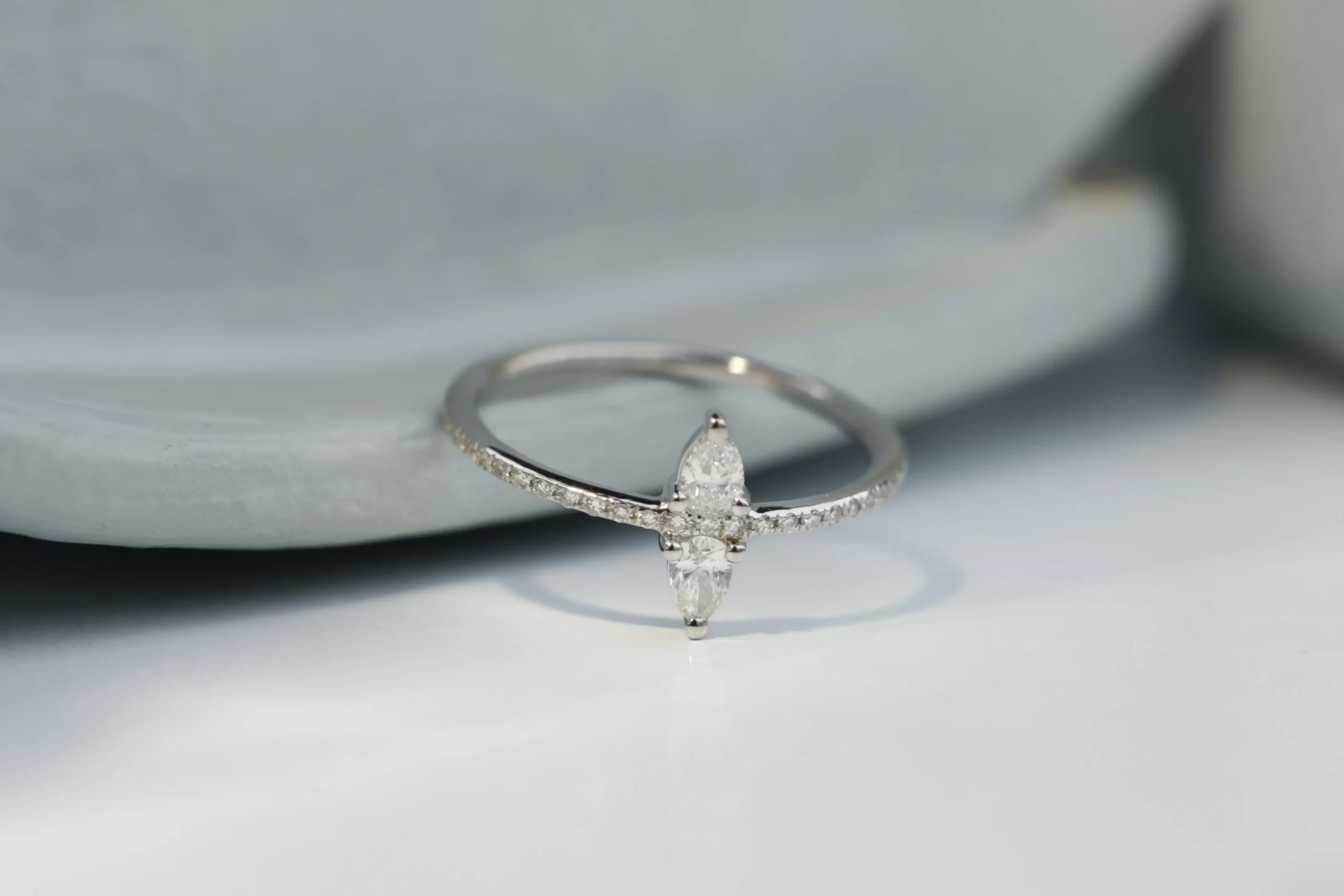 Кольцо из золота с 27 бриллиантами в огранке «круглая» весом 0,07 карат, цвет 3, чистота 5; 2 бриллиантами в огранке «груша» весом 0,15 карат, цвет 4, чистота 5.