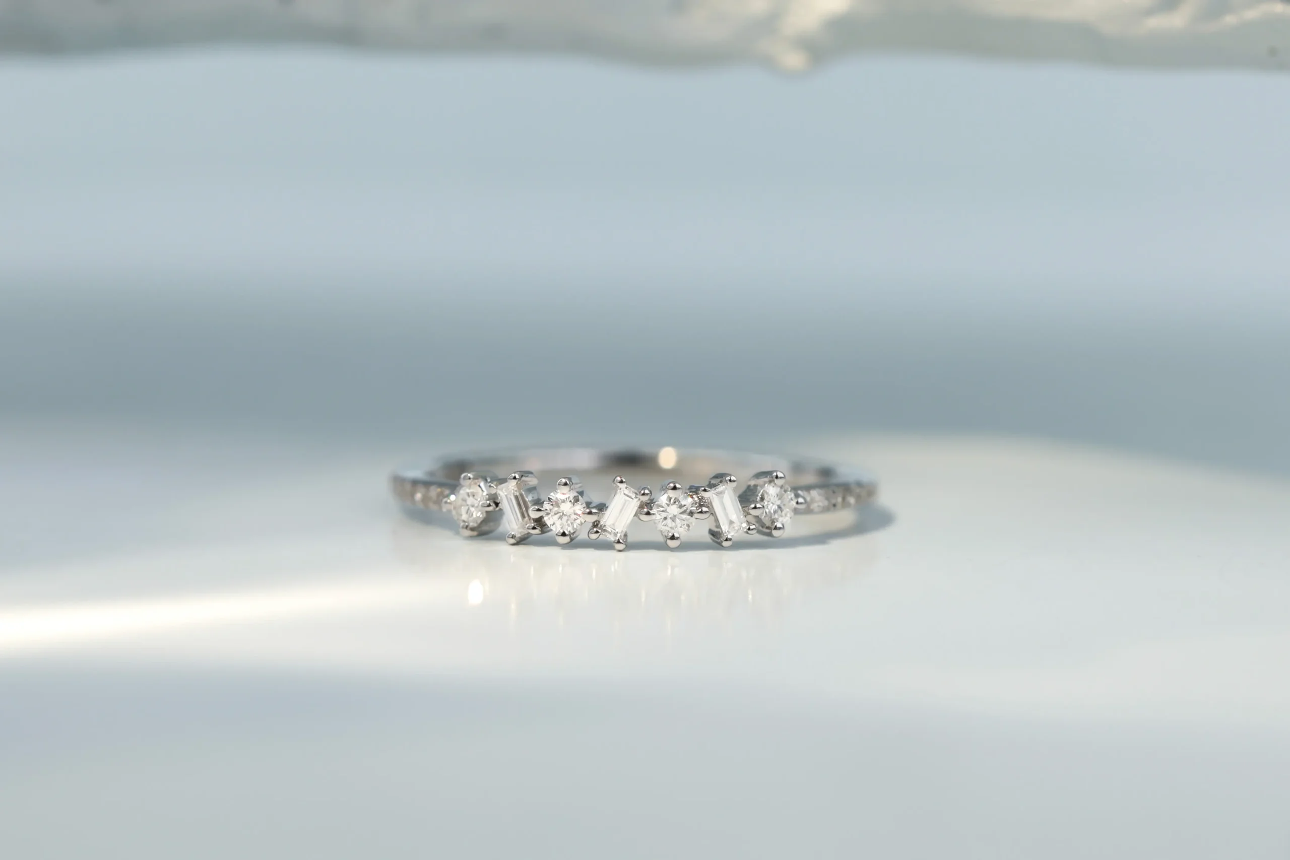 Кольцо из золота с 22 бриллиантами в огранке «круглая» весом 0,14 карат, цвет 3, чистота 5; 3 бриллиантами в огранке «багет» весом 0,04 карат, цвет 4, чистота 5.