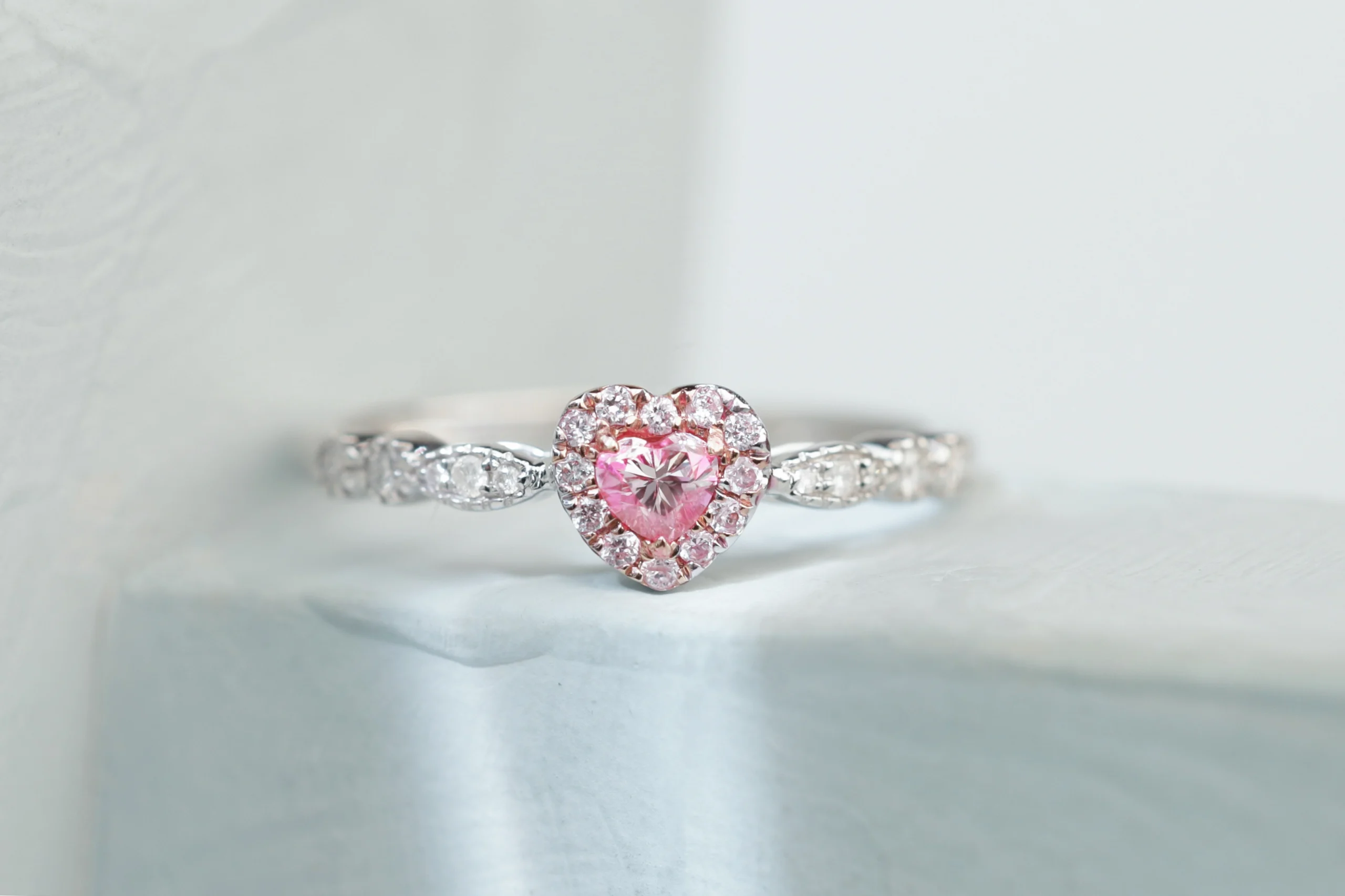 Золотое кольцо общим весом 1,43 гр с 1 розовыми бриллиантами в огранке «сердце», 0,15 кт, цвет 6, чистота 5; 22 бриллиантами в огранке «круглая», 0,15 кт, цвет 4, чистота 5. Размер центральной части 5 х 5 мм.