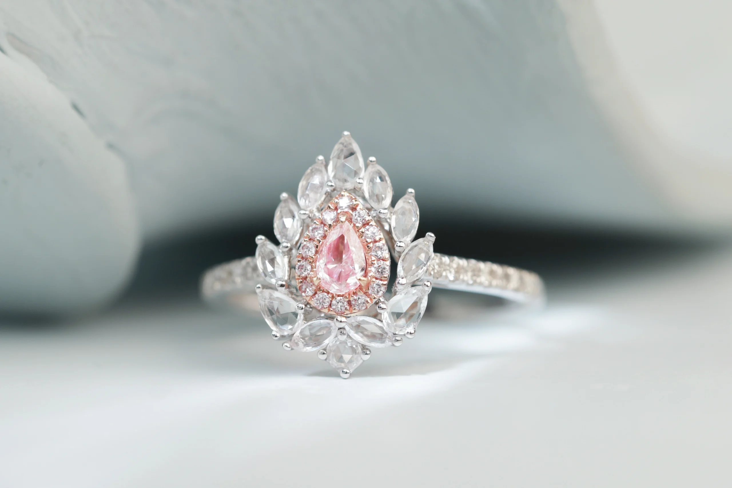 Золотое кольцо общим весом 2,22 гр с 1 розовыми бриллиантами в огранке «груша», 0,10 кт, цвет 6, чистота 6; 13 розовыми бриллиантами в огранке «круглая», 0,04 кт, цвет 6, чистота 5; 12 бриллиантами в огранке «маркиз», 0,20 кт, цвет 4, чистота 5. Размер центральной части 13 х 10 мм.