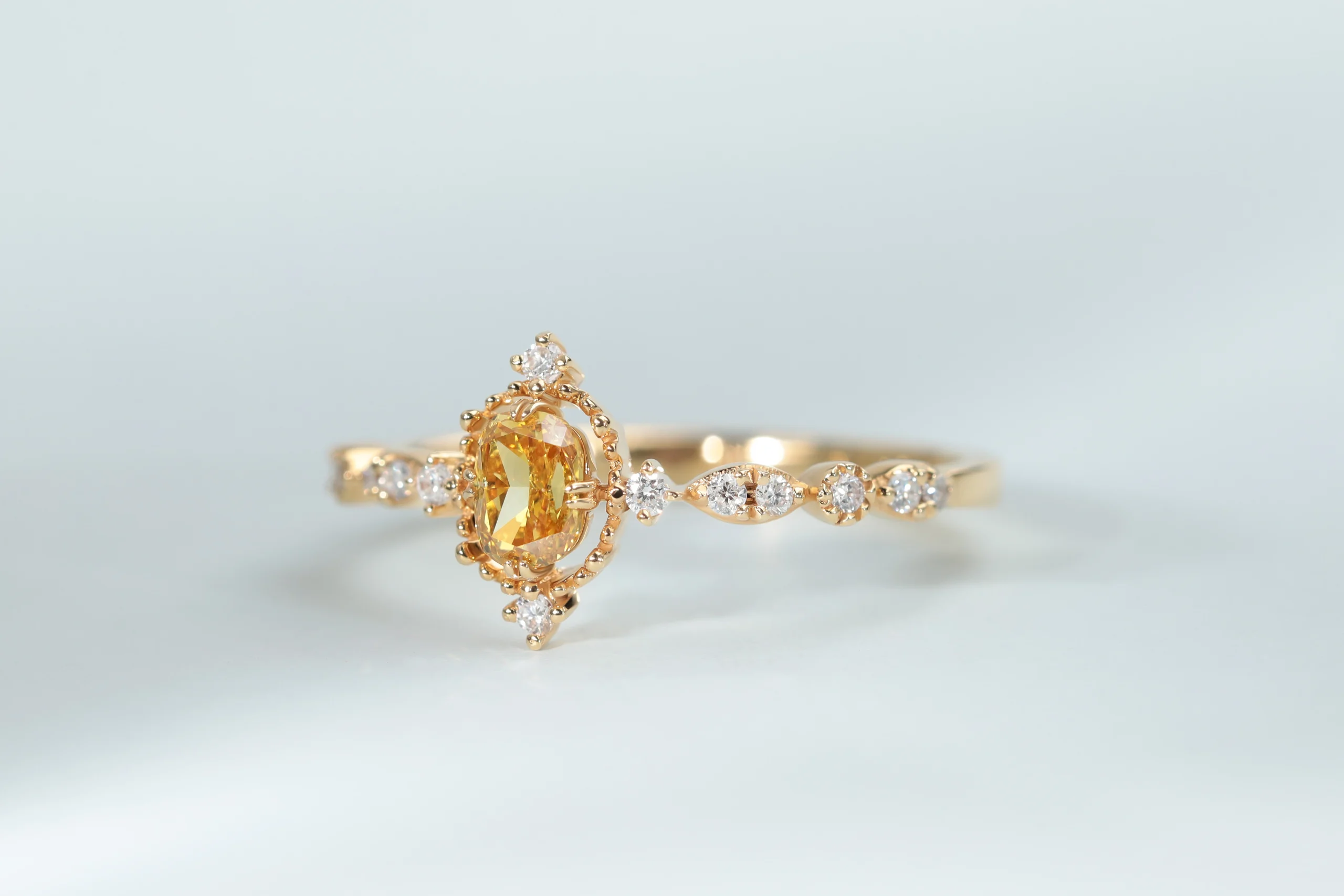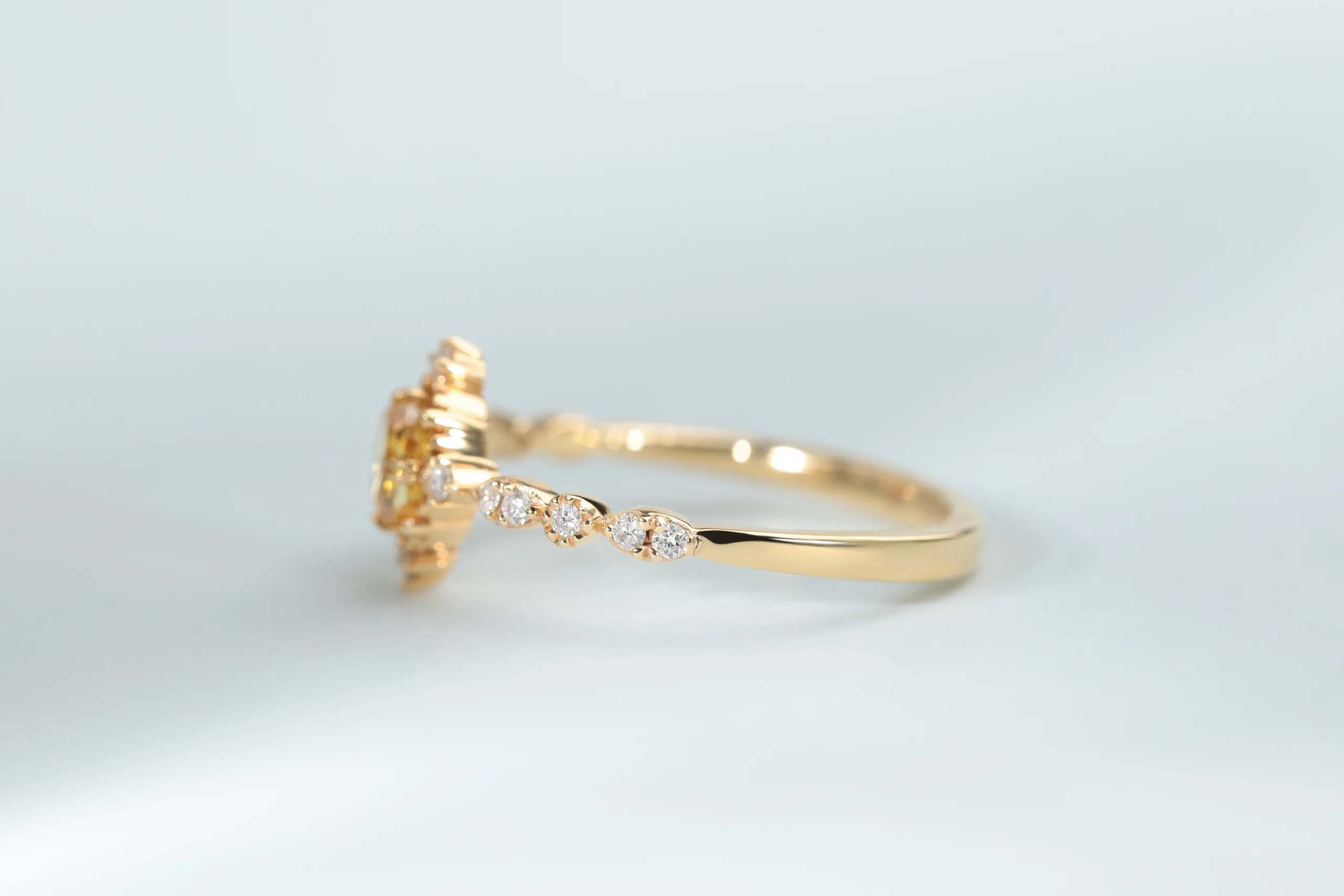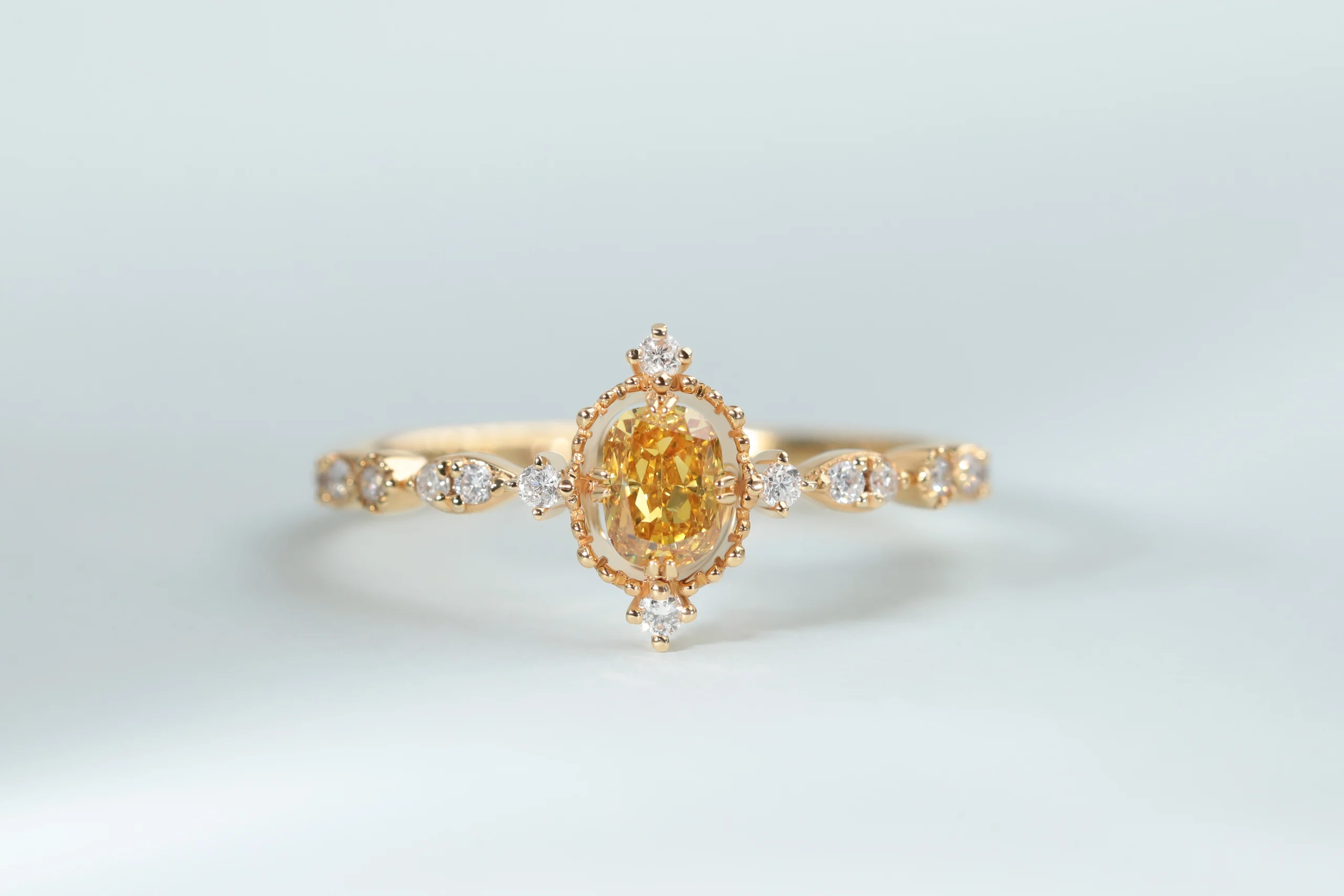 Кольцо из золота с 1 желтым бриллиантом в огранке «овал» весом 0,33 карат; 14 бриллиантами в огранке «круглая» весом 0,11 карат, цвет 4, чистота 5.
