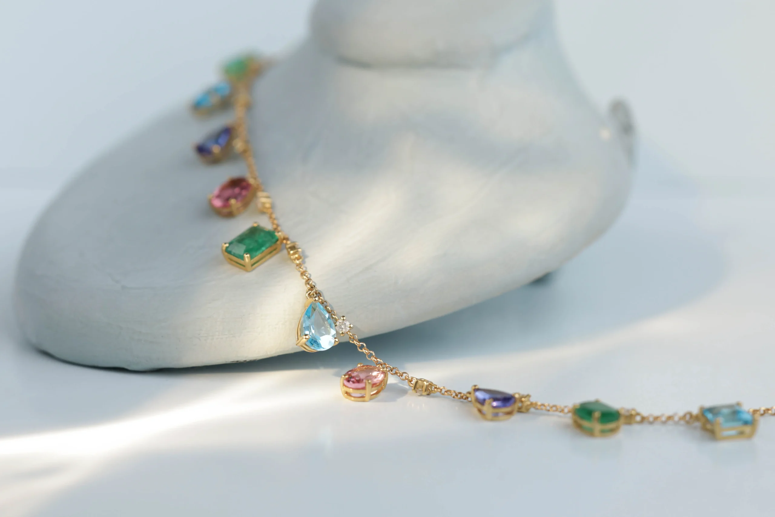 Колье с бриллиантами, изумрудом, топазом, турмалином и танзанитом