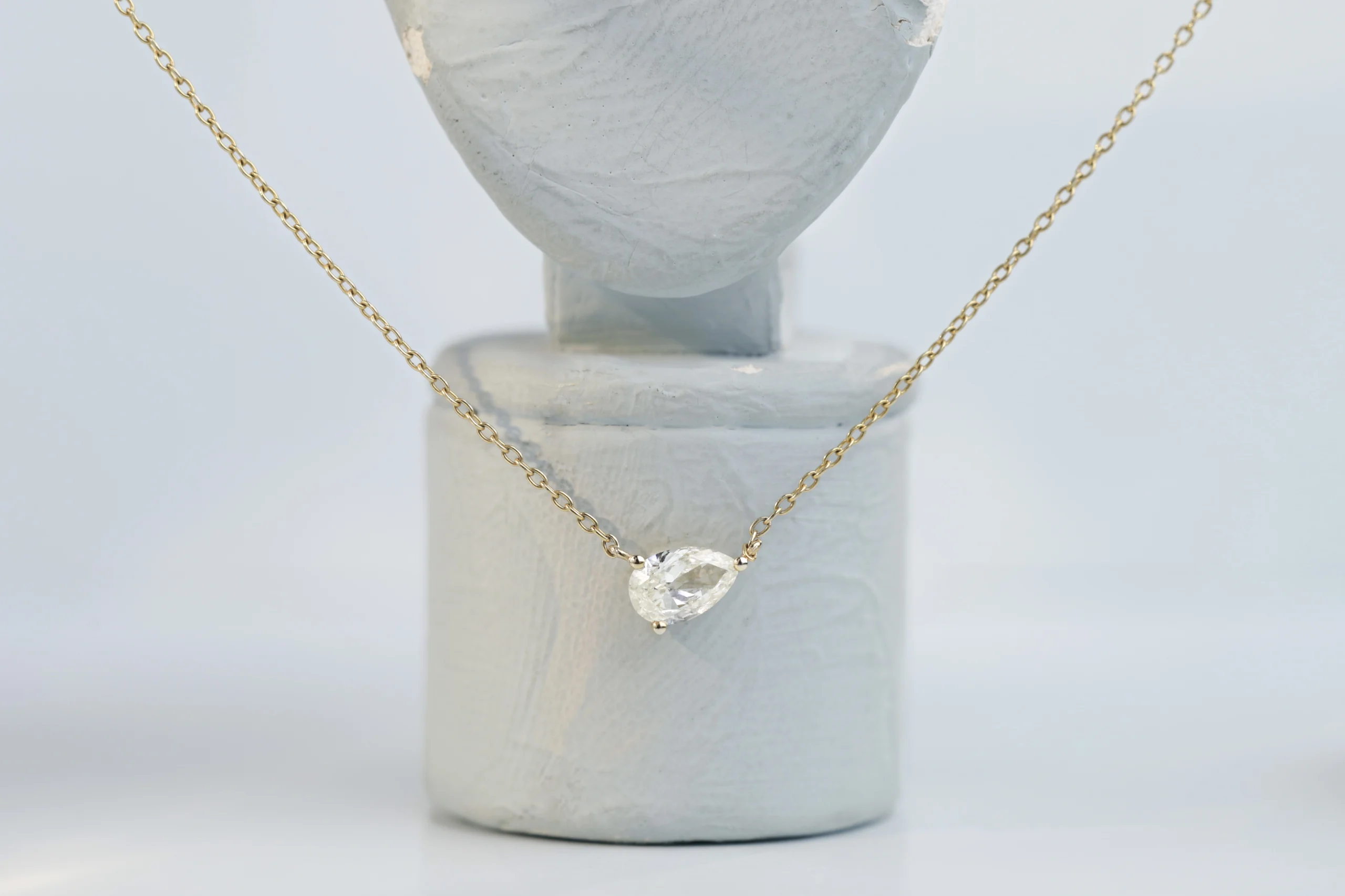 Колье из золота с 1 бриллиантом в огранке «груша» весом 0,38 карат, цвет 3, чистота 5.