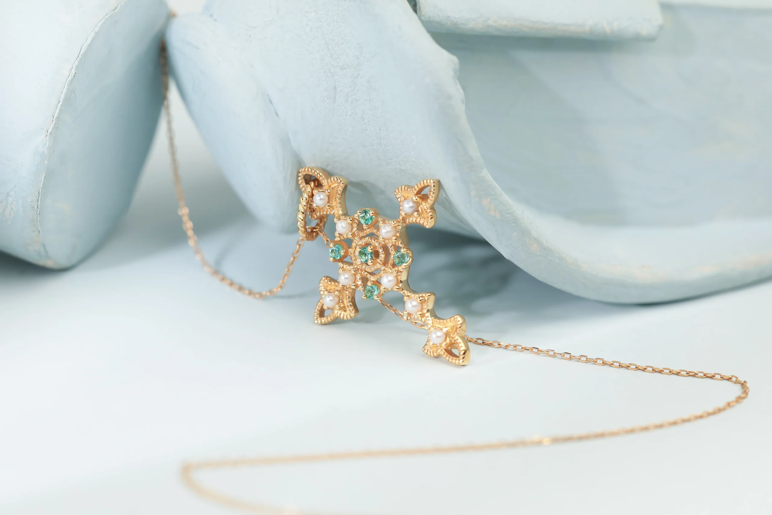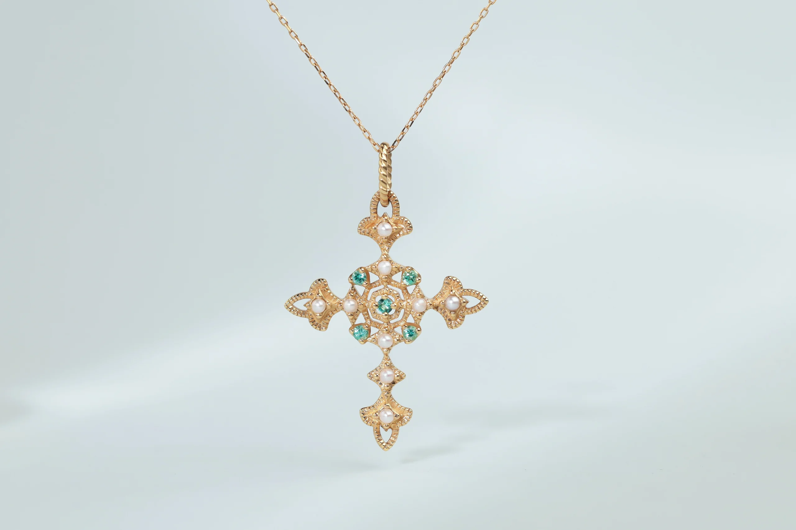 Колье с жемчужно-изумрудным крестиком