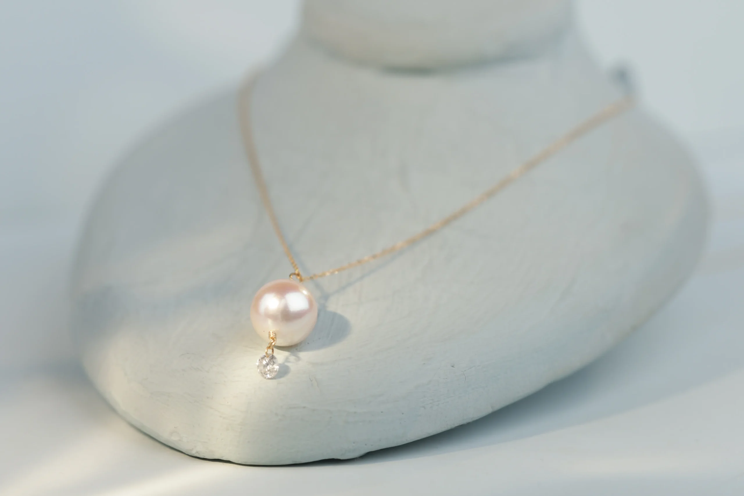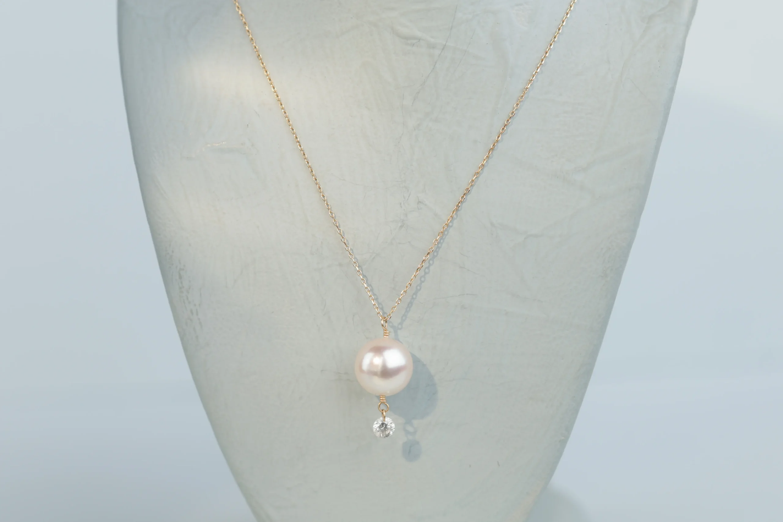 Колье из золота с 1 бриллиантом в огранке «круглая» весом 0,10 карат, цвет 3, чистота 5 и жемчугом.