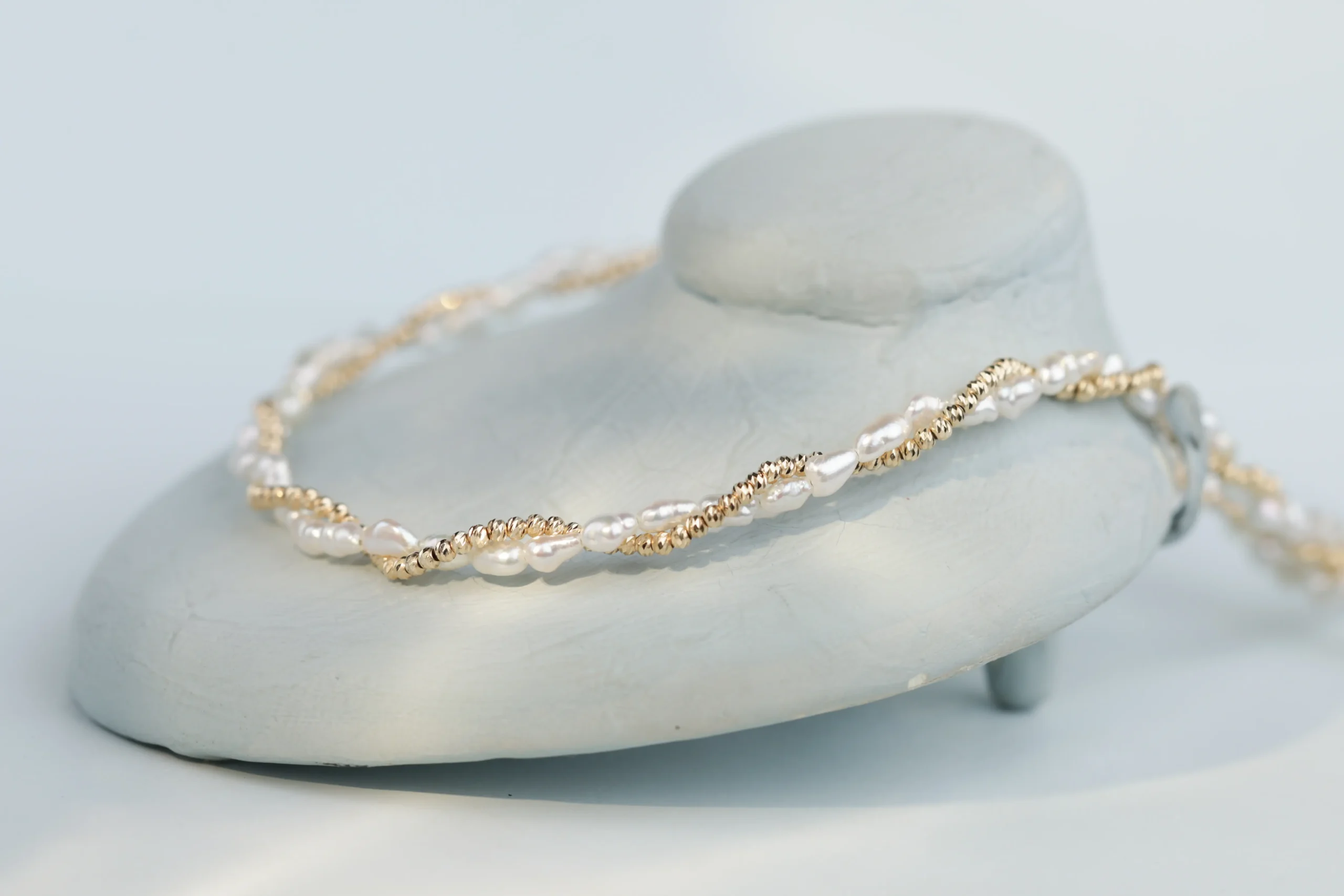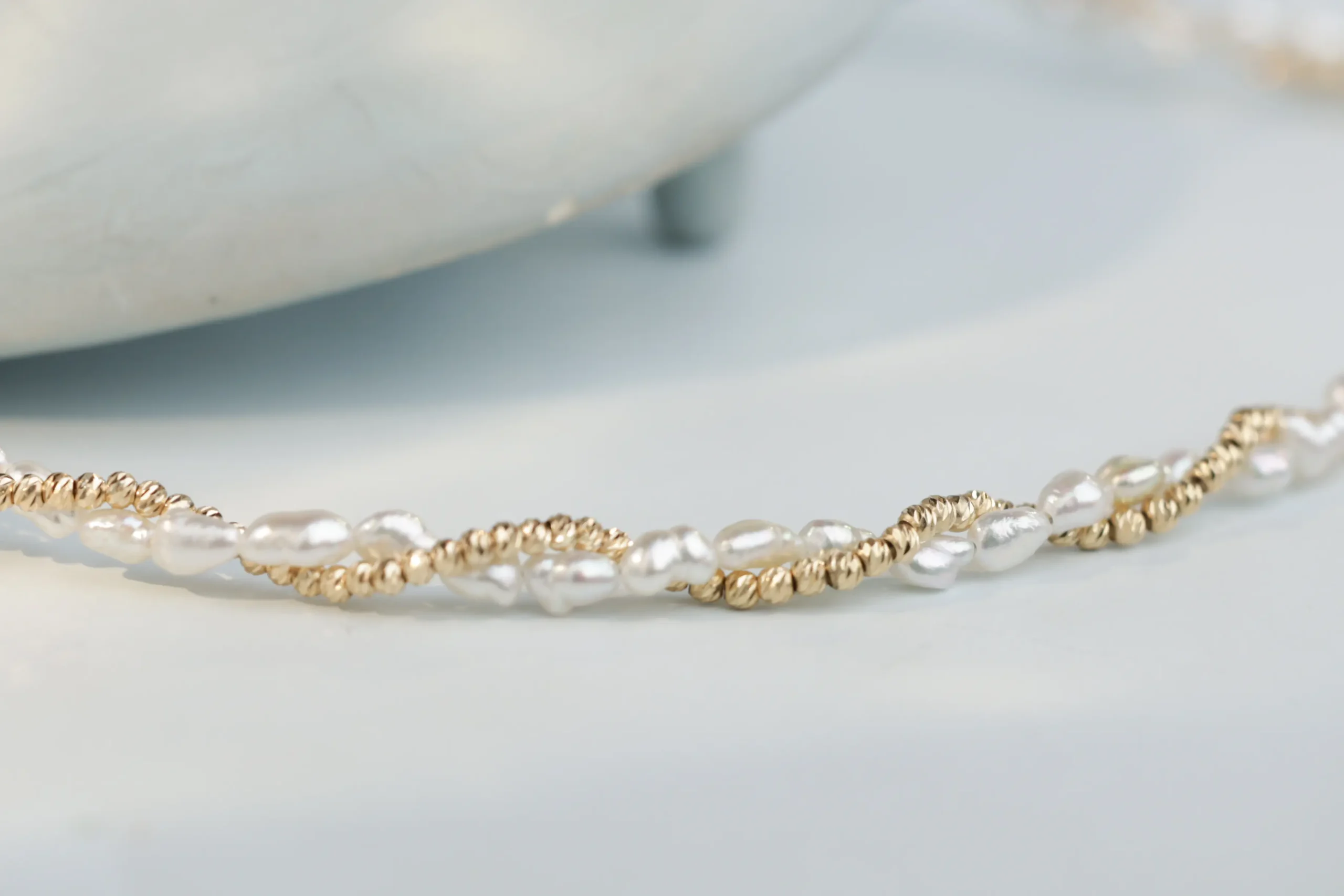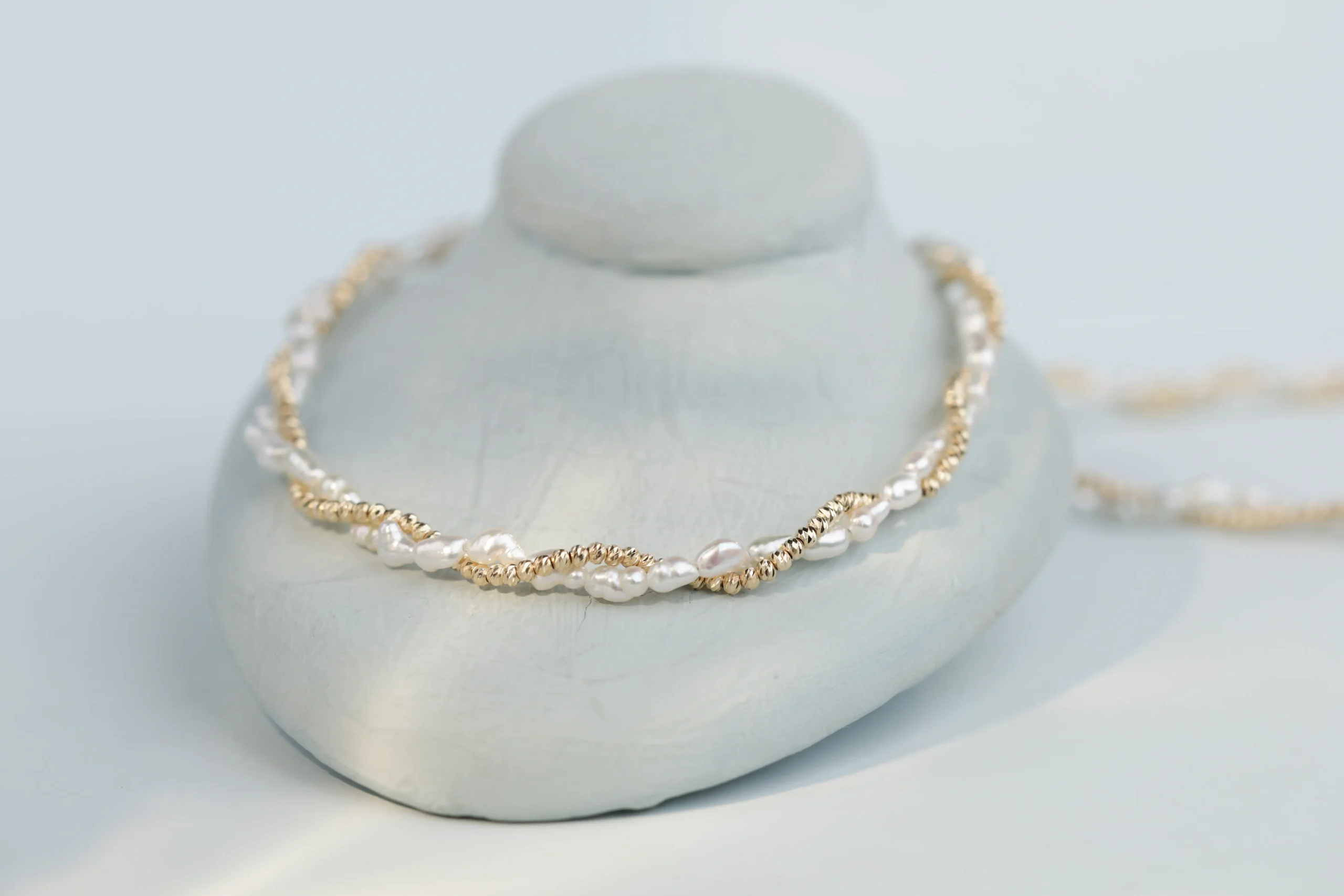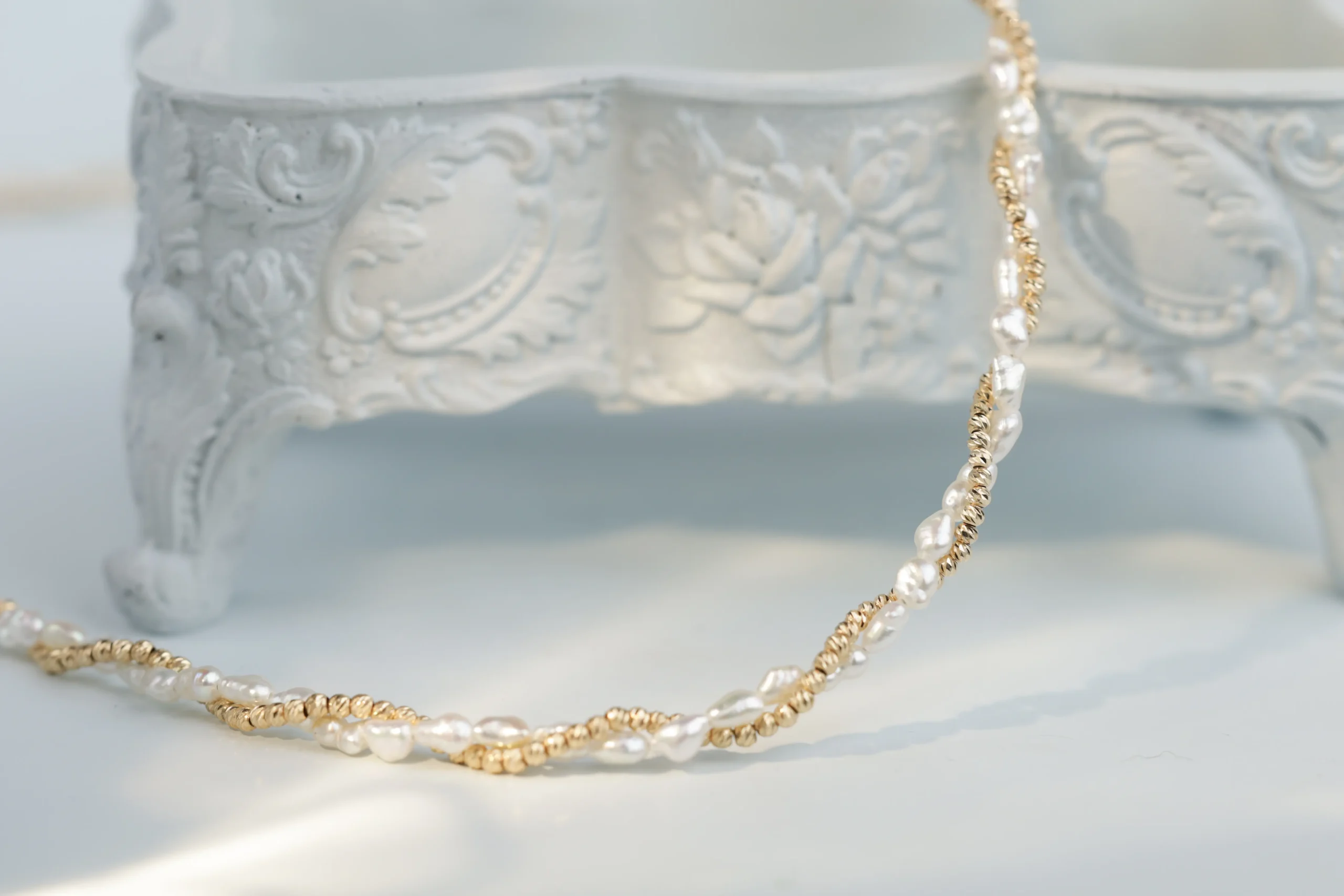 Колье из золота с жемчугом и бусинами из золота с алмазными гранями.