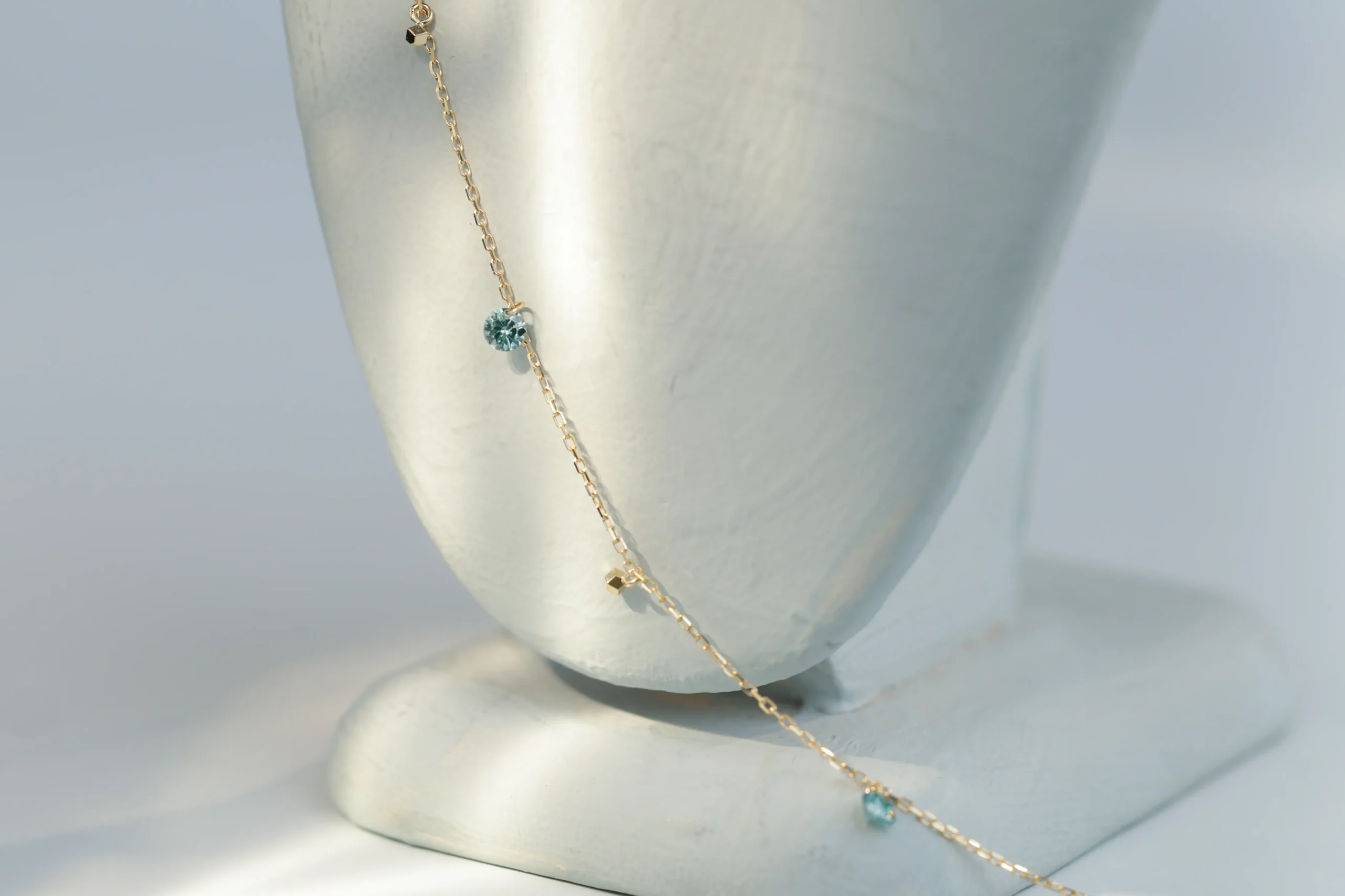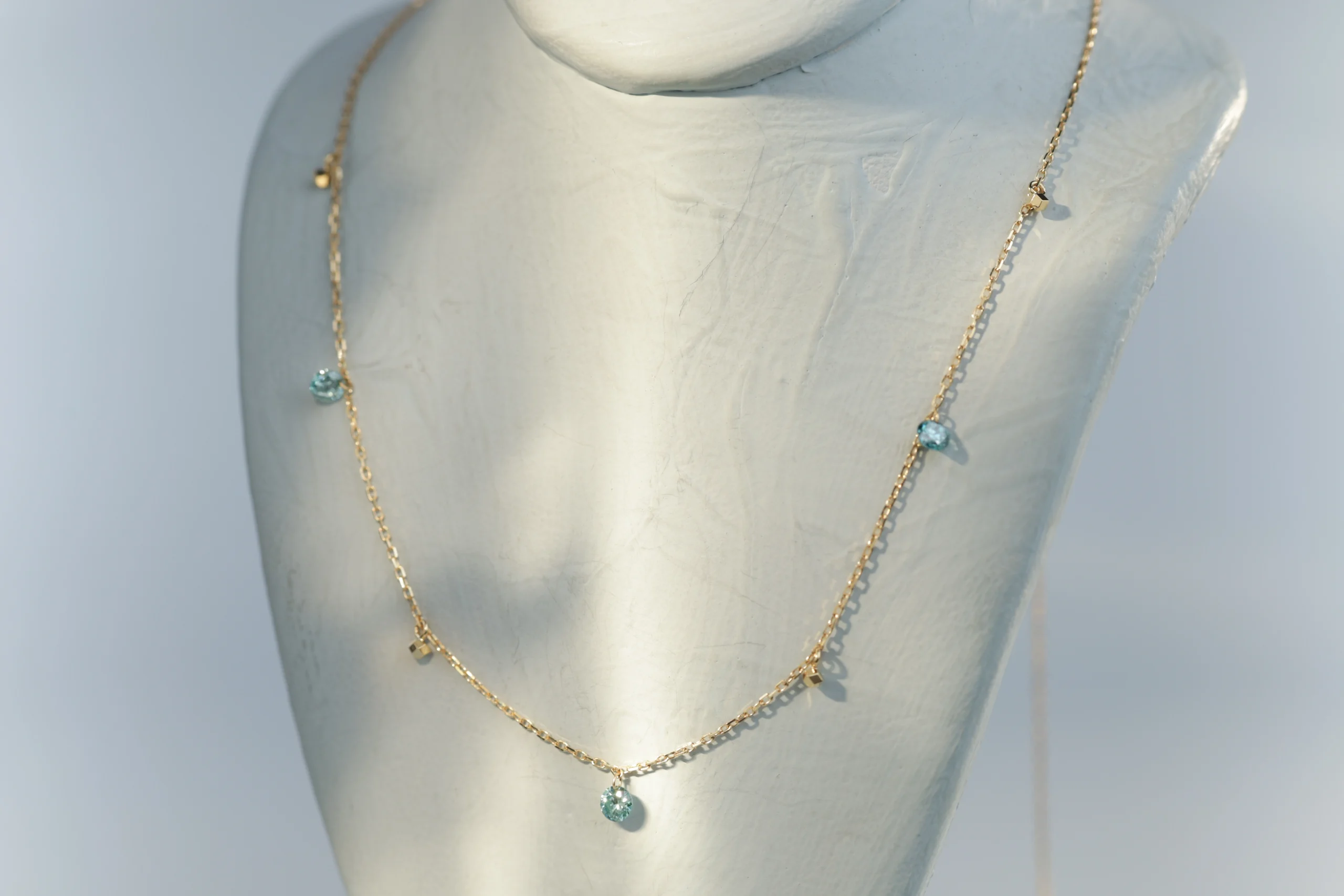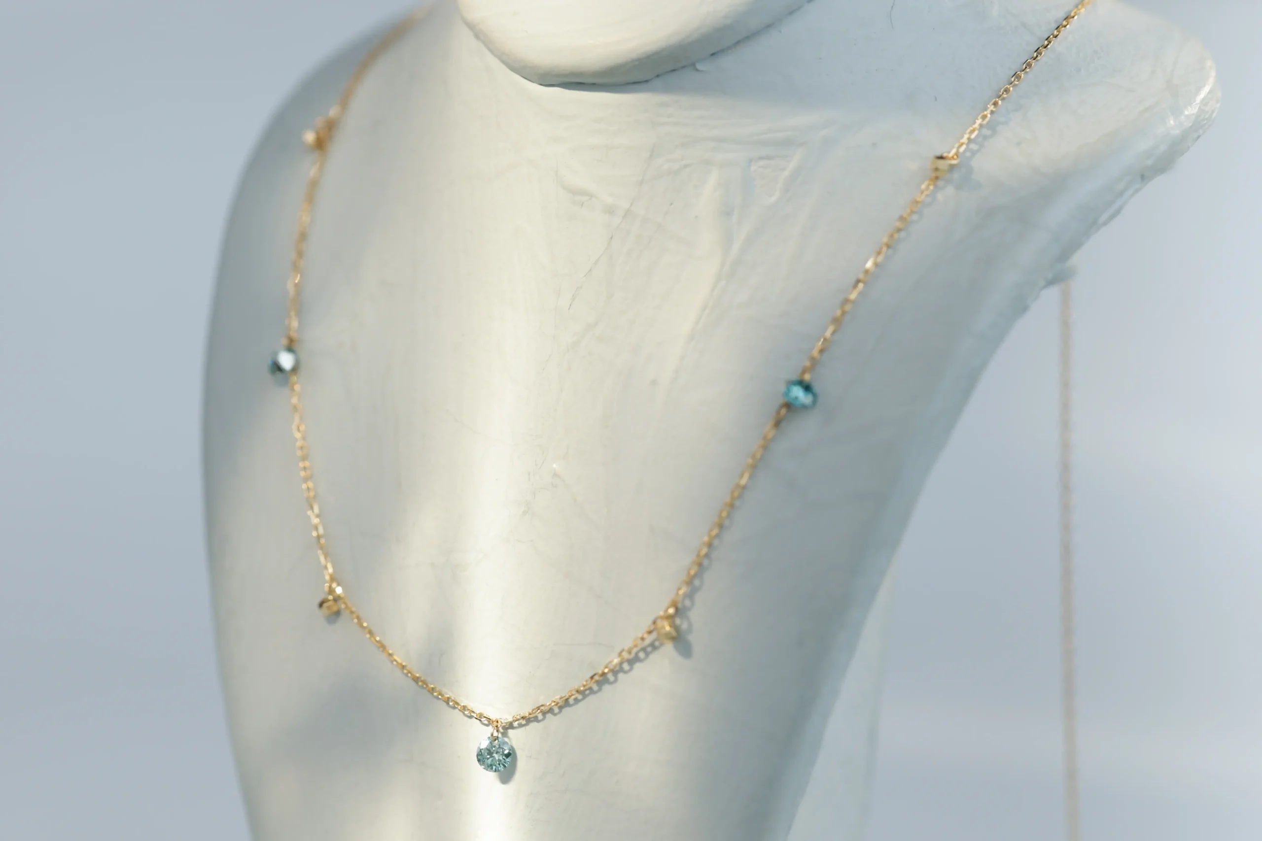 Колье из золота с 3 голубыми бриллиантами в огранке «круглая» весом 0,21 карат, цвет 4, чистота 4.