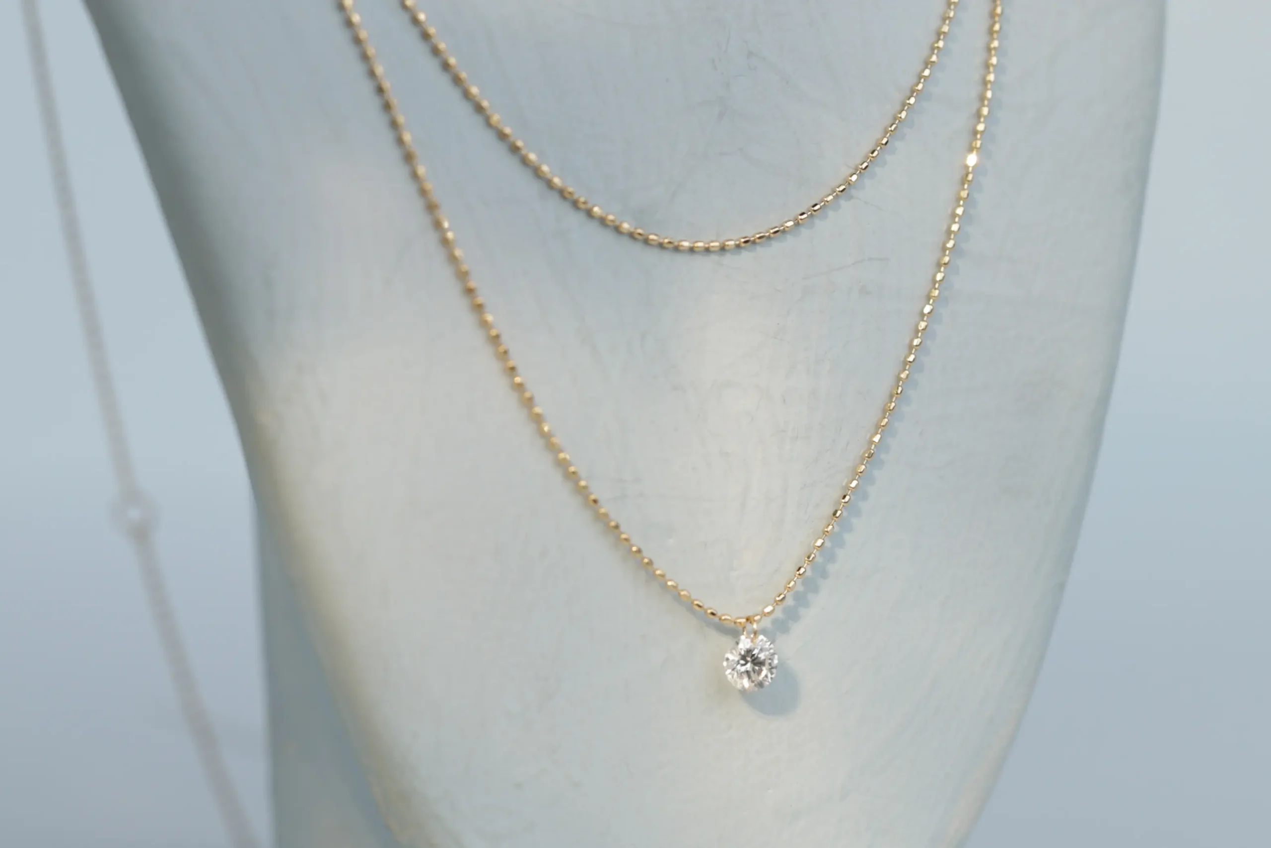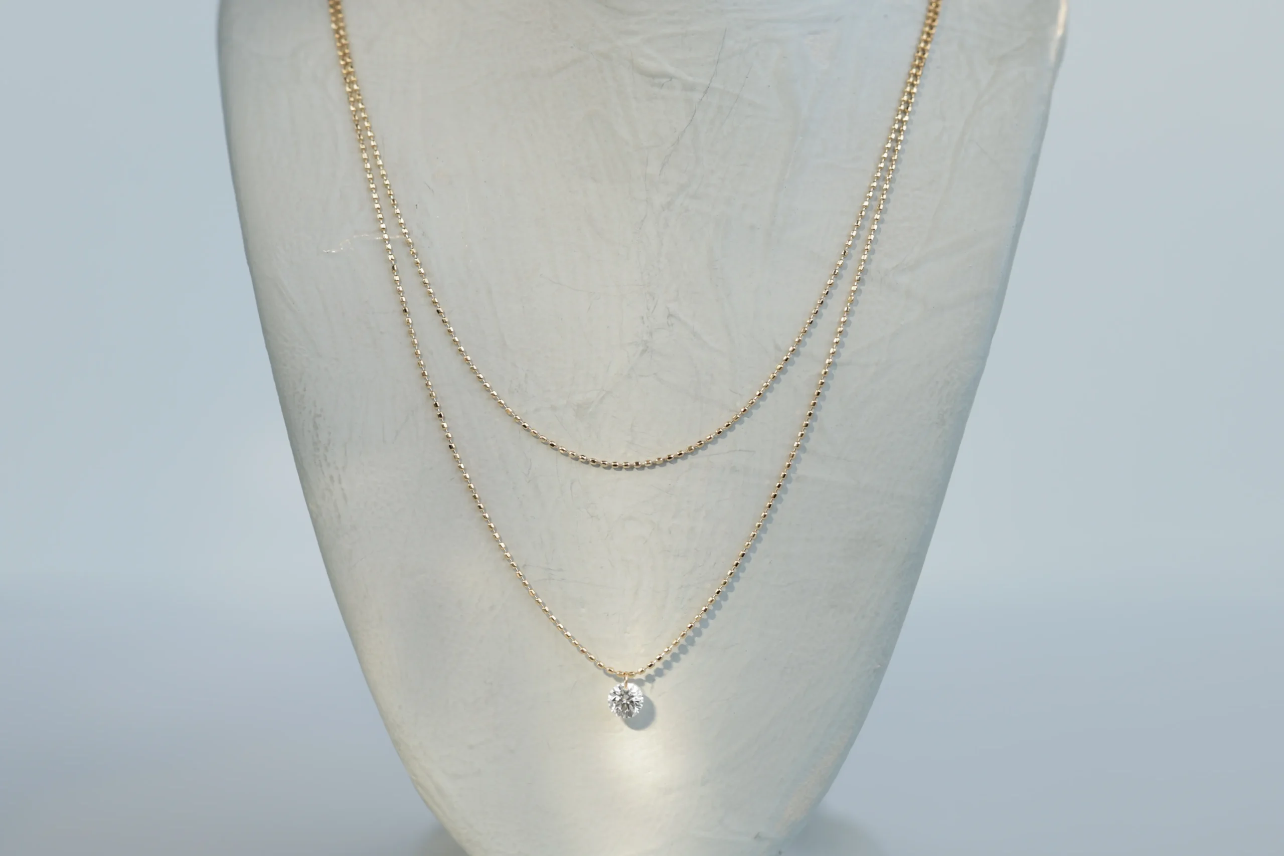 Двойное колье из золота с 1 бриллиантом в огранке «круглая» весом 0,13 карат, цвет 3, чистота 5.