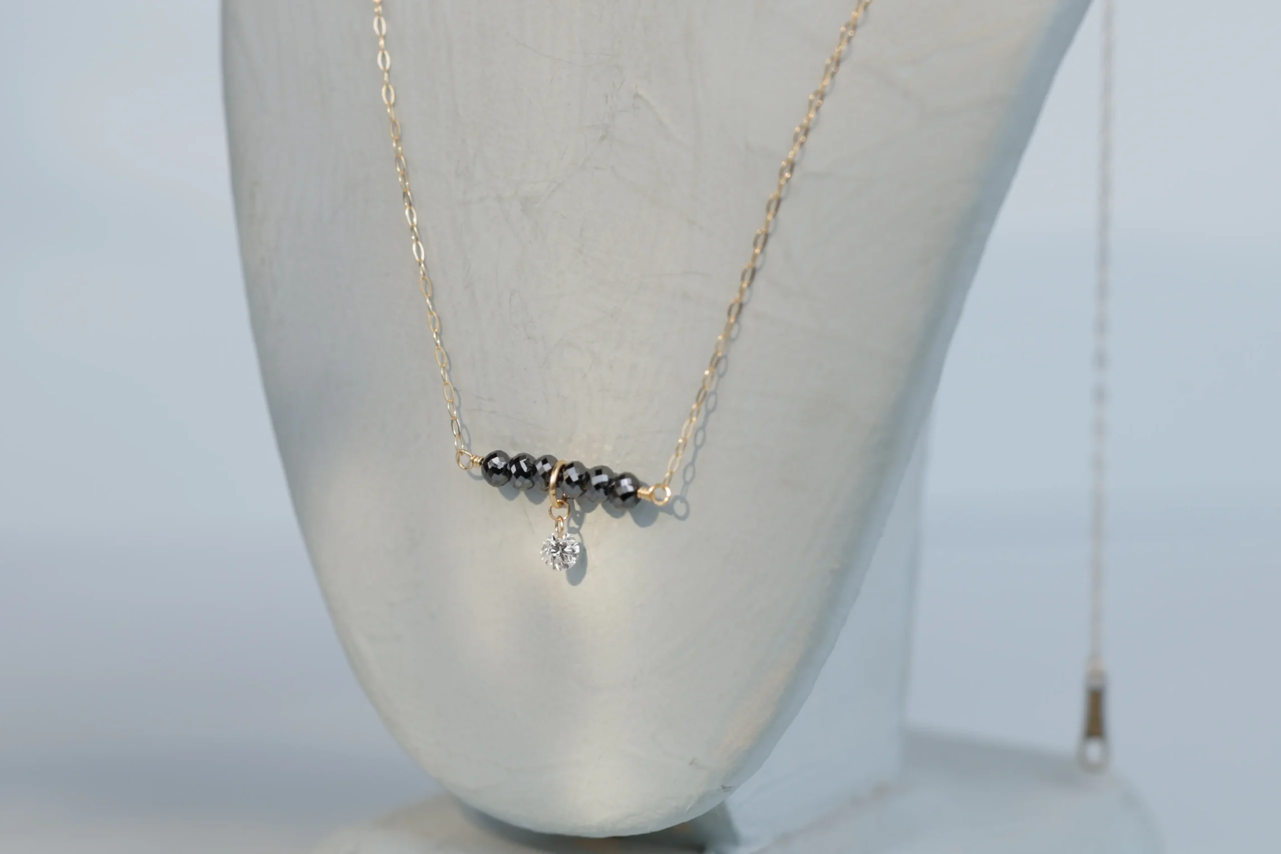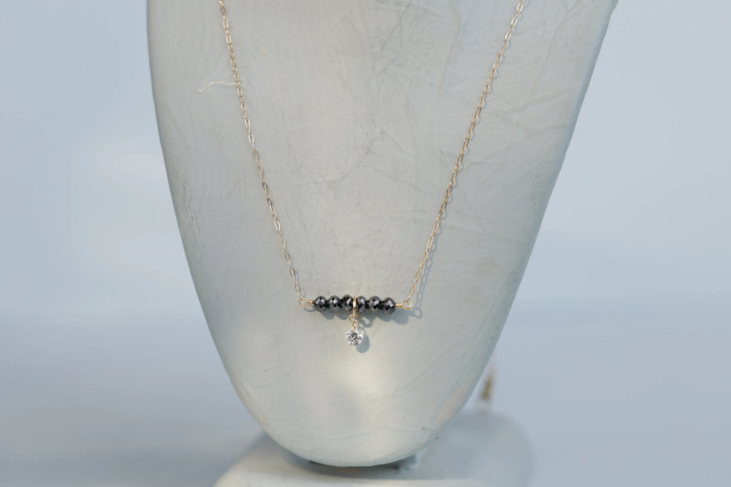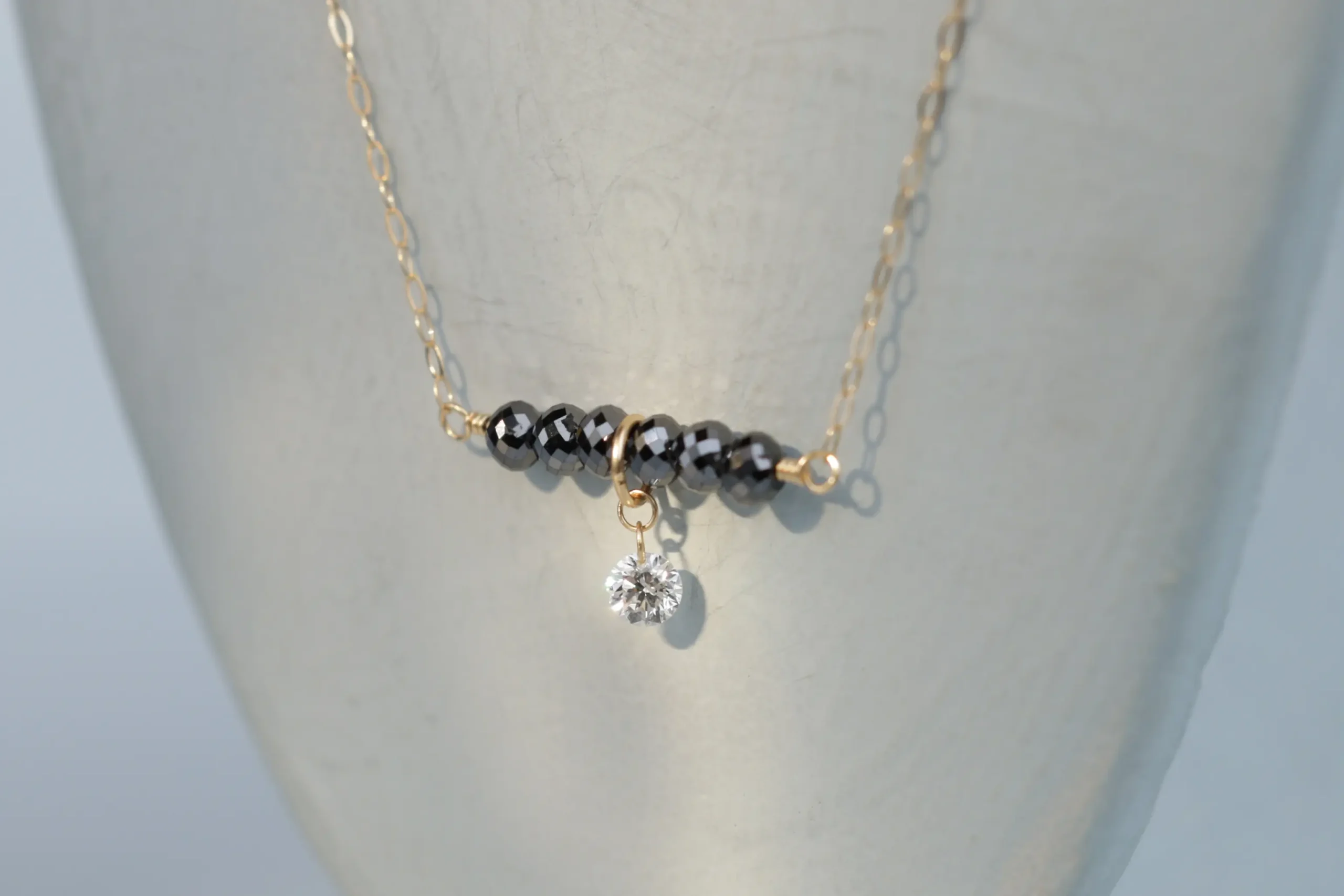 Колье из золота с 6 черными бриллиантами в огранке «круглая» весом 0,80 карат, цвет 8, чистота 9; 1 бриллиантом в огранке «круглая» весом 0,07 карат, цвет 3, чистота 5.
