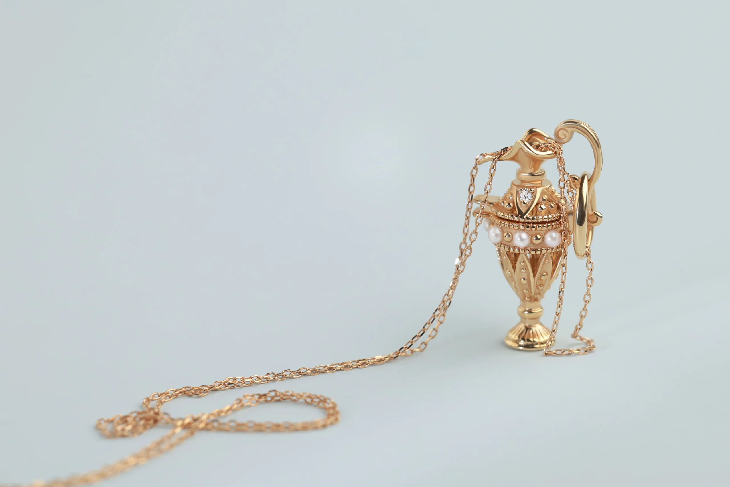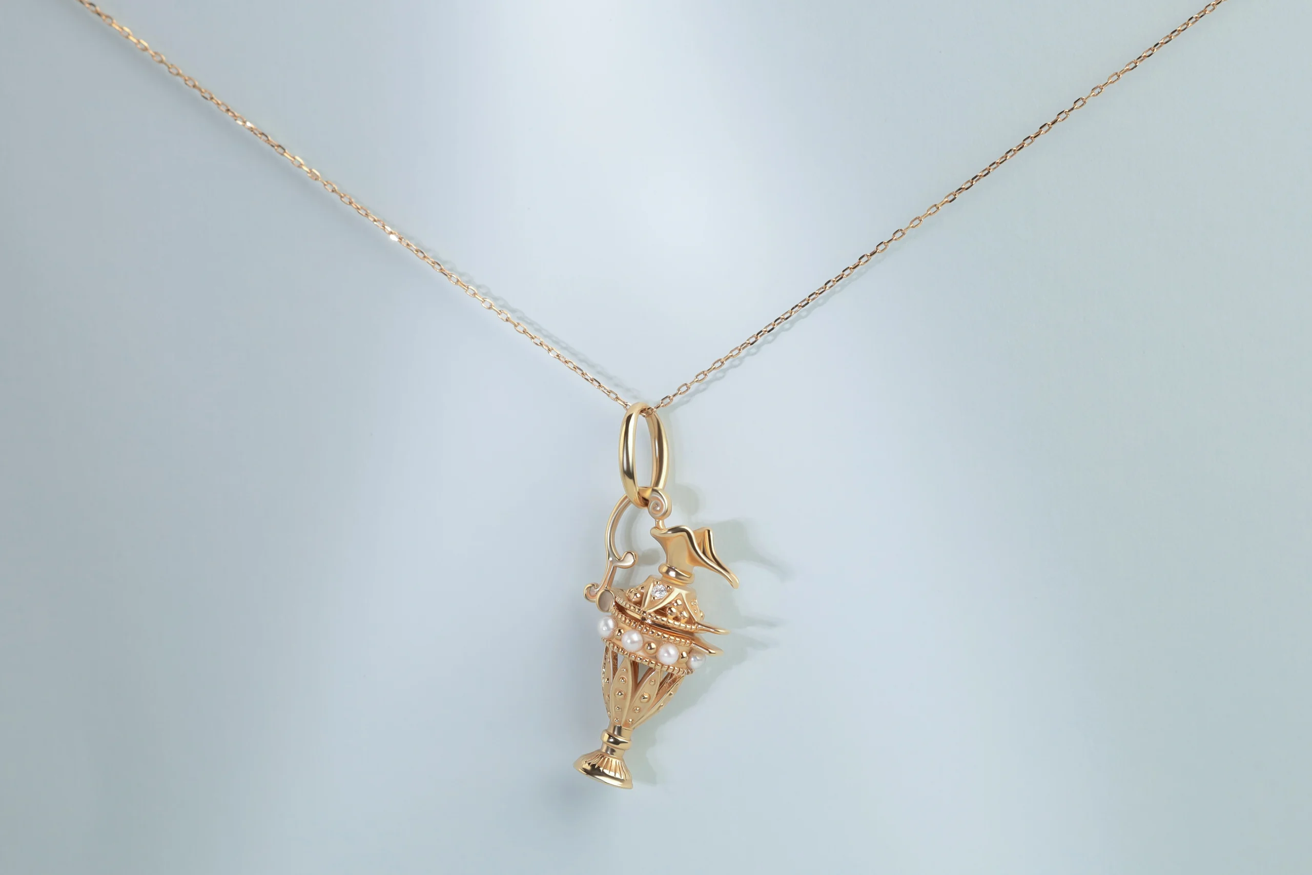Колье с подвеской из золота с 2 бриллиантами в огранке «круглая» весом 0,02 карат, цвет 4, чистота 5; 7 жемчужинами. Размер подвески 20 x 10 мм.