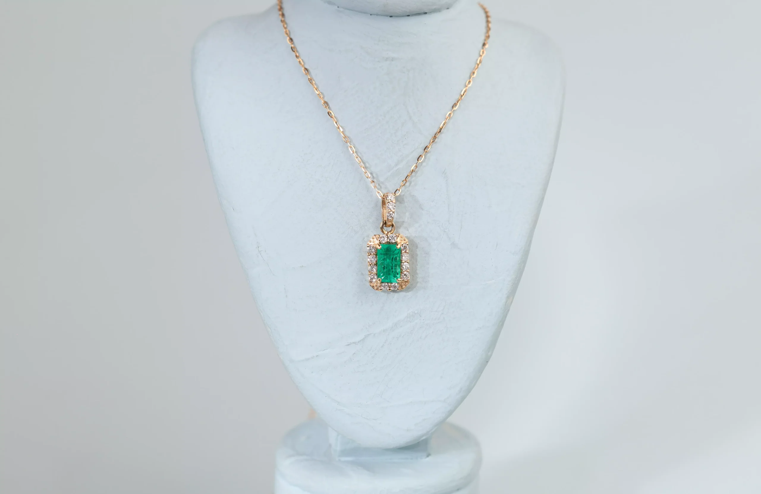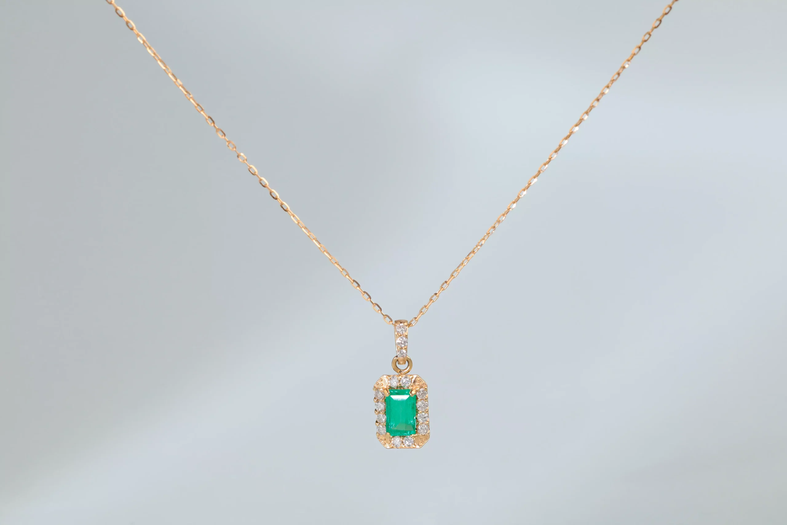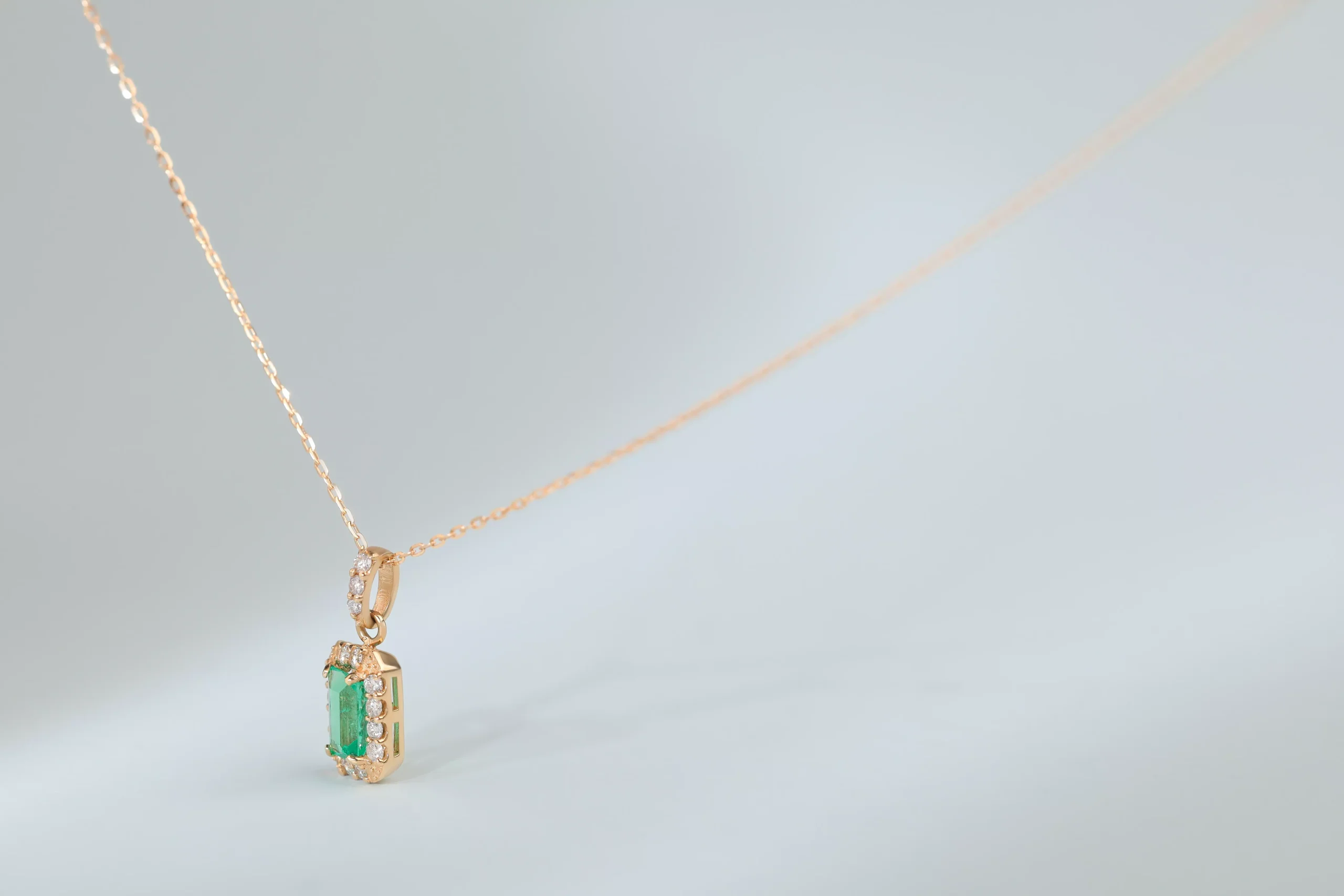 Колье из золота с 15 бриллиантами в огранке «круг» весом 0,08 карат, цвет 3, чистота 5; 1 изумрудом весом 0,21 карат, цвет 3, чистота 3.