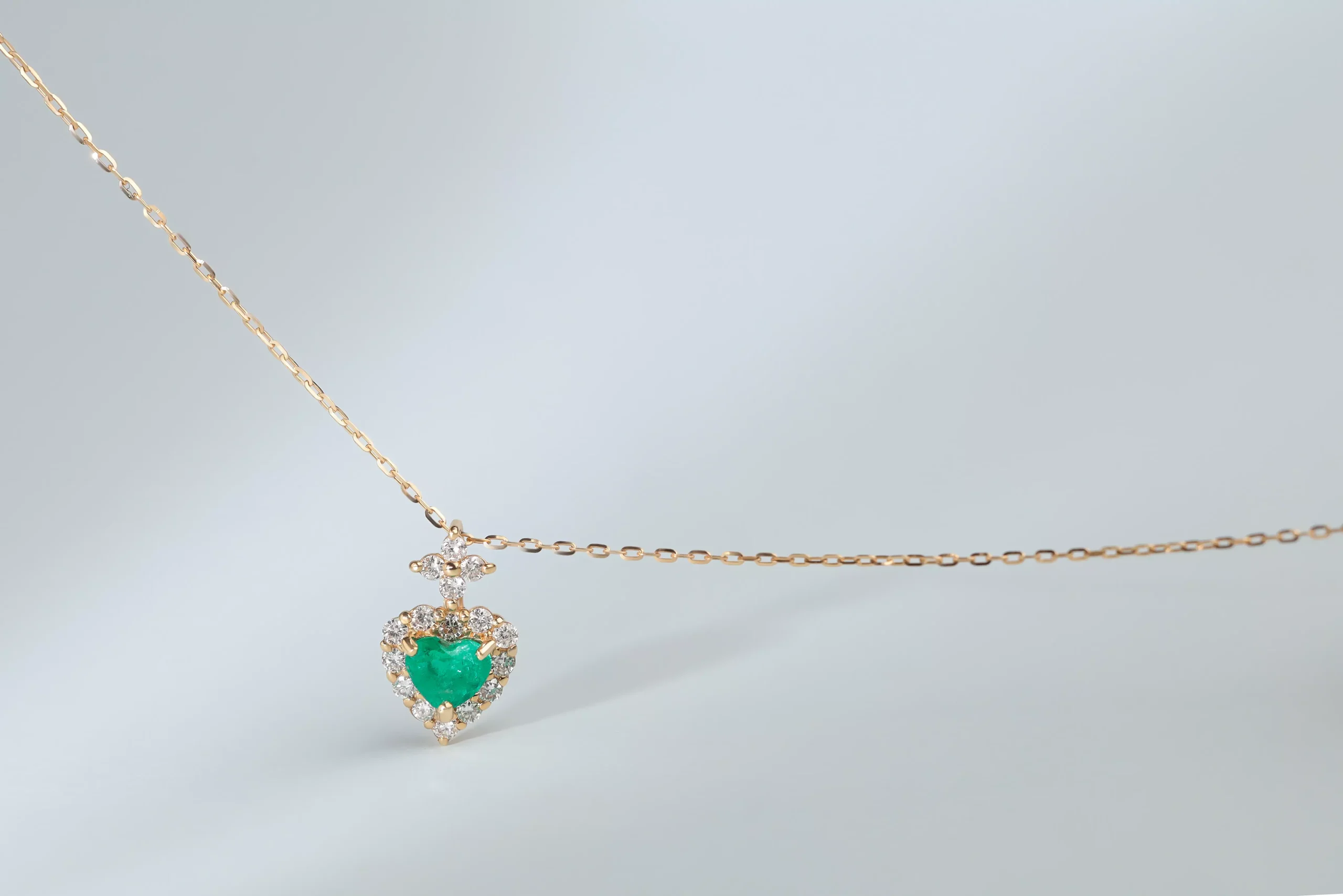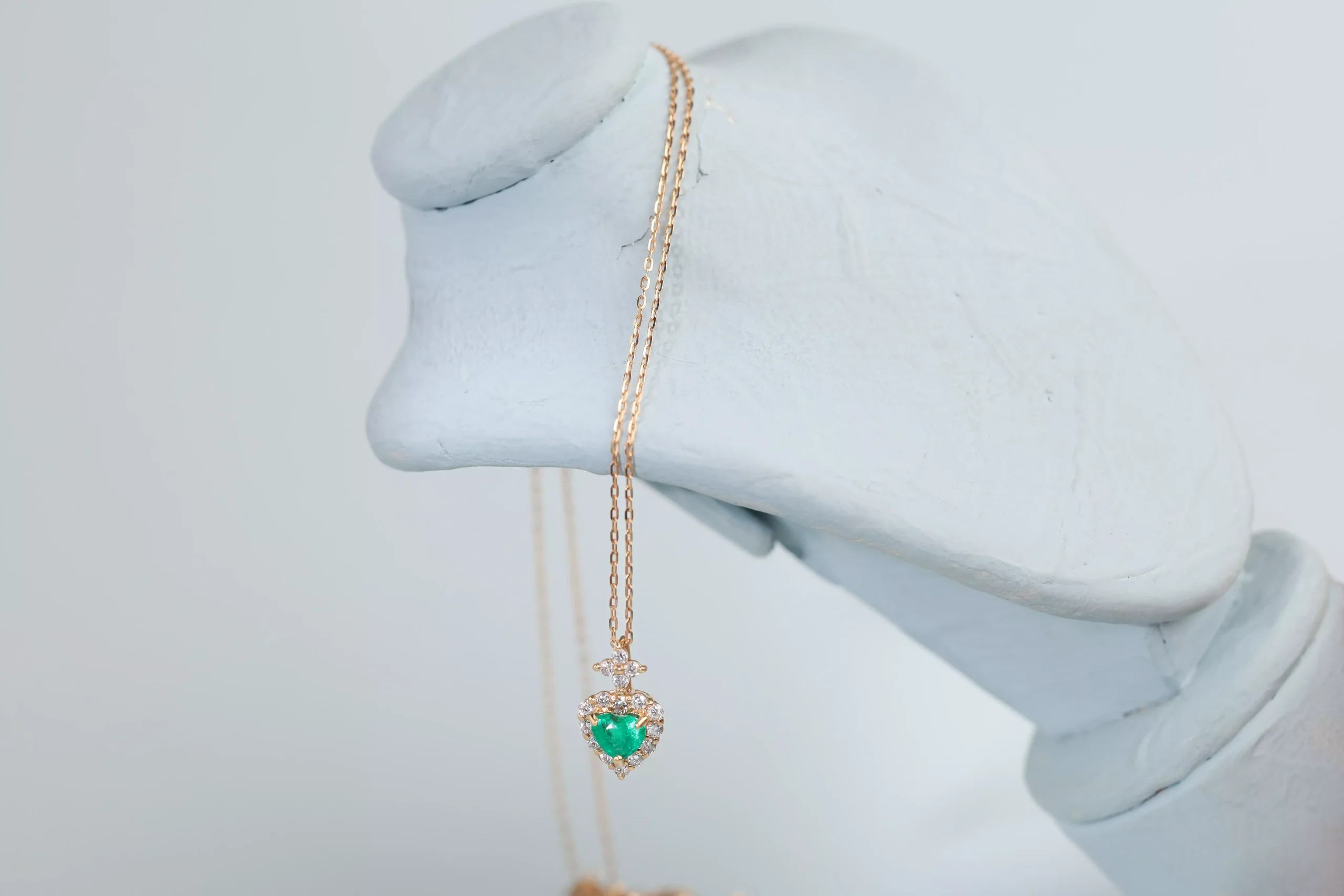 Колье из золота с 16 бриллиантами в огранке «круглая» весом 0,16 карат, цвет 3, чистота 4; 1 изумрудом в огранке «сердце» весом 0,10 карат, цвет 3, чистота 3.