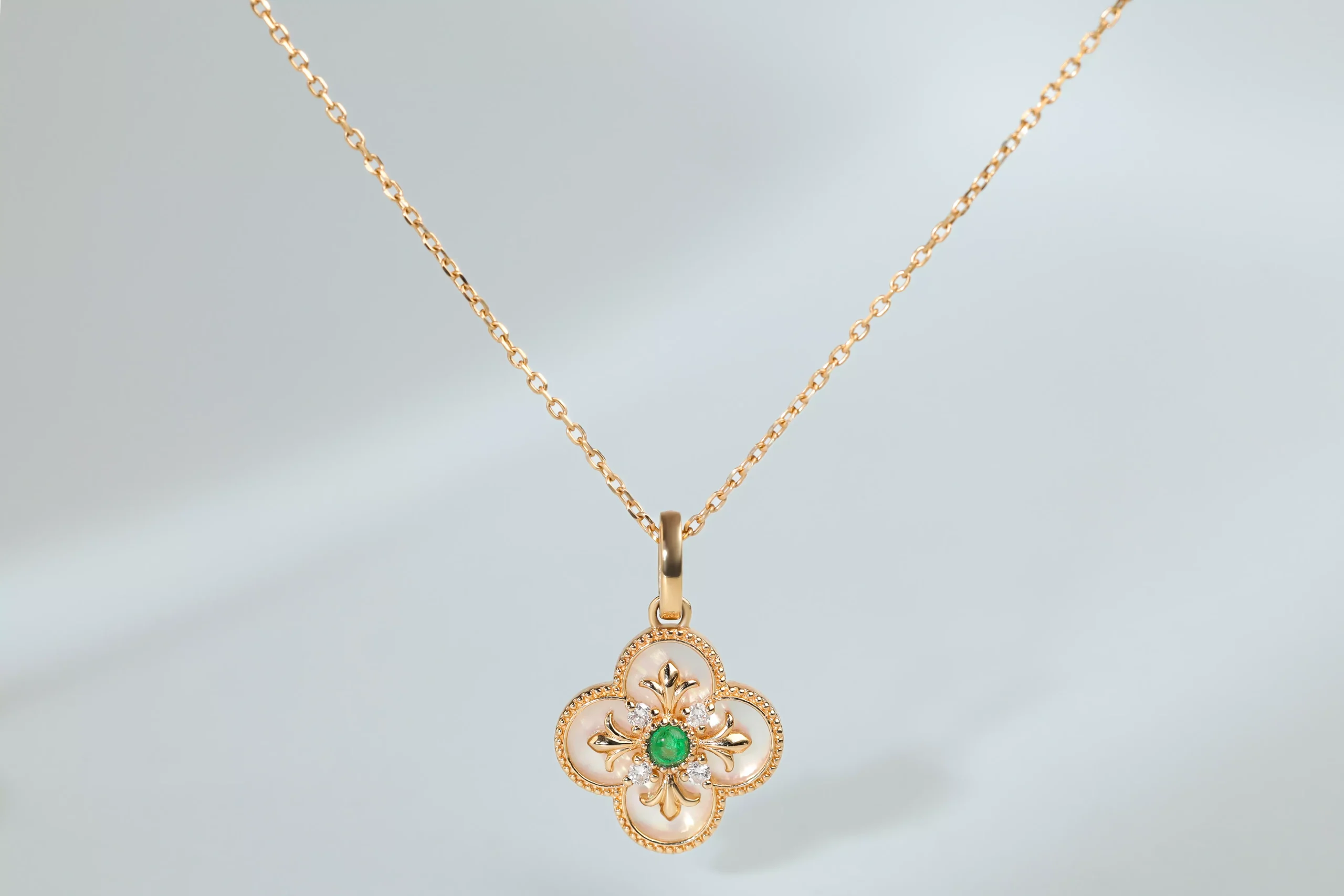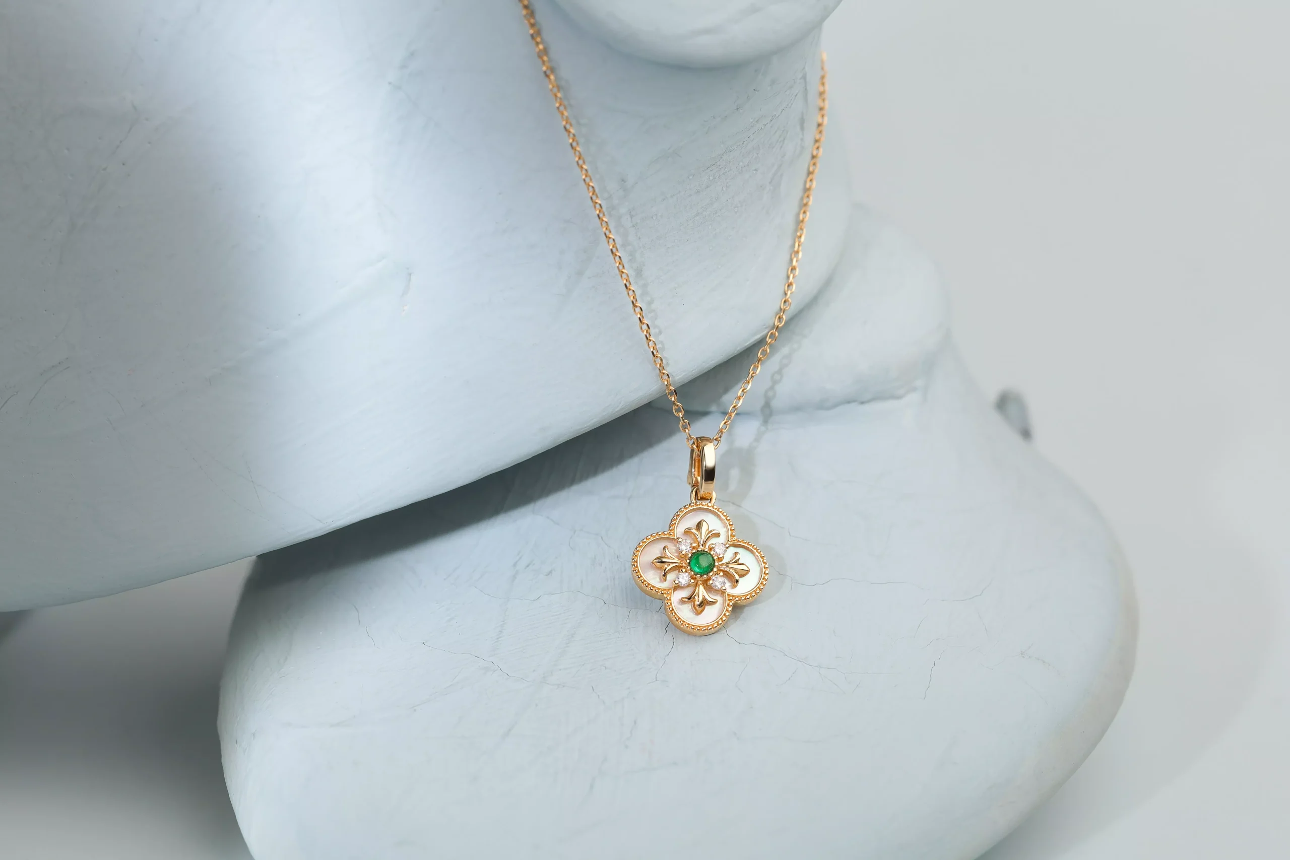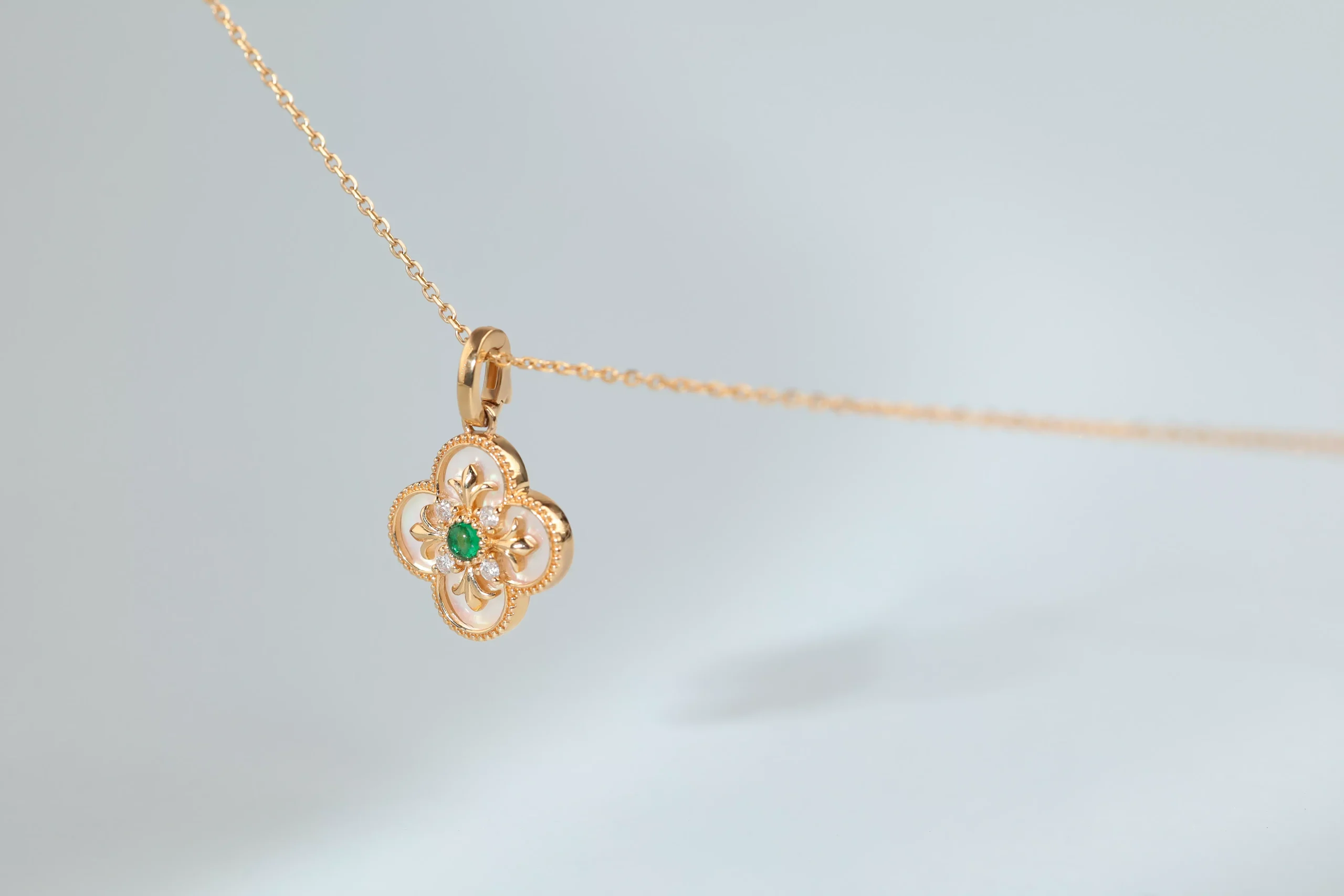 Колье из золота с 4 бриллиантами в огранке «круглая» весом 0,05 карат, цвет 4, чистота 5; 1 изумрудом весом 0,04 карат, цвет 2, чистота 2; перламутром.