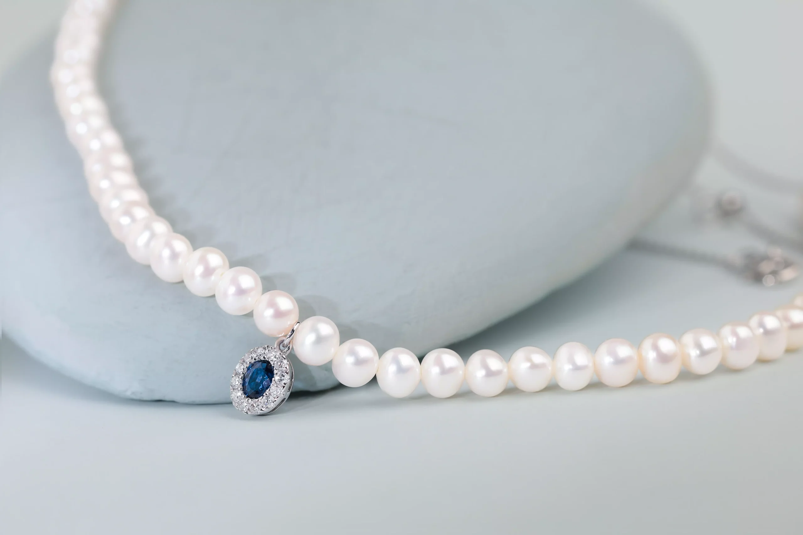 Колье из золота с 1 сапфиром весом 0,15 карат, цвет 2, чистота 2; 12 бриллиантами в огранке «круглая» весом 0,10 карат, цвет 3, чистота 5; 50 жемчужинами.