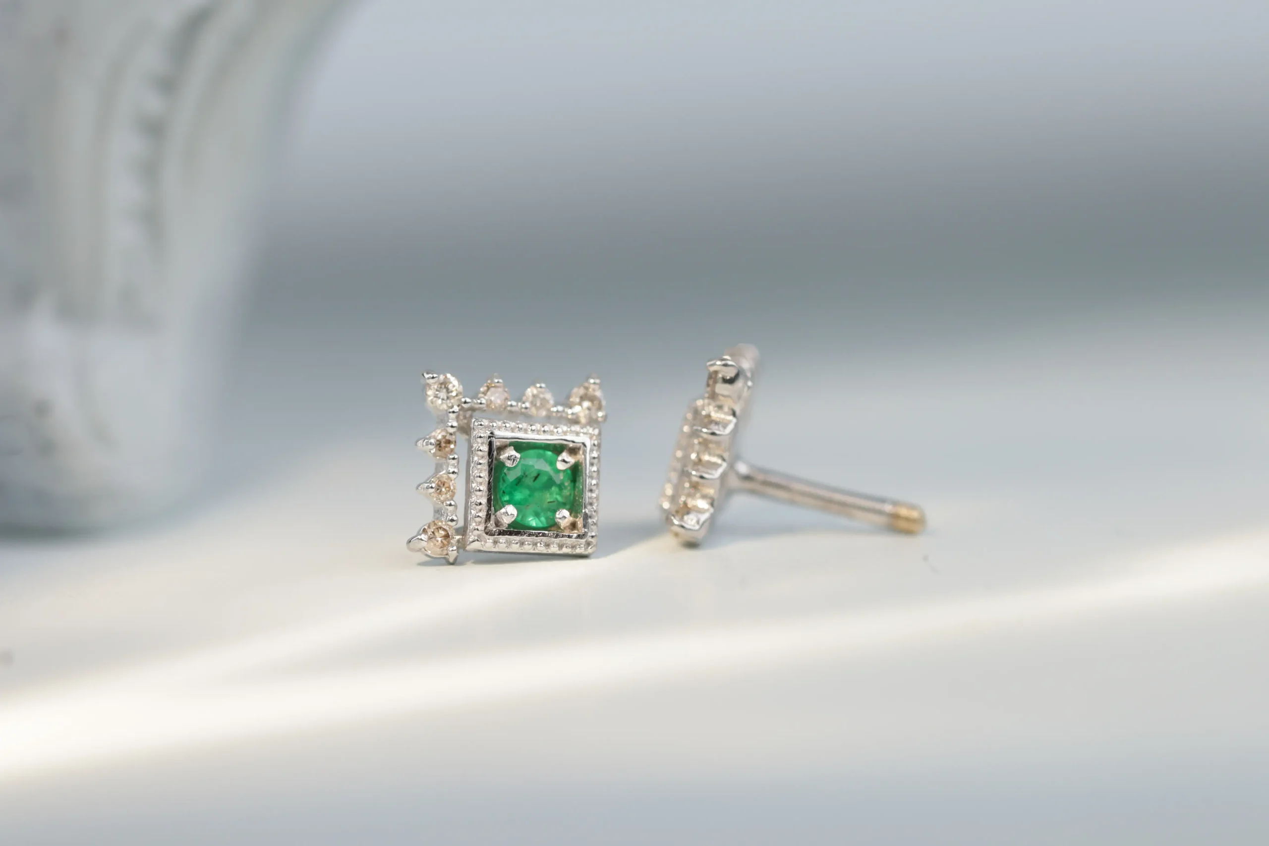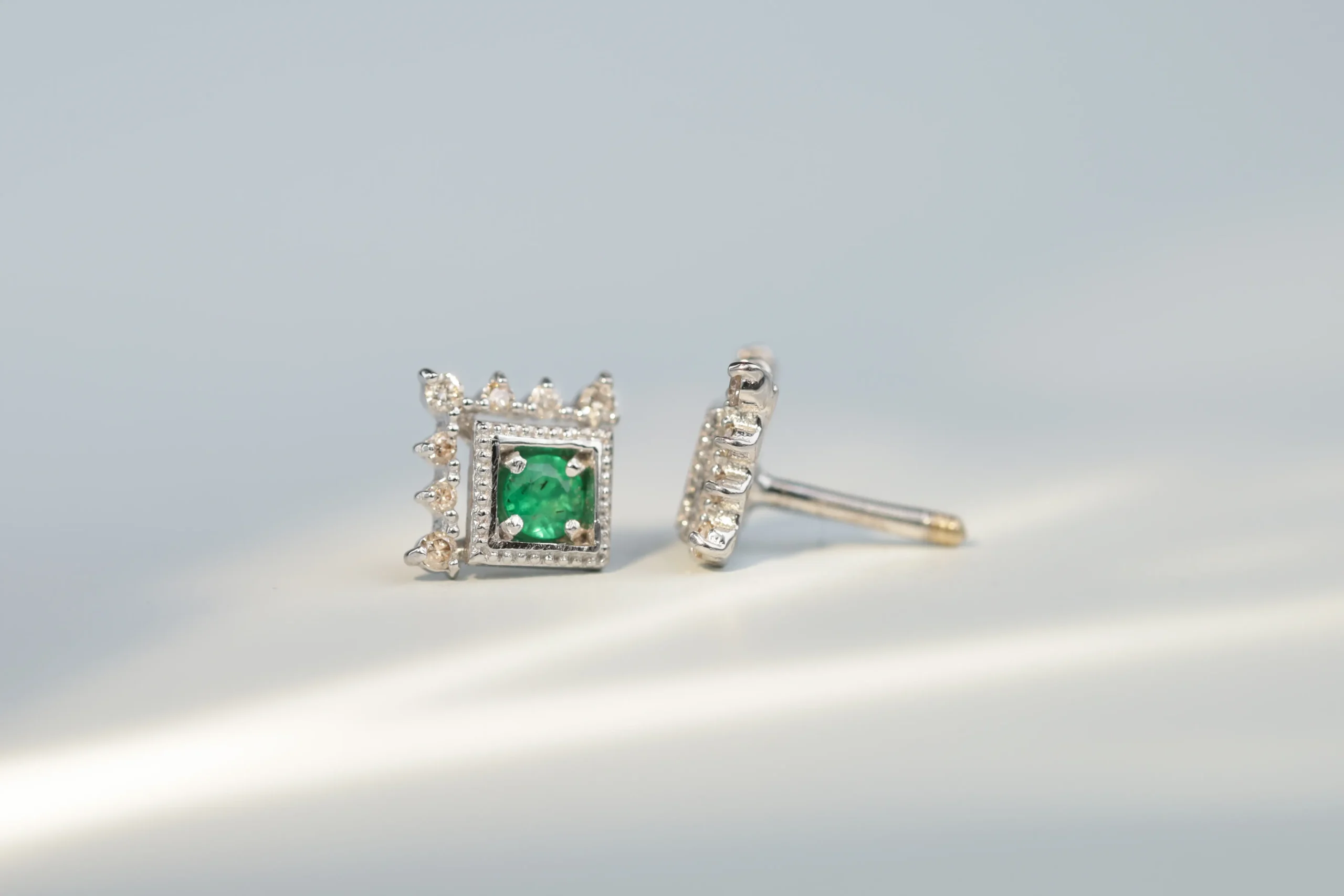 Серьги из золота с 2 изумрудами весом 0,15 карат, цвет 2, чистота 2; 14 бриллиантами в огранке «круглая» весом 0,08 карат, цвет 5, чистота 6.
