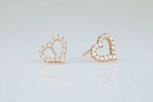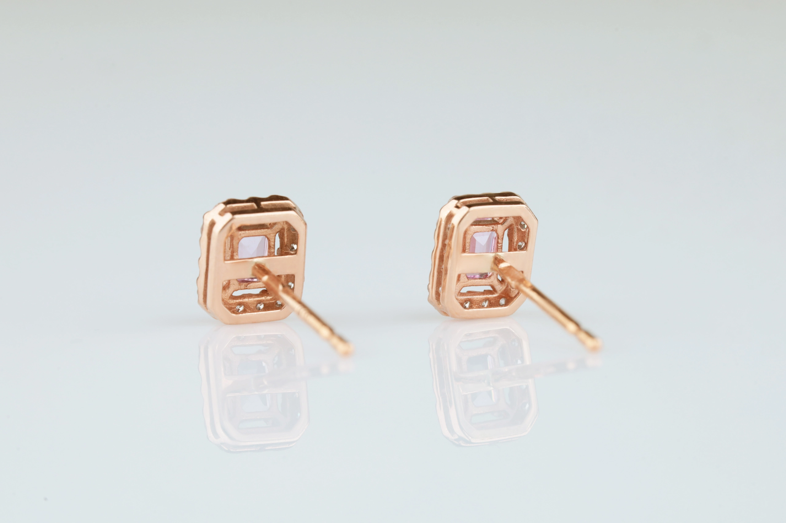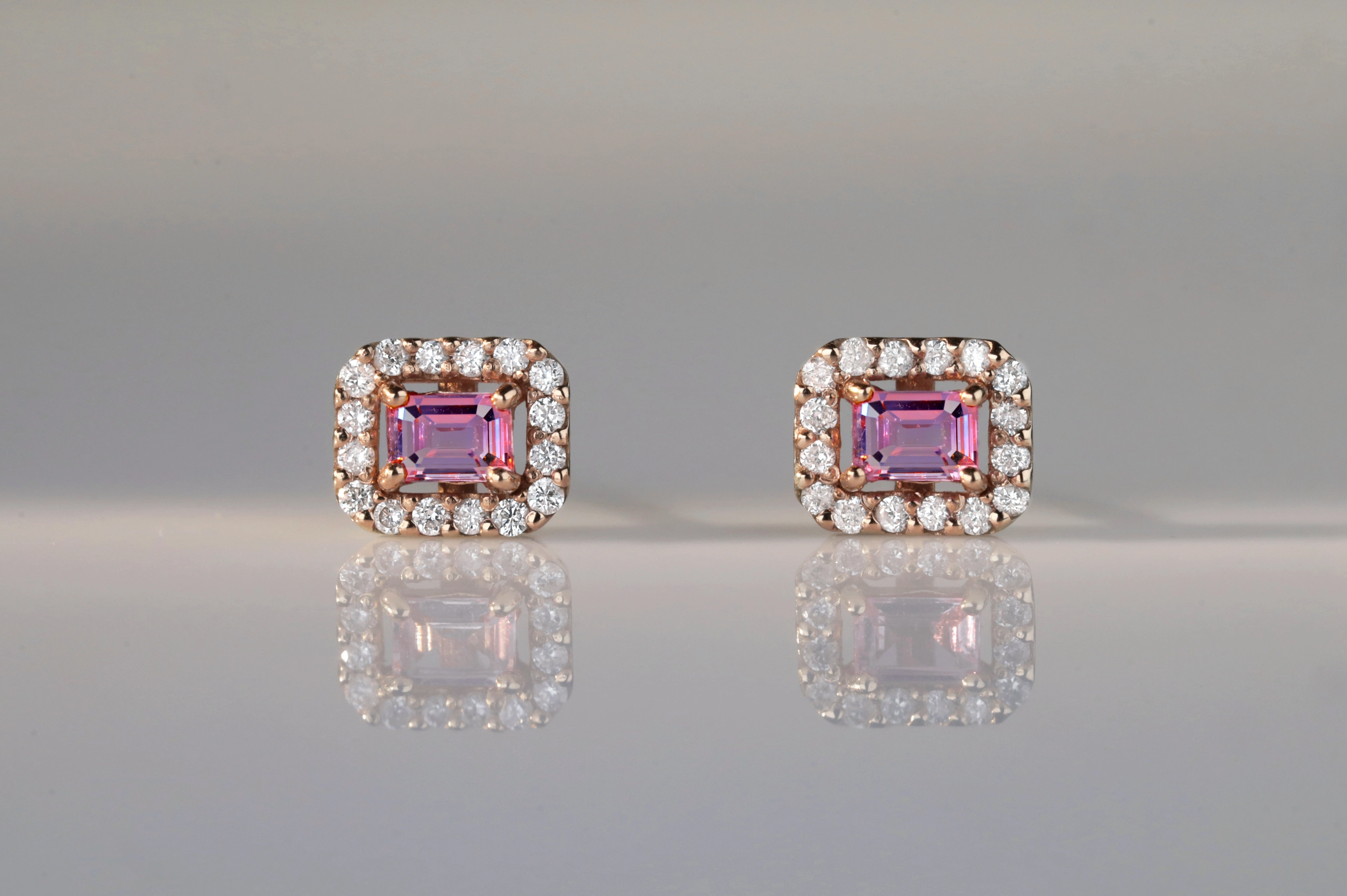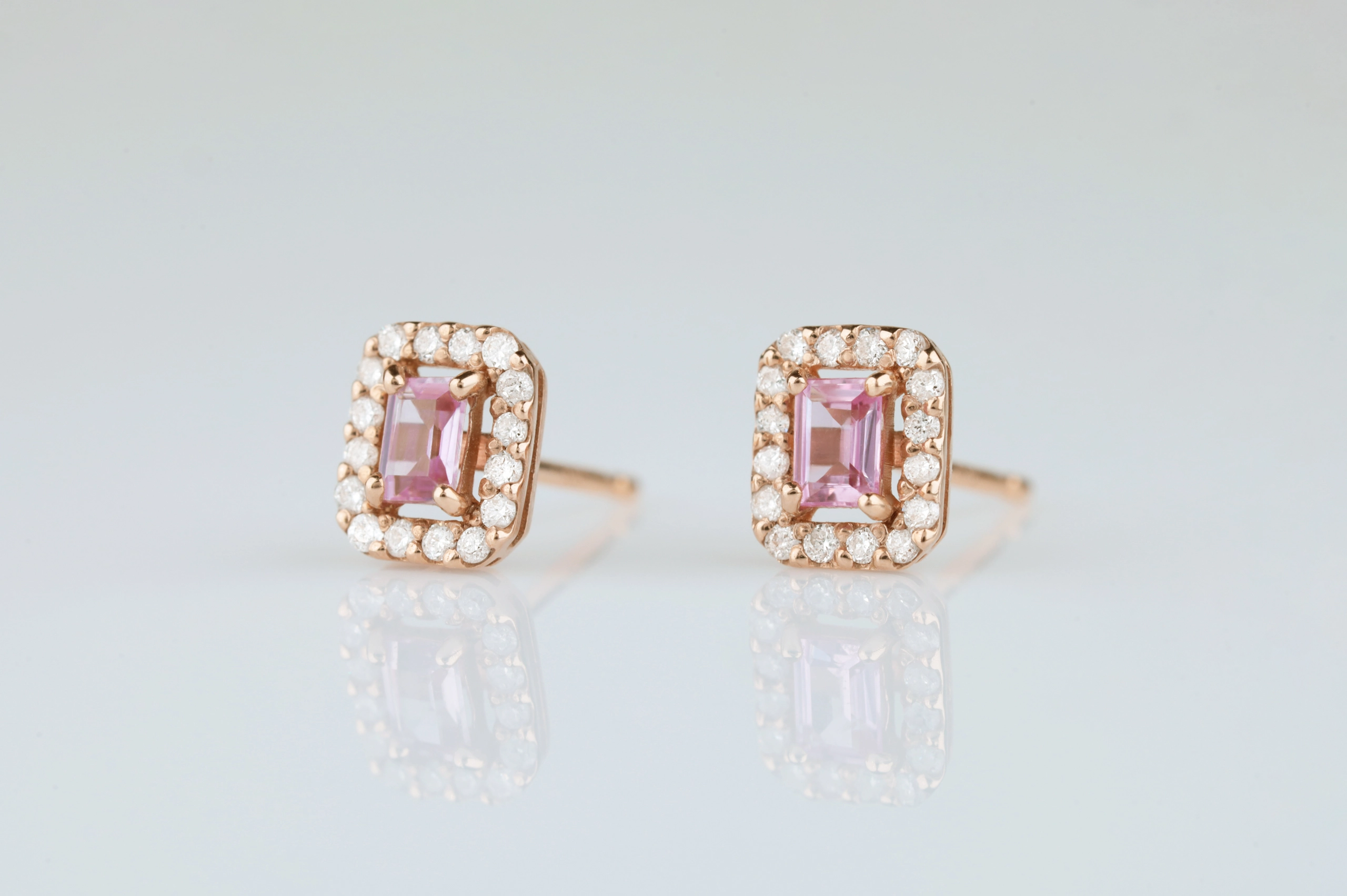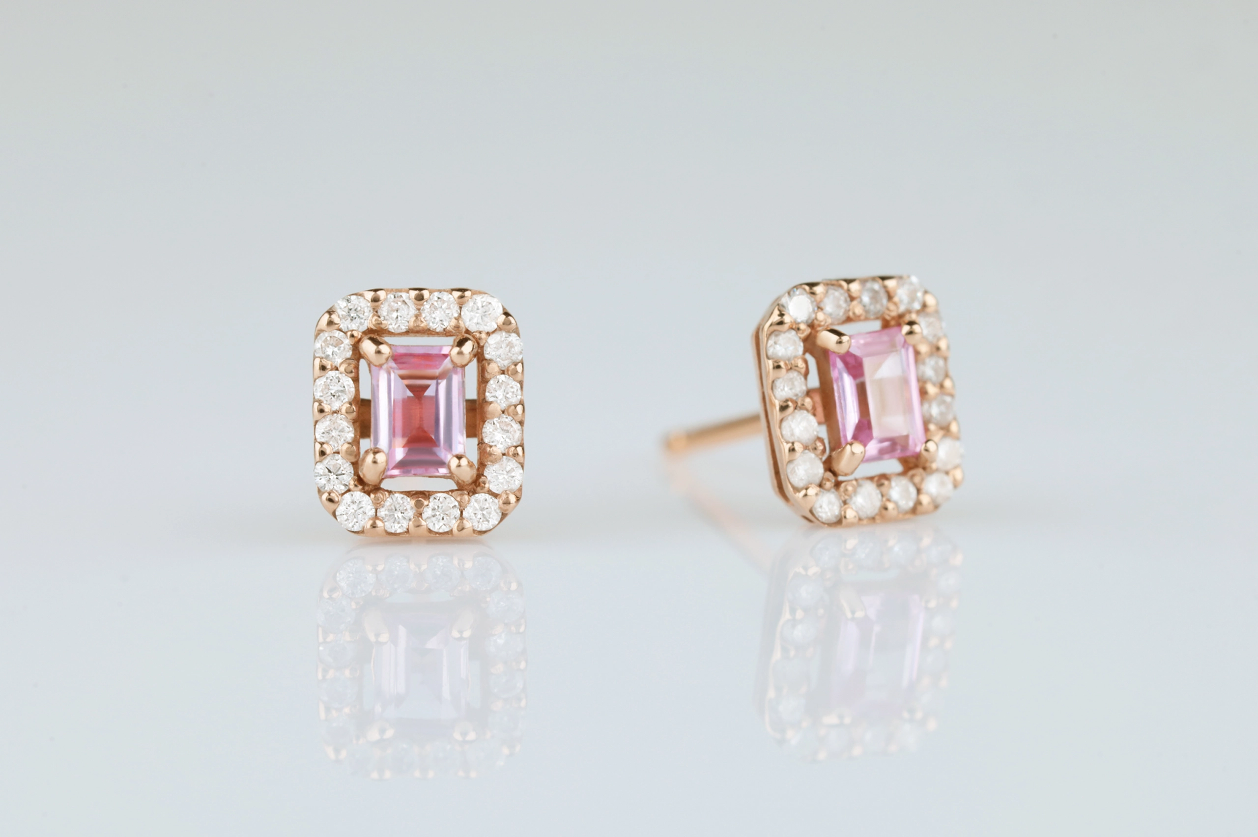 Золотые серьги общим весом 1,43 гр с 2 розовыми сапфирами 0,32 кт; 32 бриллиантами в огранке «круглая» 0,16 кт, цвет 4, чистота 5.