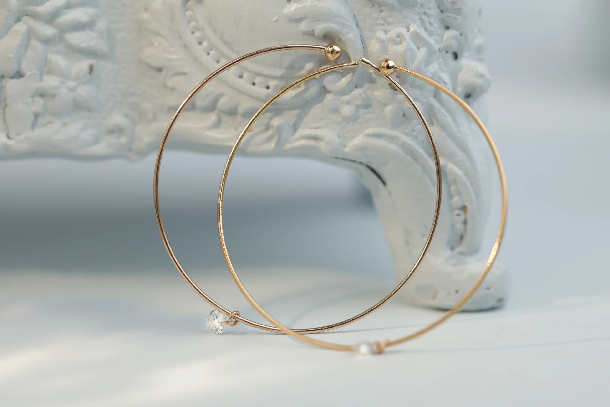 Серьги из золота с 2 бриллиантами в огранке «круглая» весом 0,14 карат, цвет 3, чистота 5. Диаметр 32 мм.