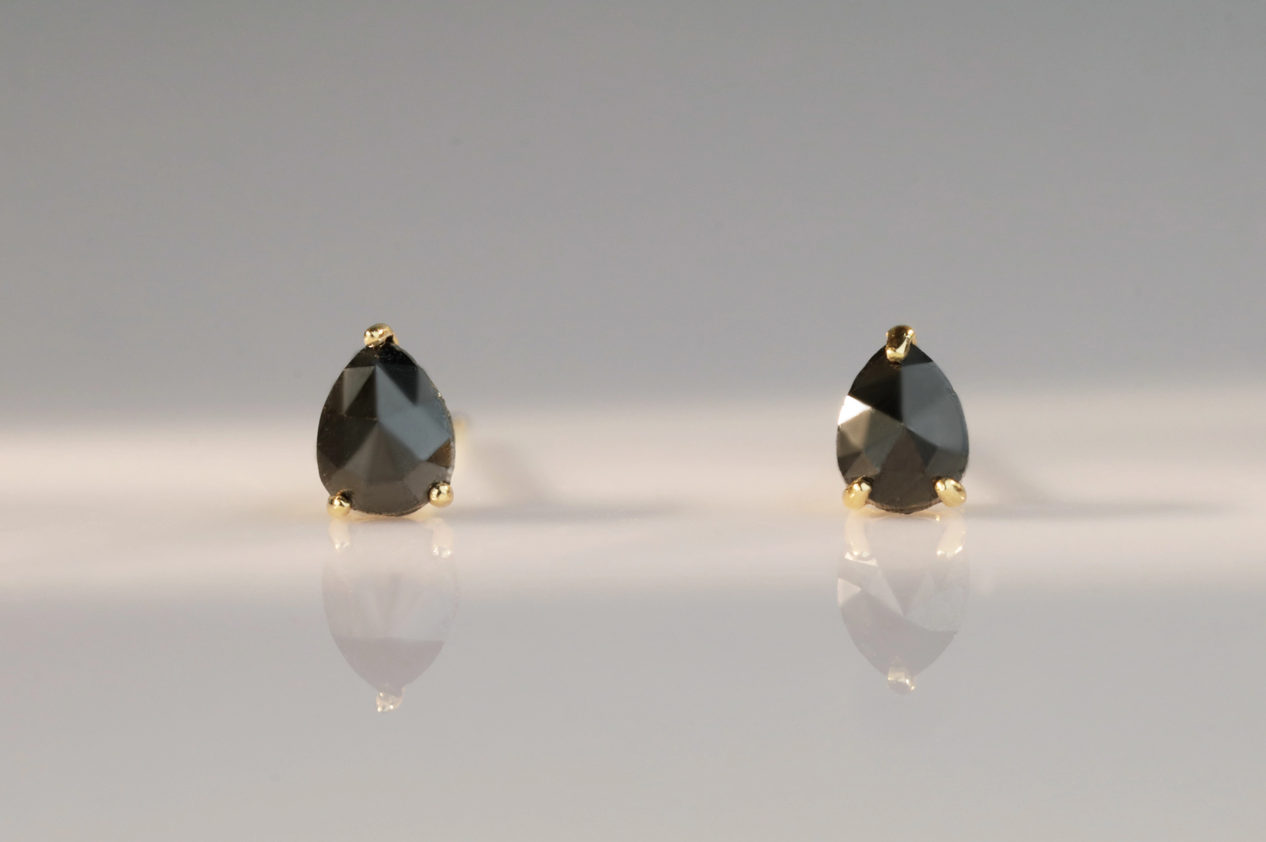 Золотые серьги общим весом 0,5367 гр с 2 черными бриллиантами в огранке «груша» 0,42 кт.