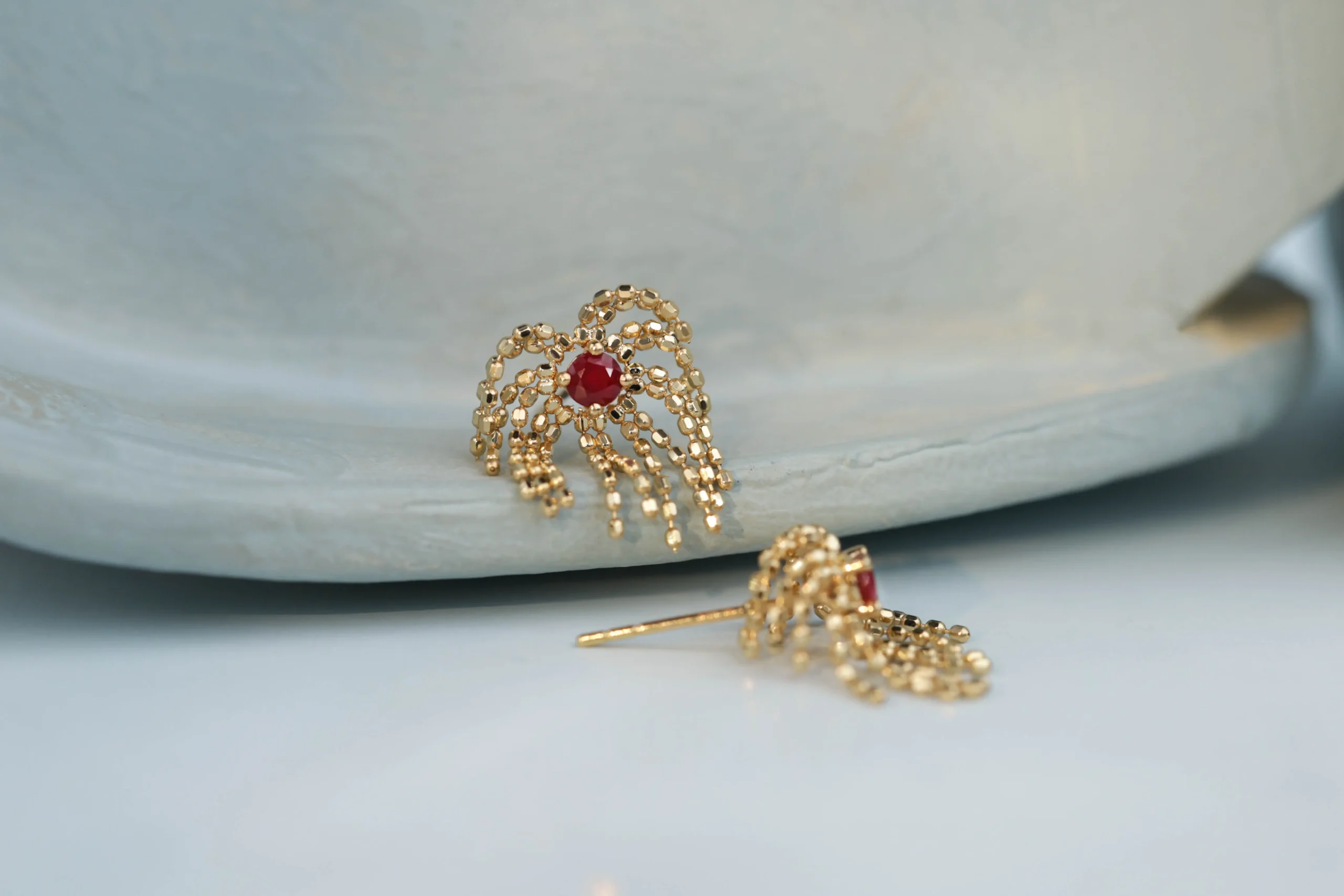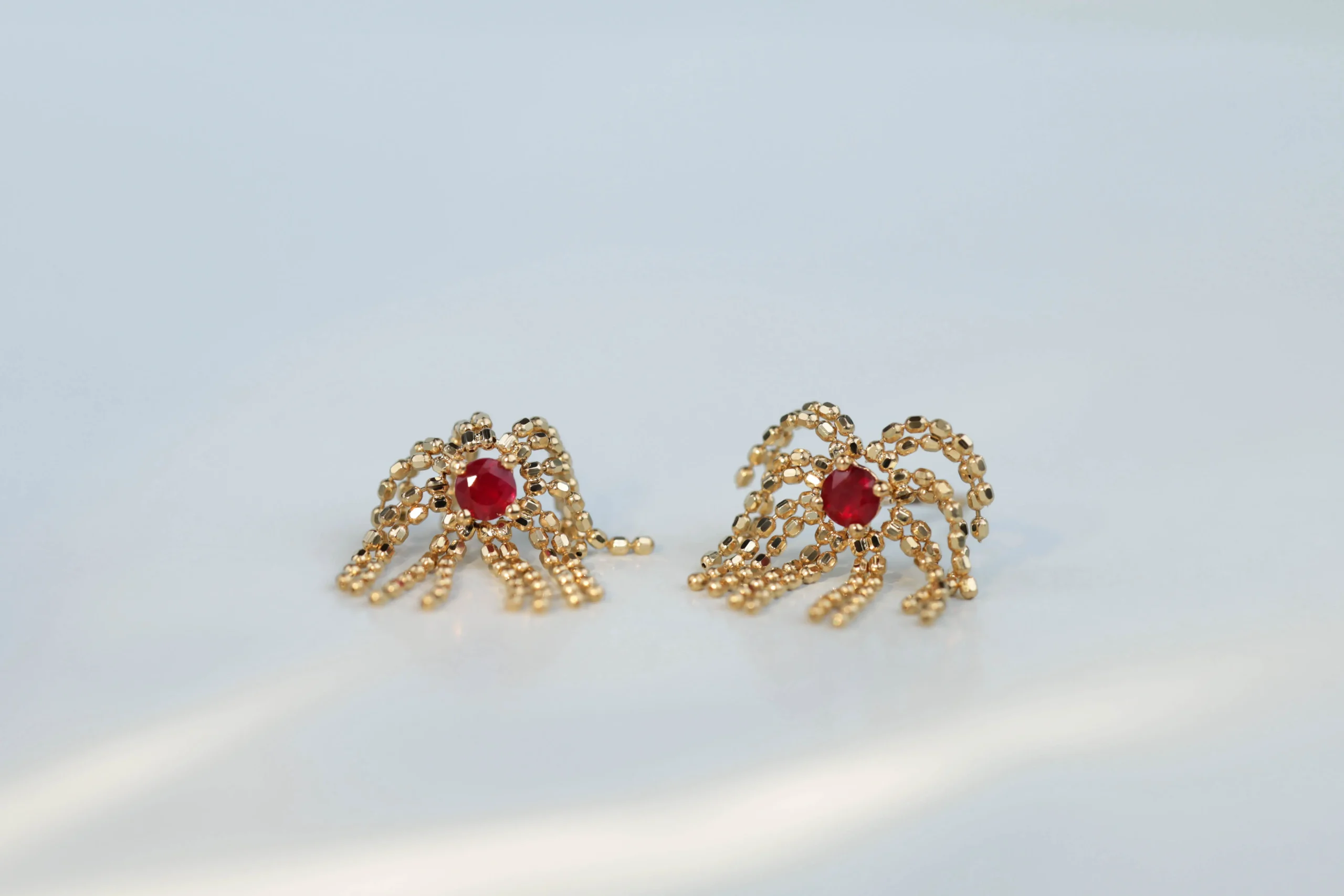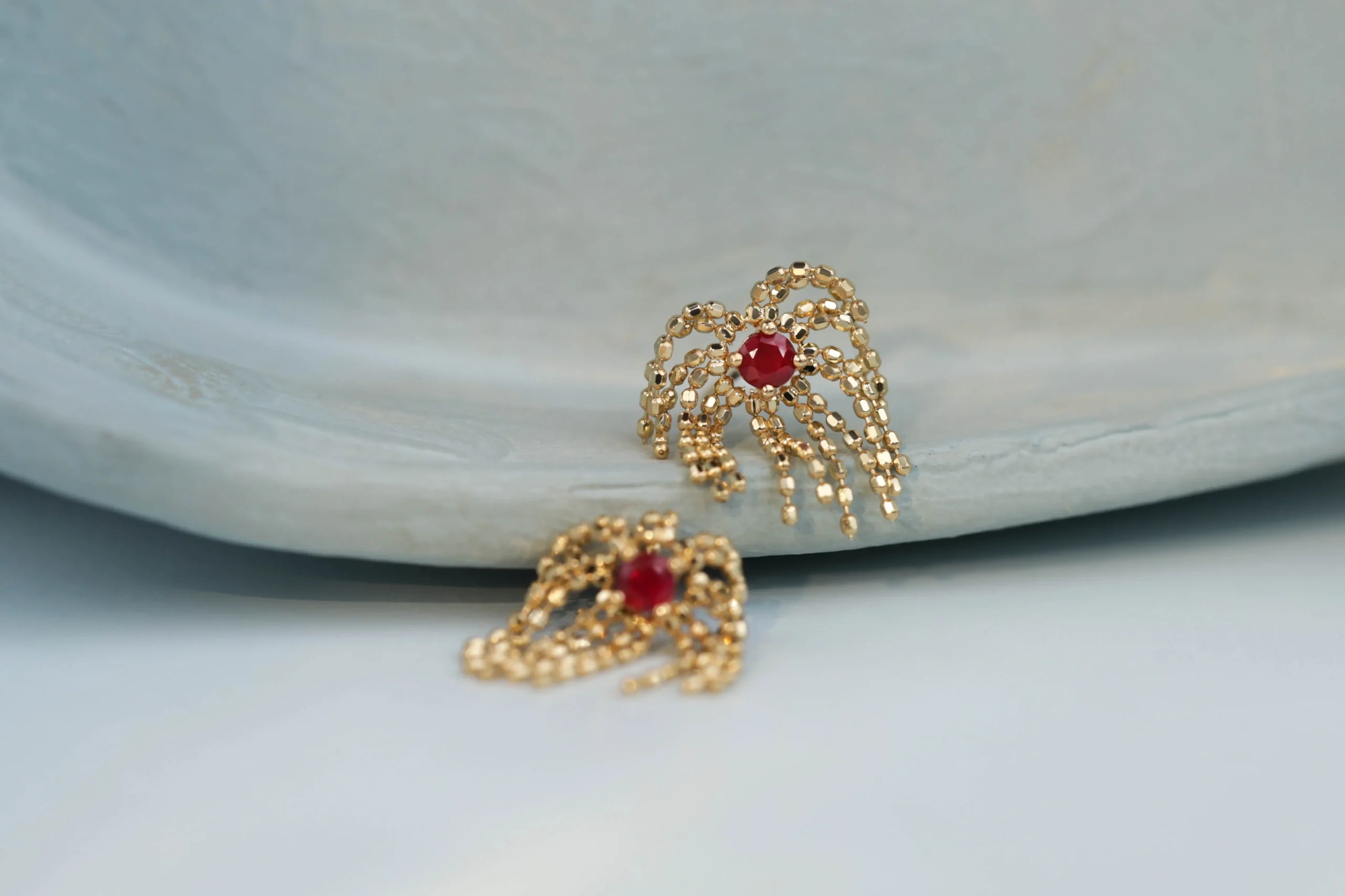 Серьги из золота с 2 рубинами весом 0,18 карат, цвет 2, чистота 2. Размер 11 x 15 мм.