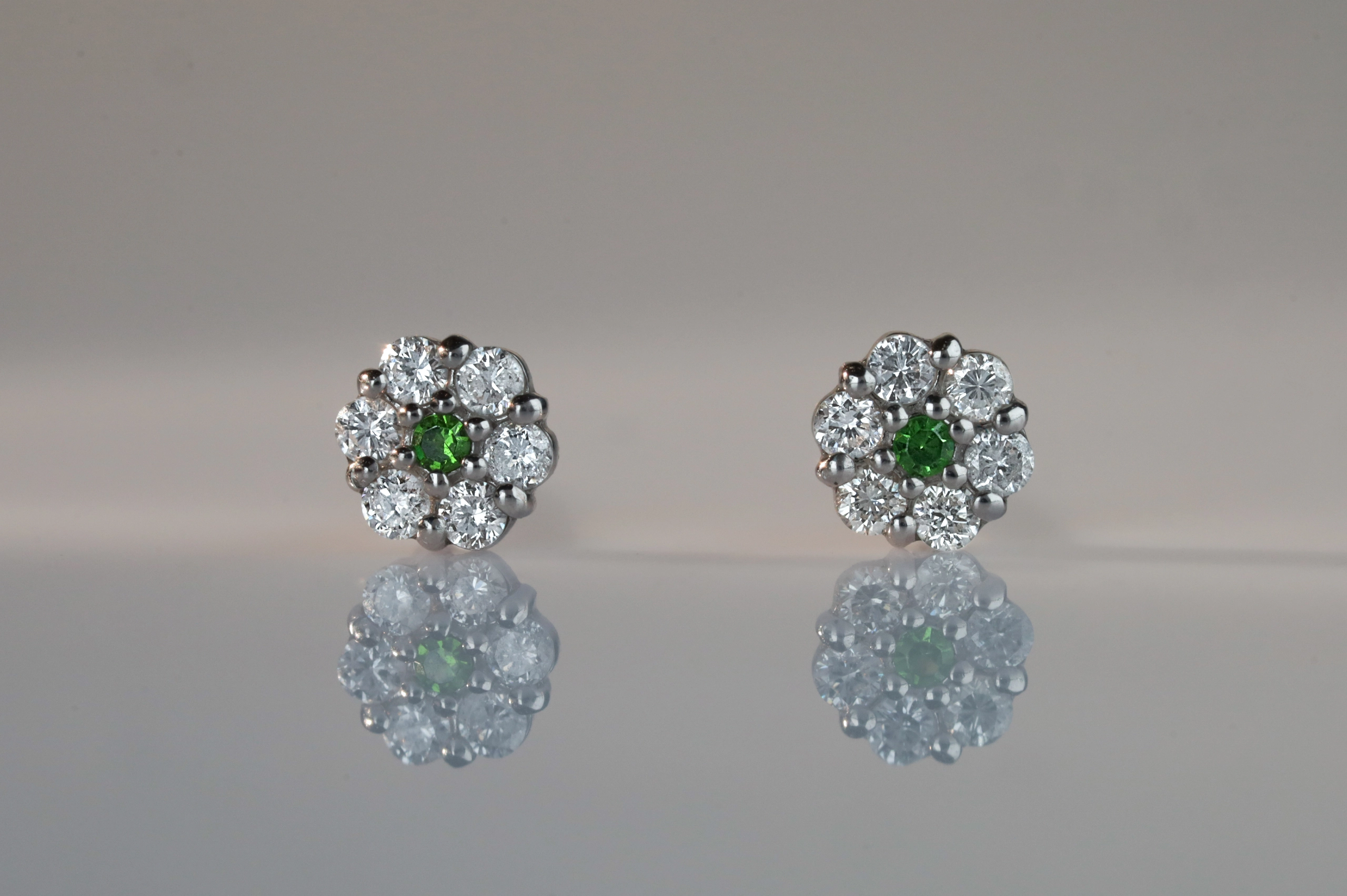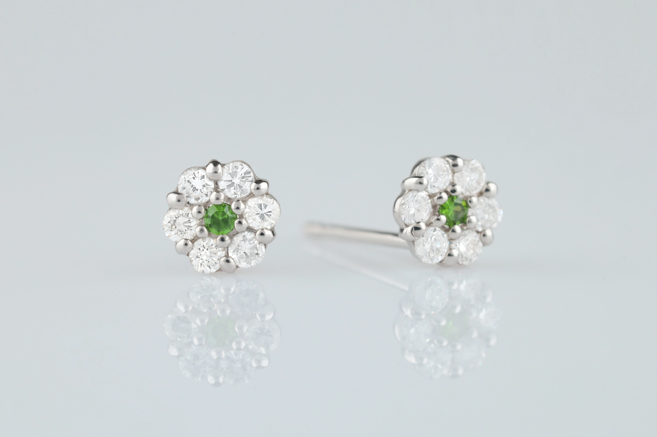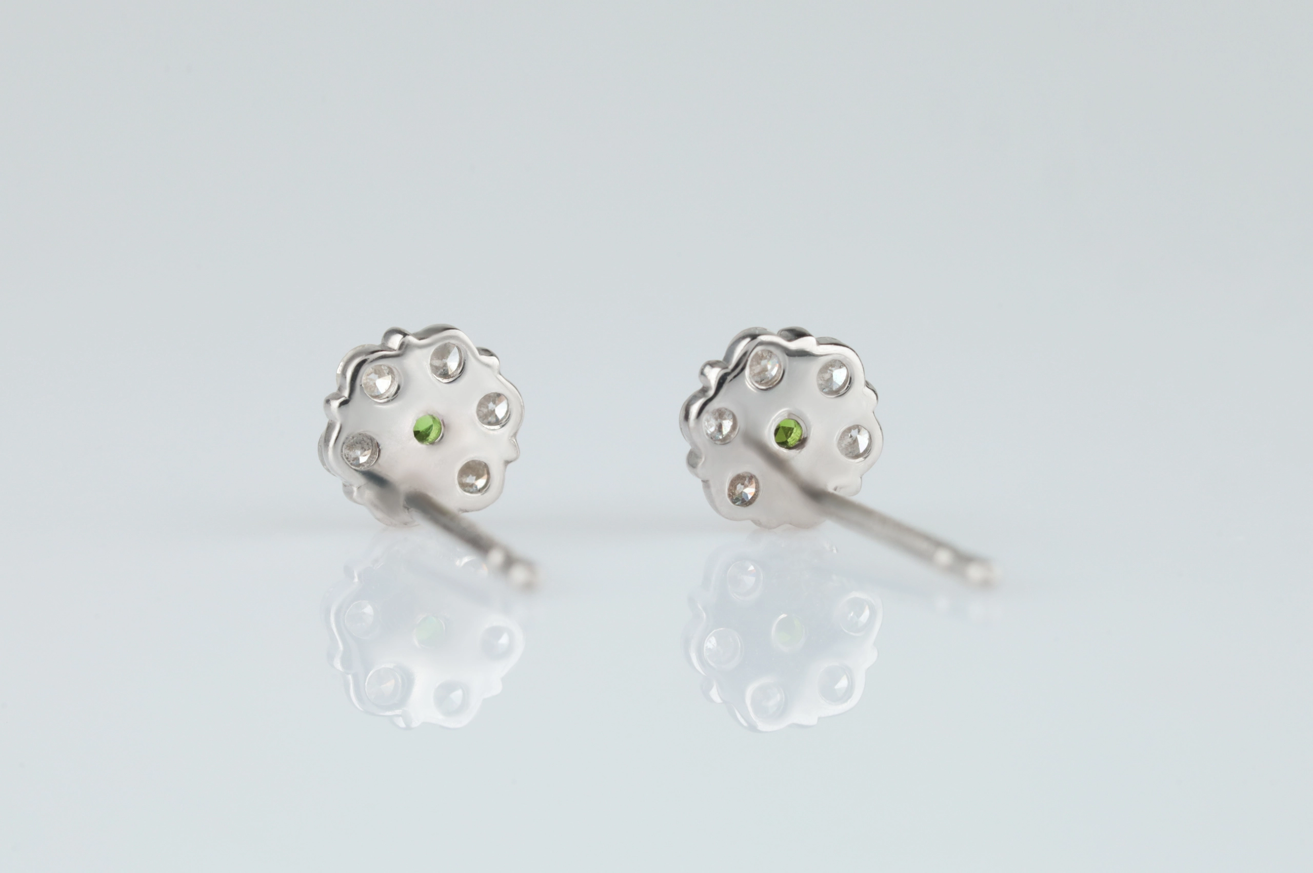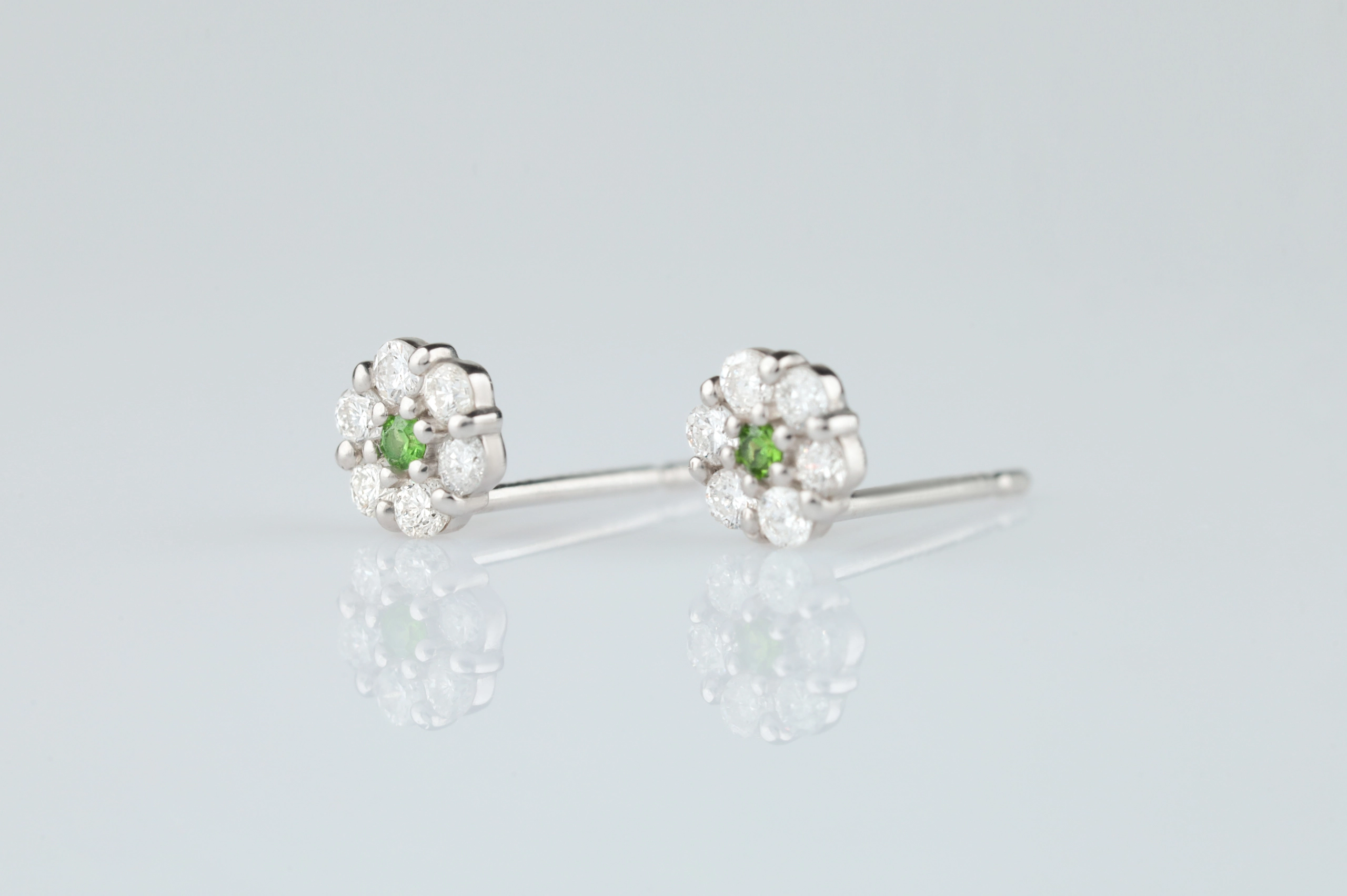 Серьги из платины с 12 бриллиантами в огранке «круглая» весом 0,14 карат, цвет 4, чистота 5; 1 зеленым гранатом весом 0,02 карат.