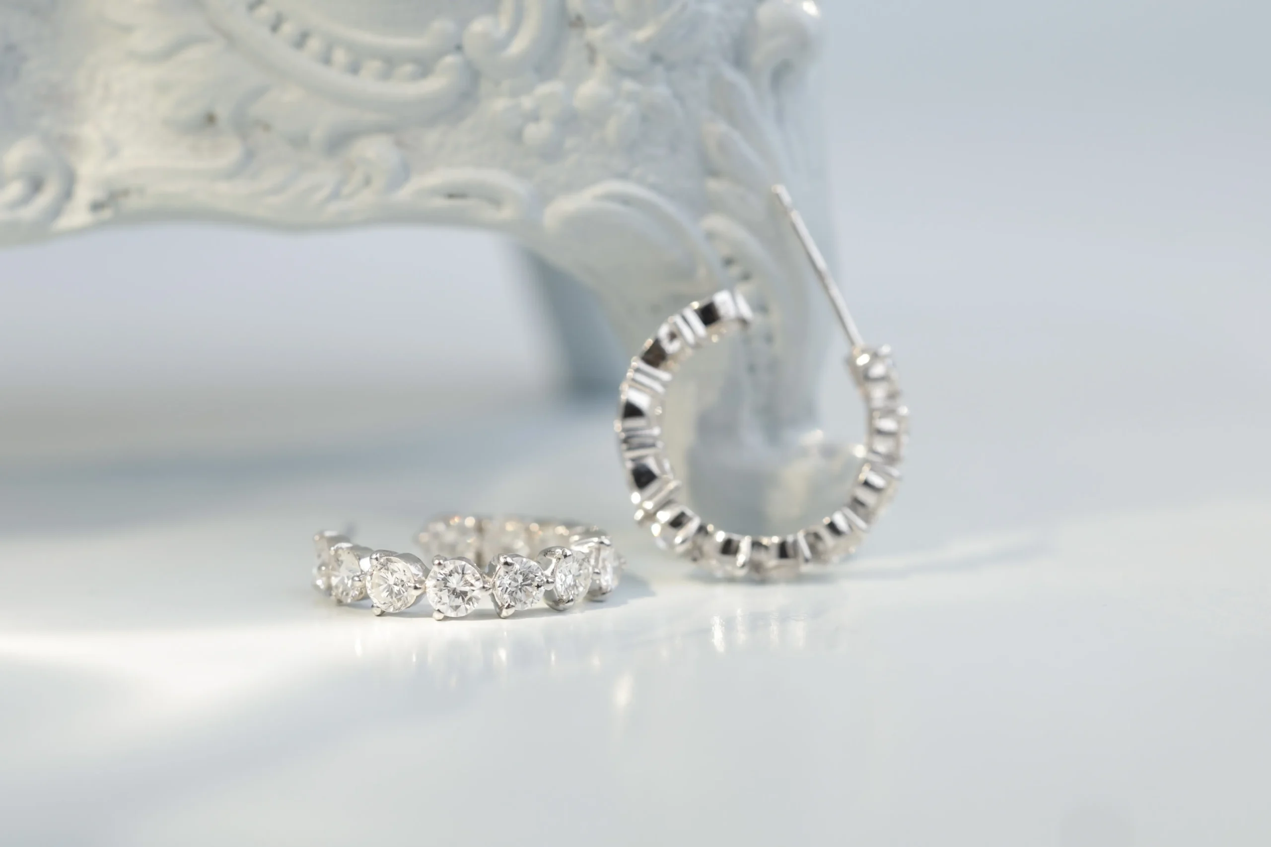 Серьги из золота с 22 бриллиантами в огранке «круглая» весом 2,00 карат, цвет 4, чистота 5. Диаметр 1,6 см.