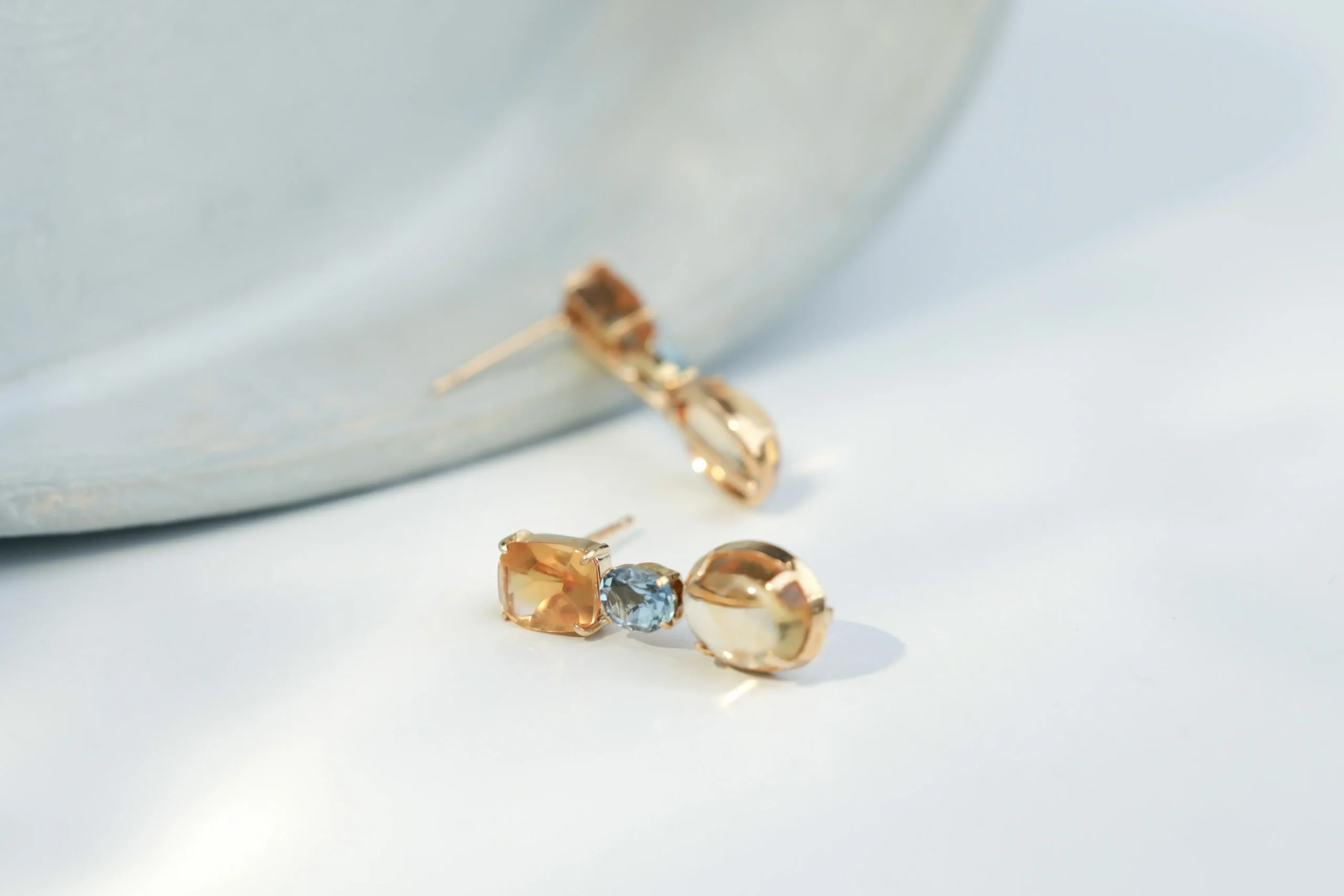 Серьги из золота с топазом и цитрином. Размер 0,7×2,2 см.
