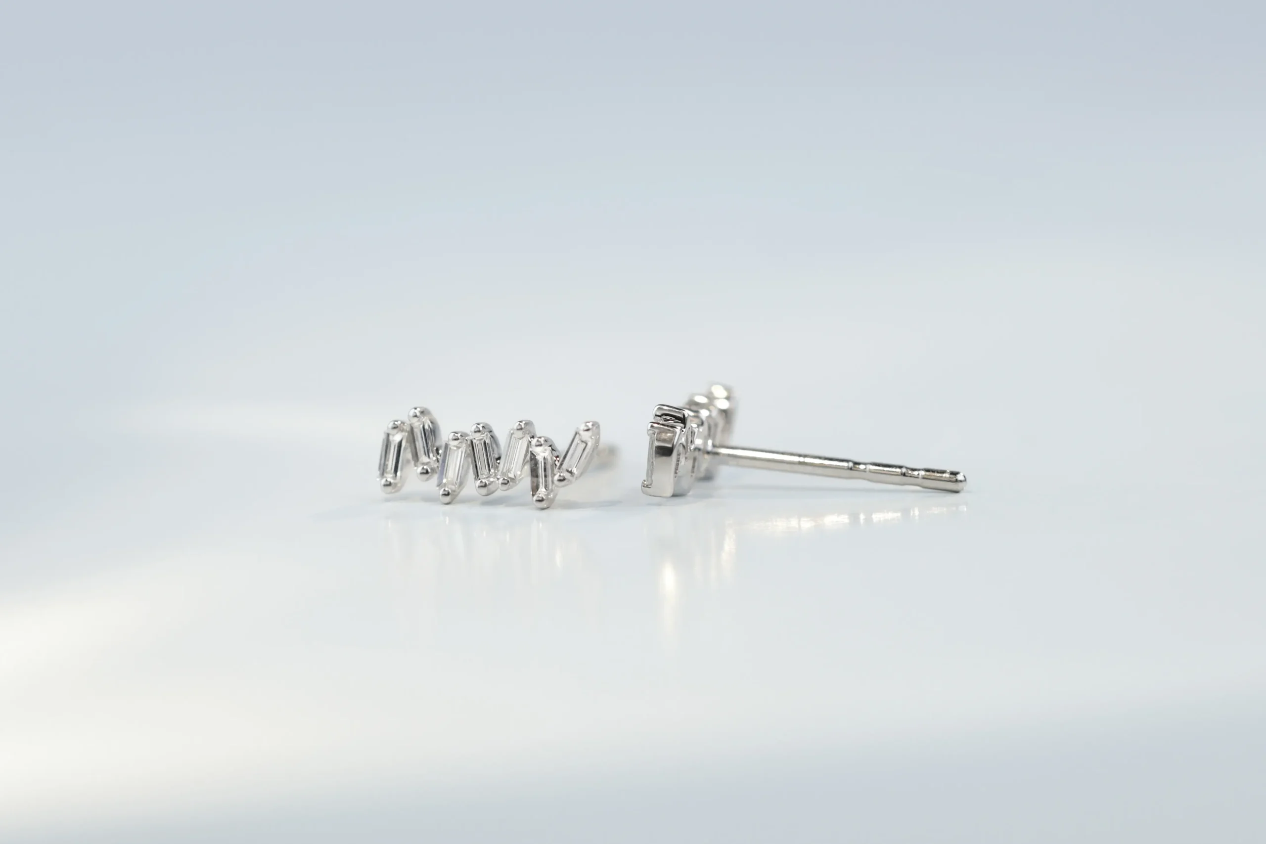 Серьги тз золота с 14 бриллиантами в огранке «багет» весом 0,18 карат, цвет 4, чистота 5. Размер 1×0,4 см.