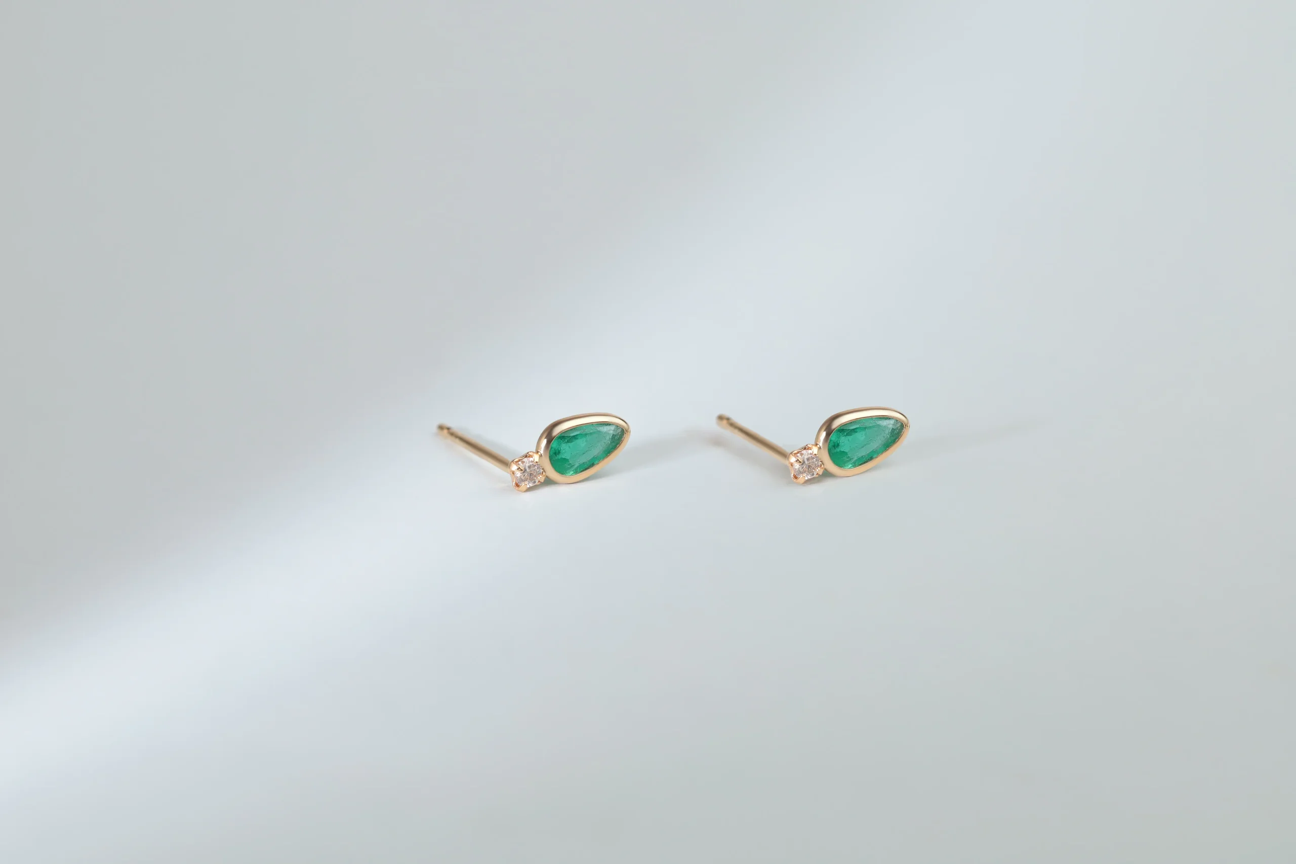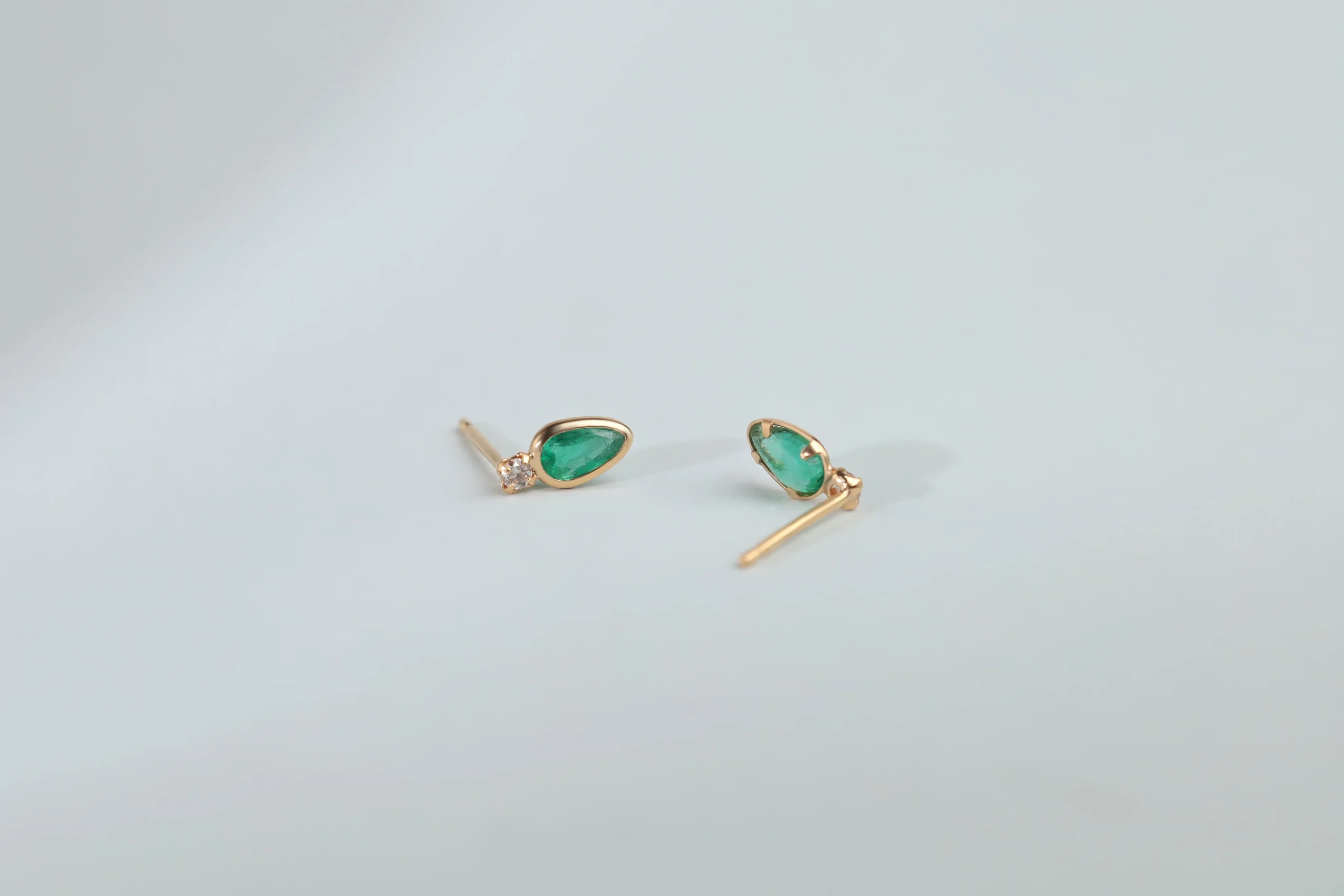 Серьги из золота с 2 бриллиантами в огранке «круглая» весом 0,04 карат, цвет 4, чистота 5; 2 изумрудами в огранке «груша» весом 0,36 карат, цвет 2, чистота 3.