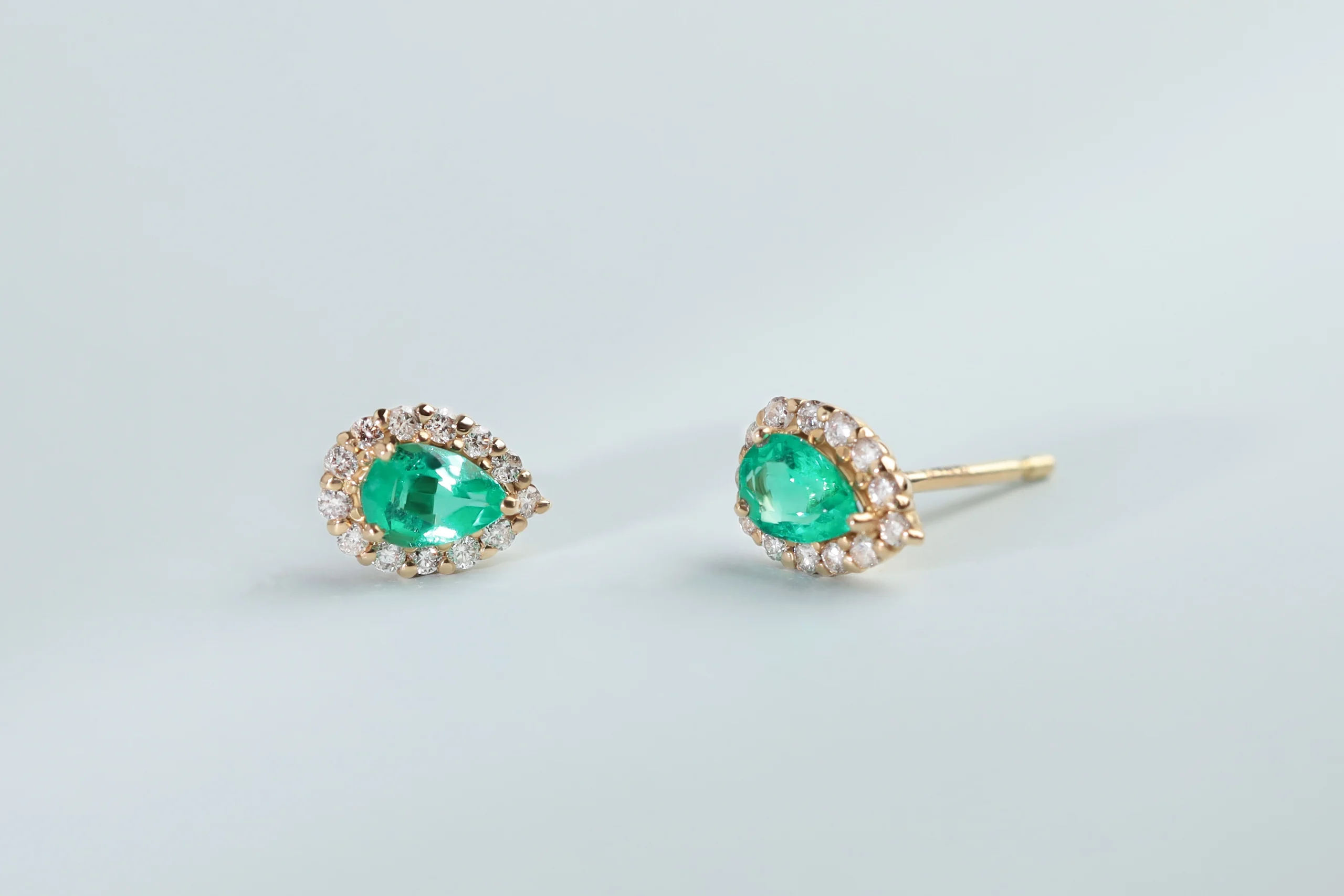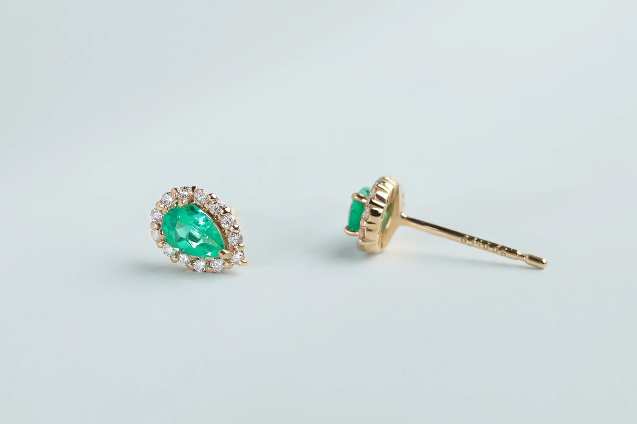Серьги из золота с 2 изумрудами весом 0,13 карат, цвет 3, чистота 3; 26 бриллиантами в огранке «круглая» весом 0,06 карат, цвет 3, чистота 4. Размер изделия 7 x 5 мм.
