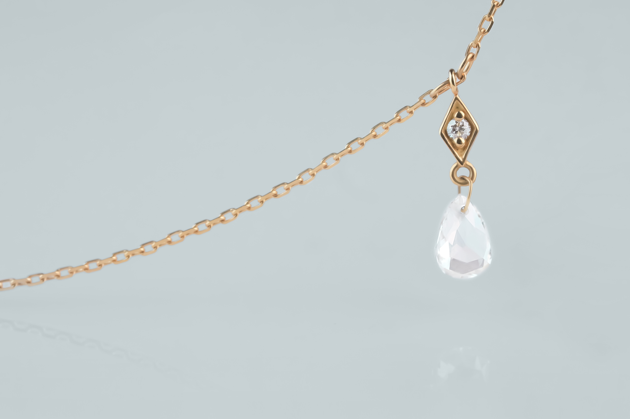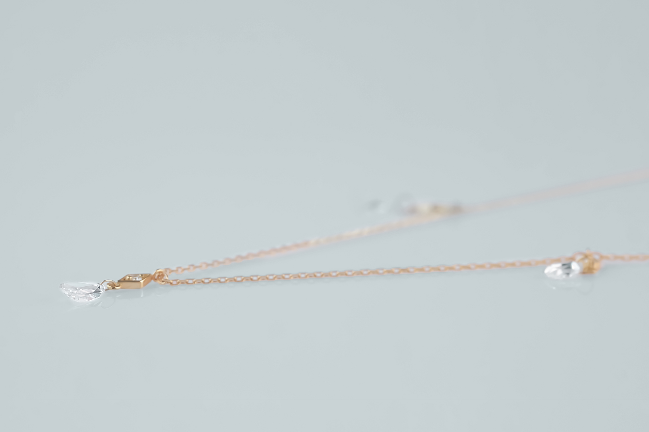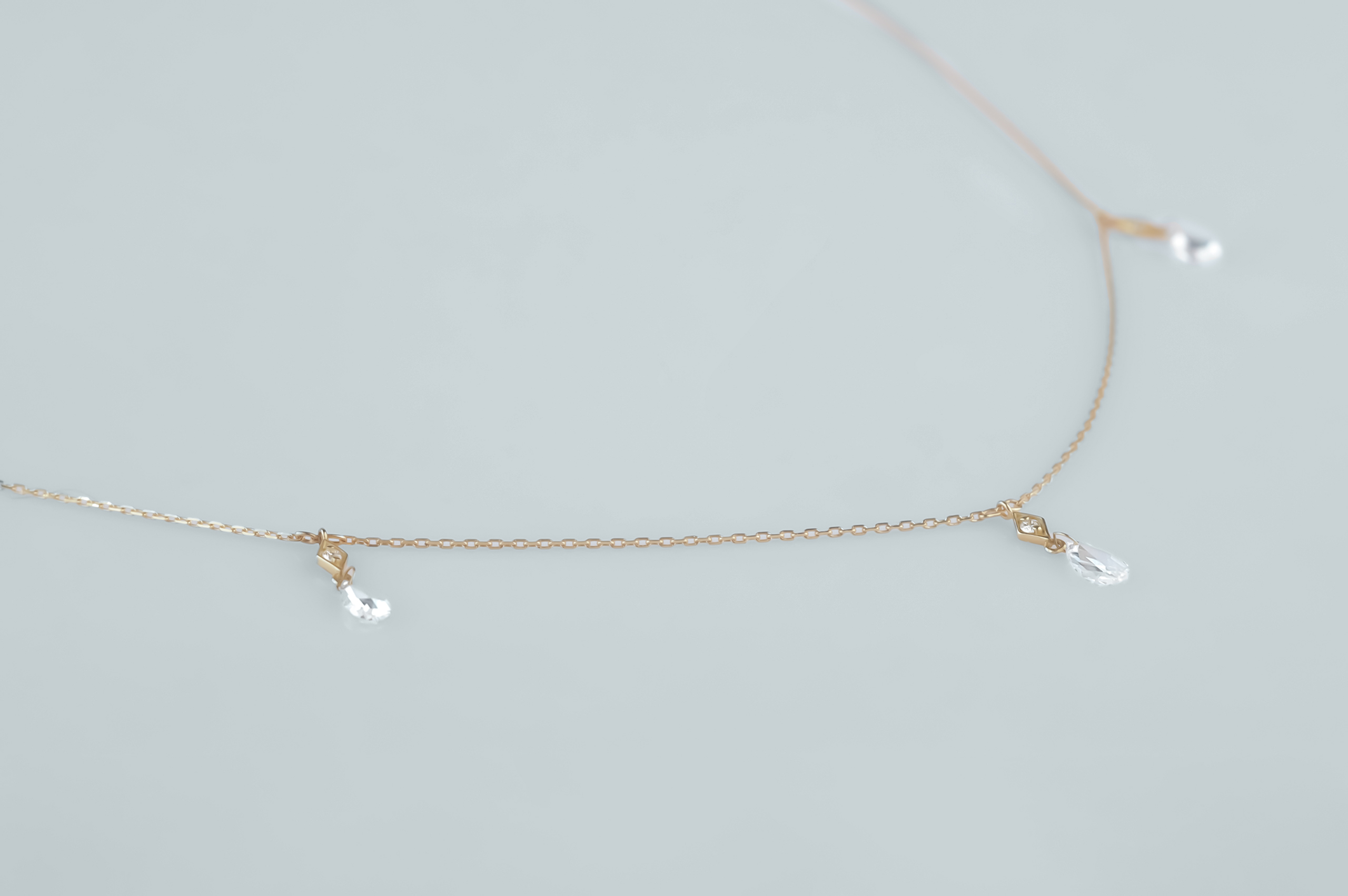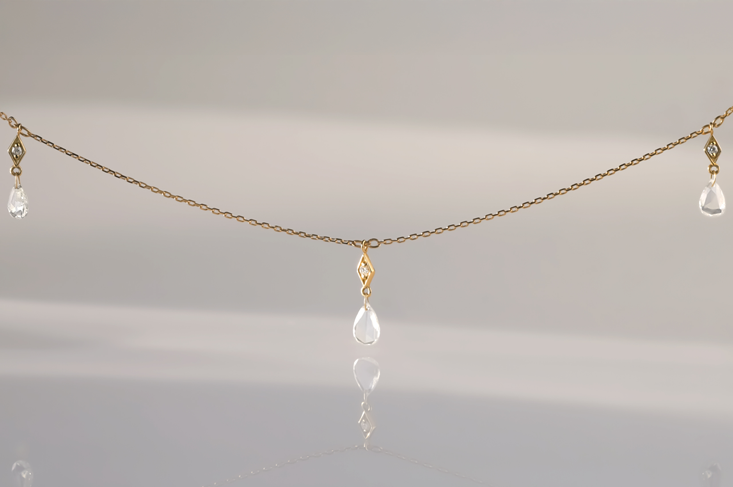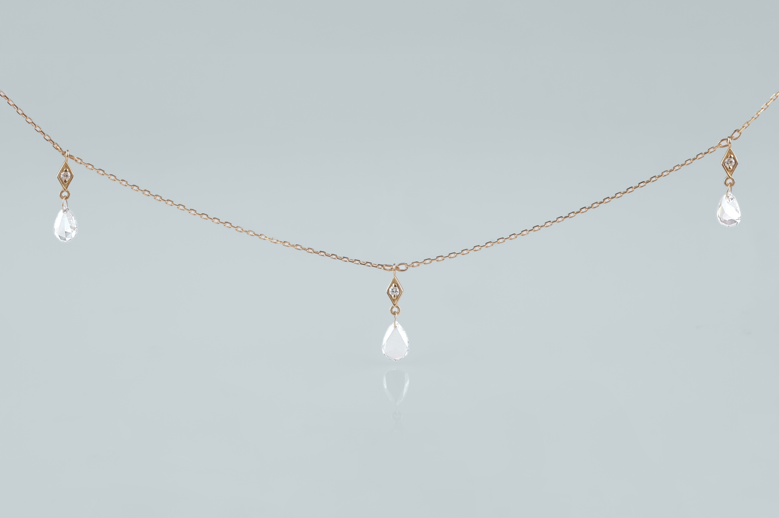 Колье из золота с 3 бриллиантами в огранке «груша» весом 0,35 карат, цвет 4, чистота 5; 3 бриллиантами в огранке «круглая» весом 0,10 карат, цвет 4, чистота 5.